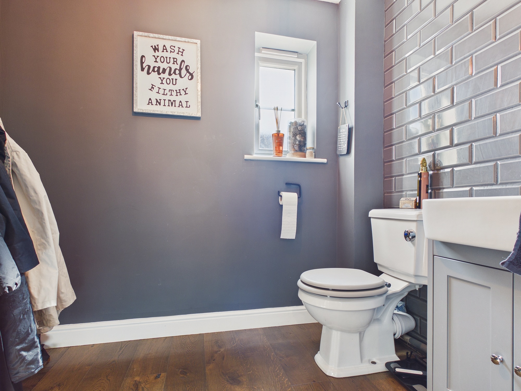 uPVC double glazed window to front, wall mounted upright radiator, w.c., handwash basin inset to vanity unit, engineered oak flooring, partly tiled walls.