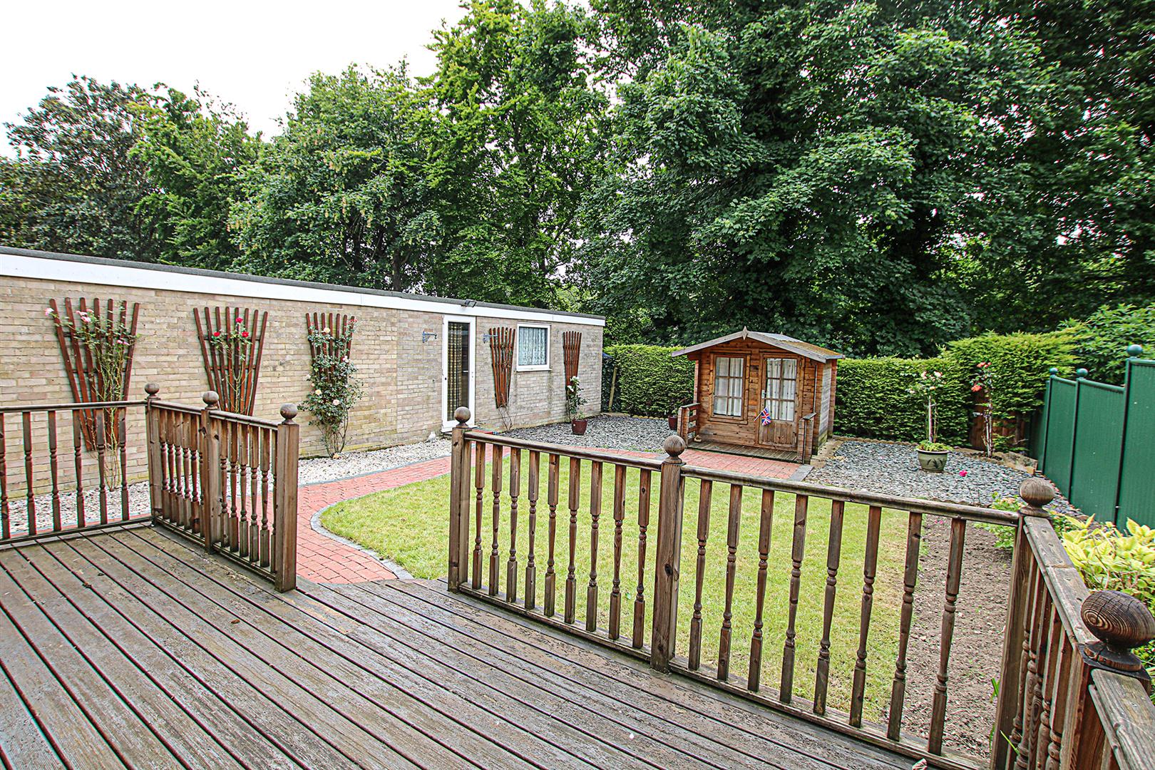Fully enclosed rear garden with area laid to lawn, raised decked area with timber balustrades, areas laid to stone, block paved pathways.