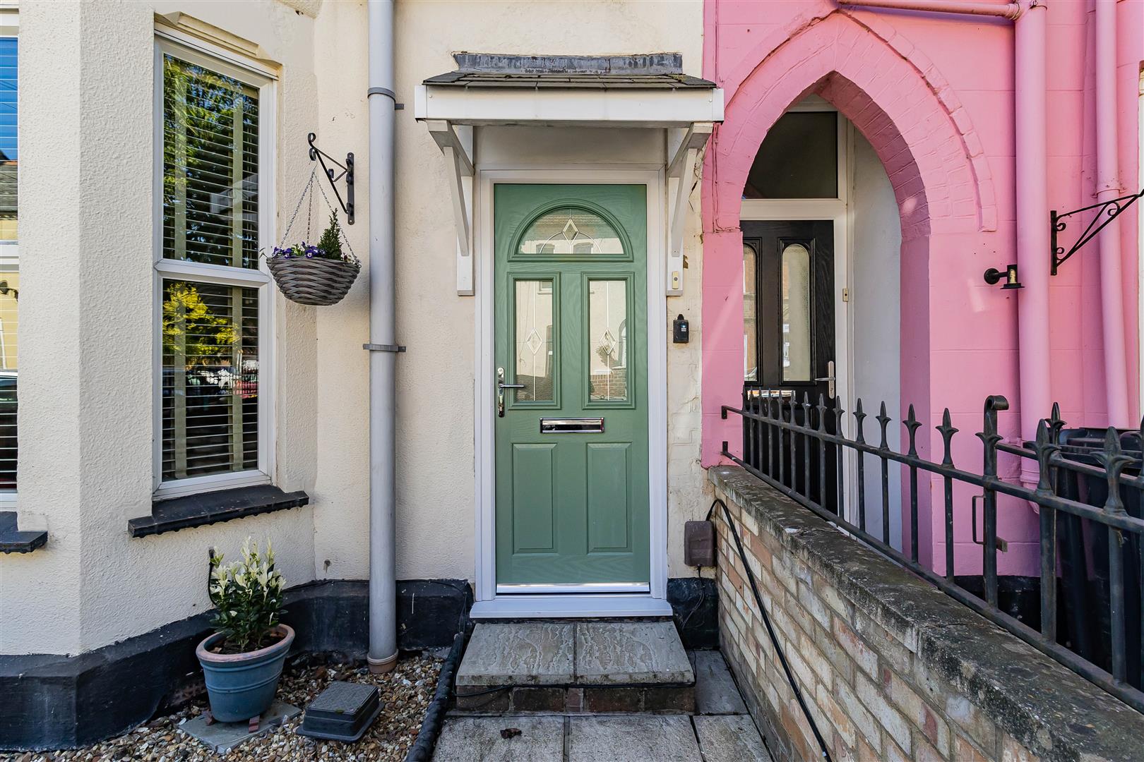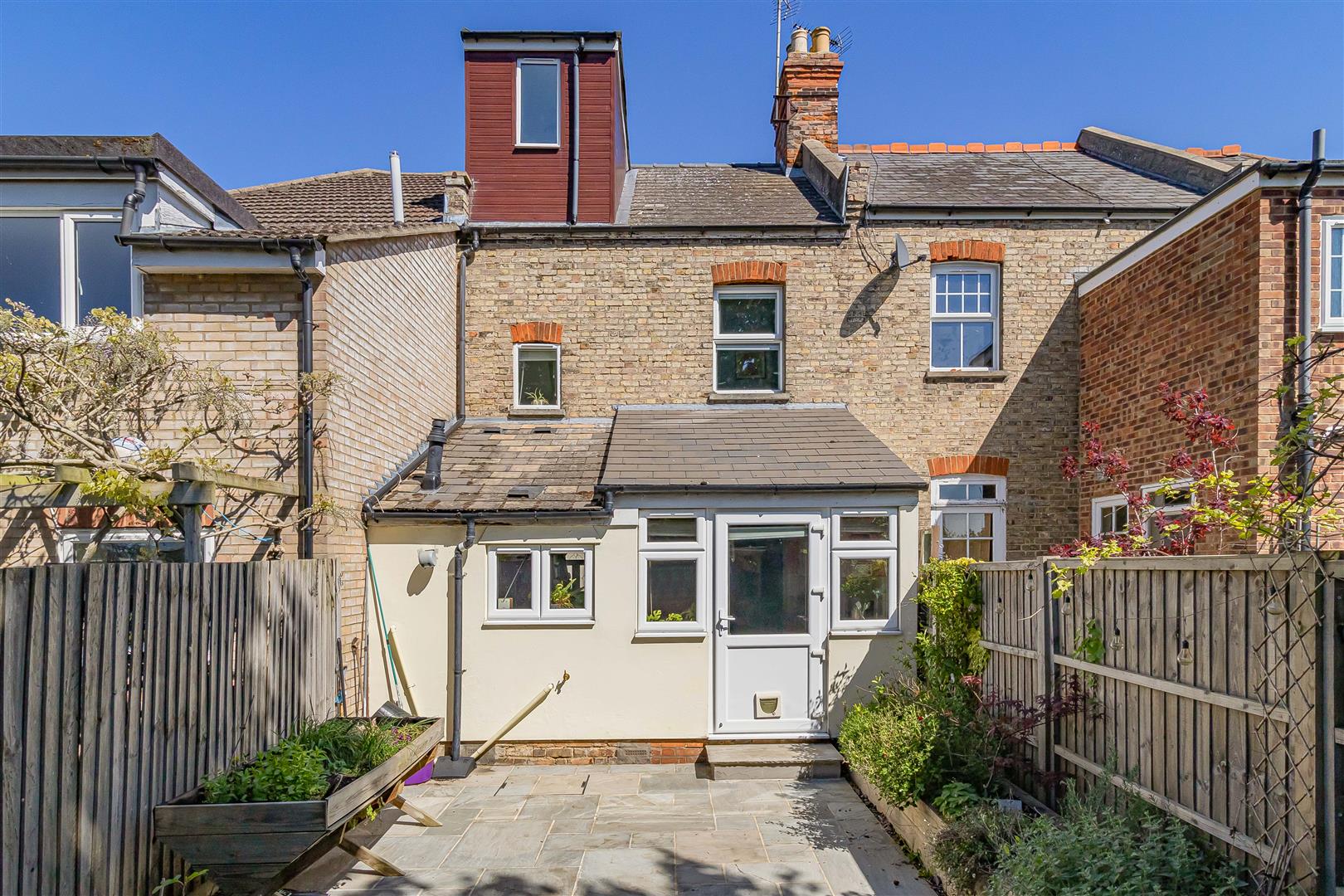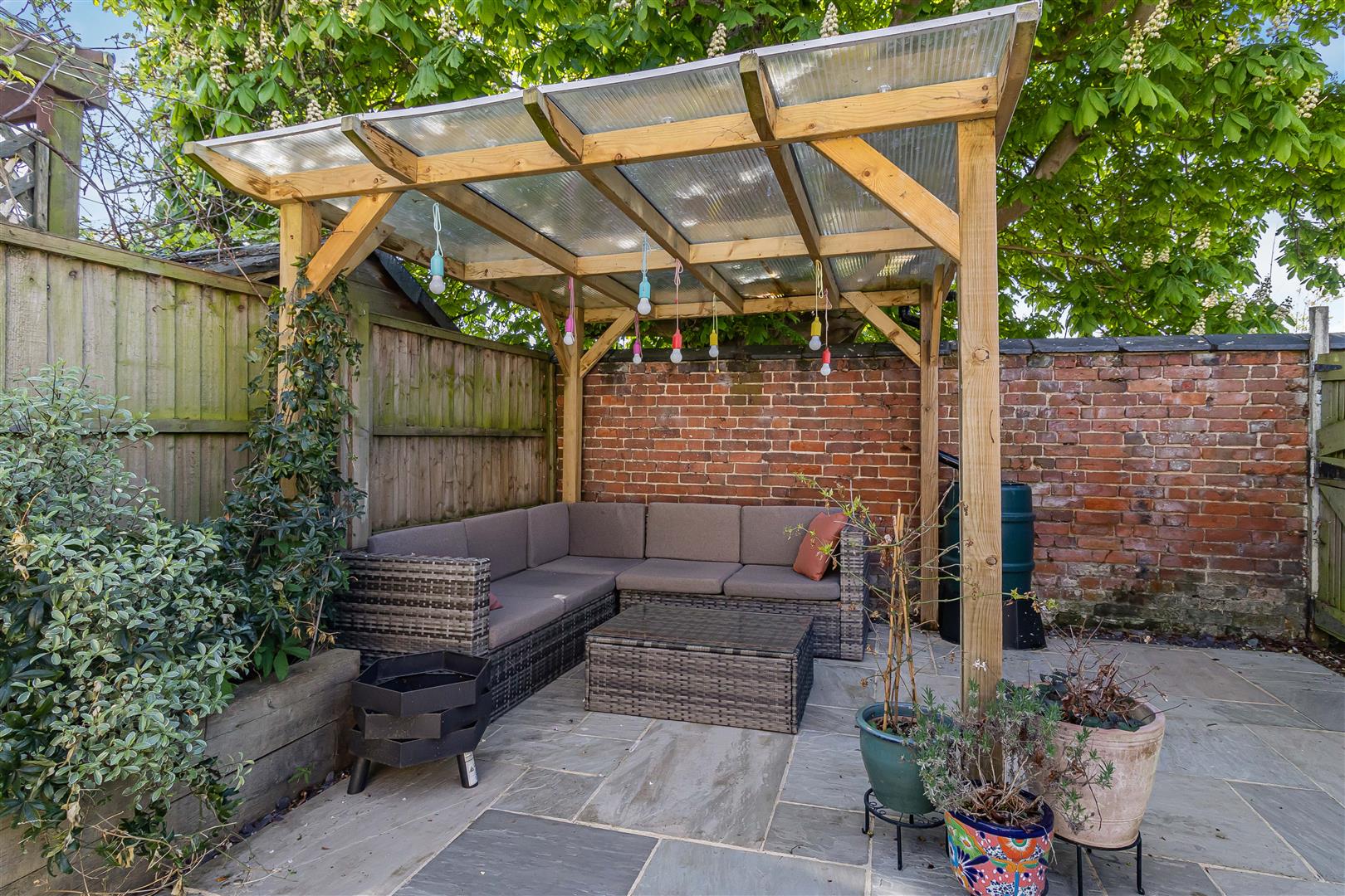 Delightful flagstone courtyard garden with raised sleeper beds with a variety of attractive flower and shrub planting. Pergola seating area to the rear. Access gate to the side. Half glazed door leading to the