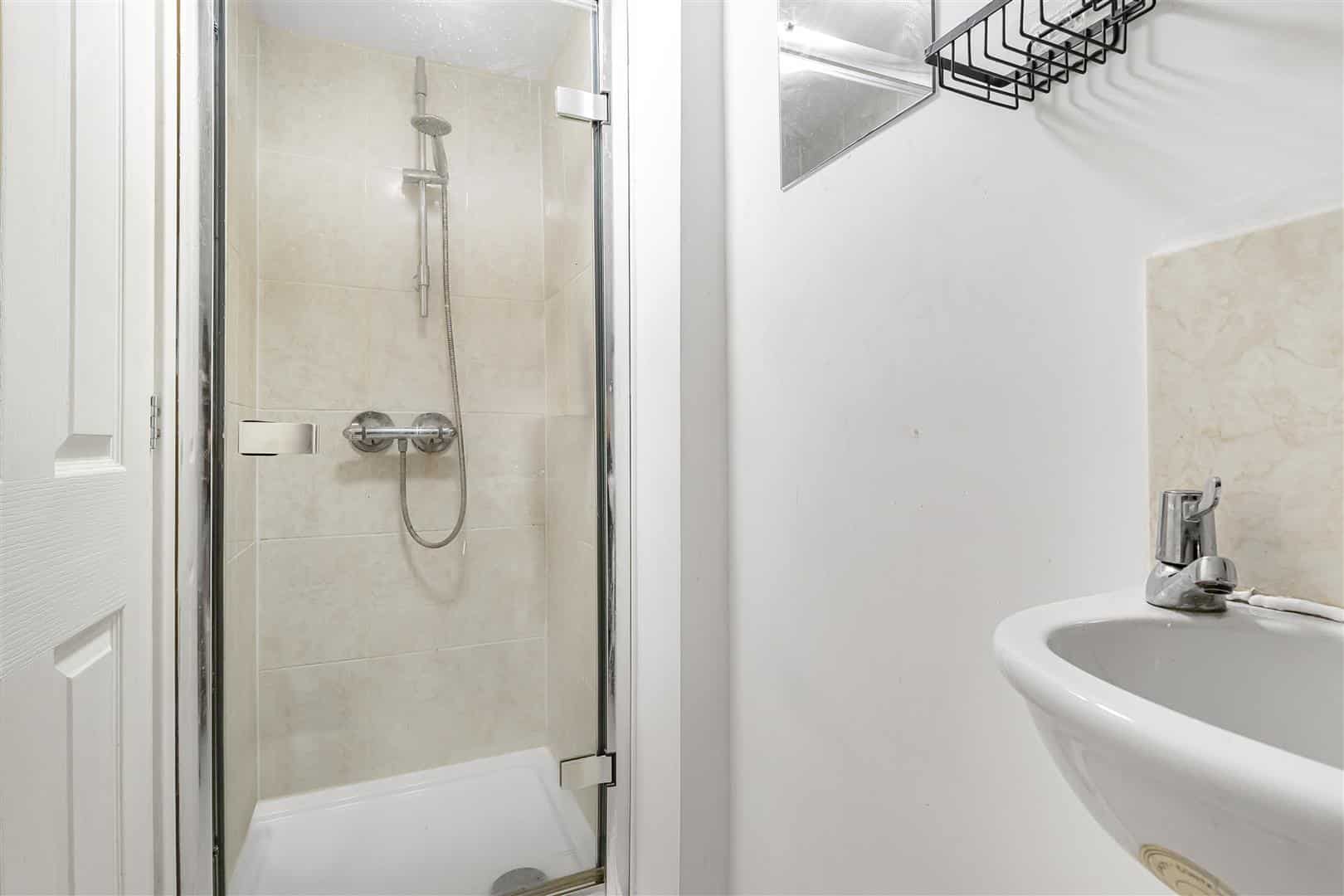 White suite comprising low level WC, handbasin and shower cubicle. Tiled to wet areas. Door leading to bedroom 3.