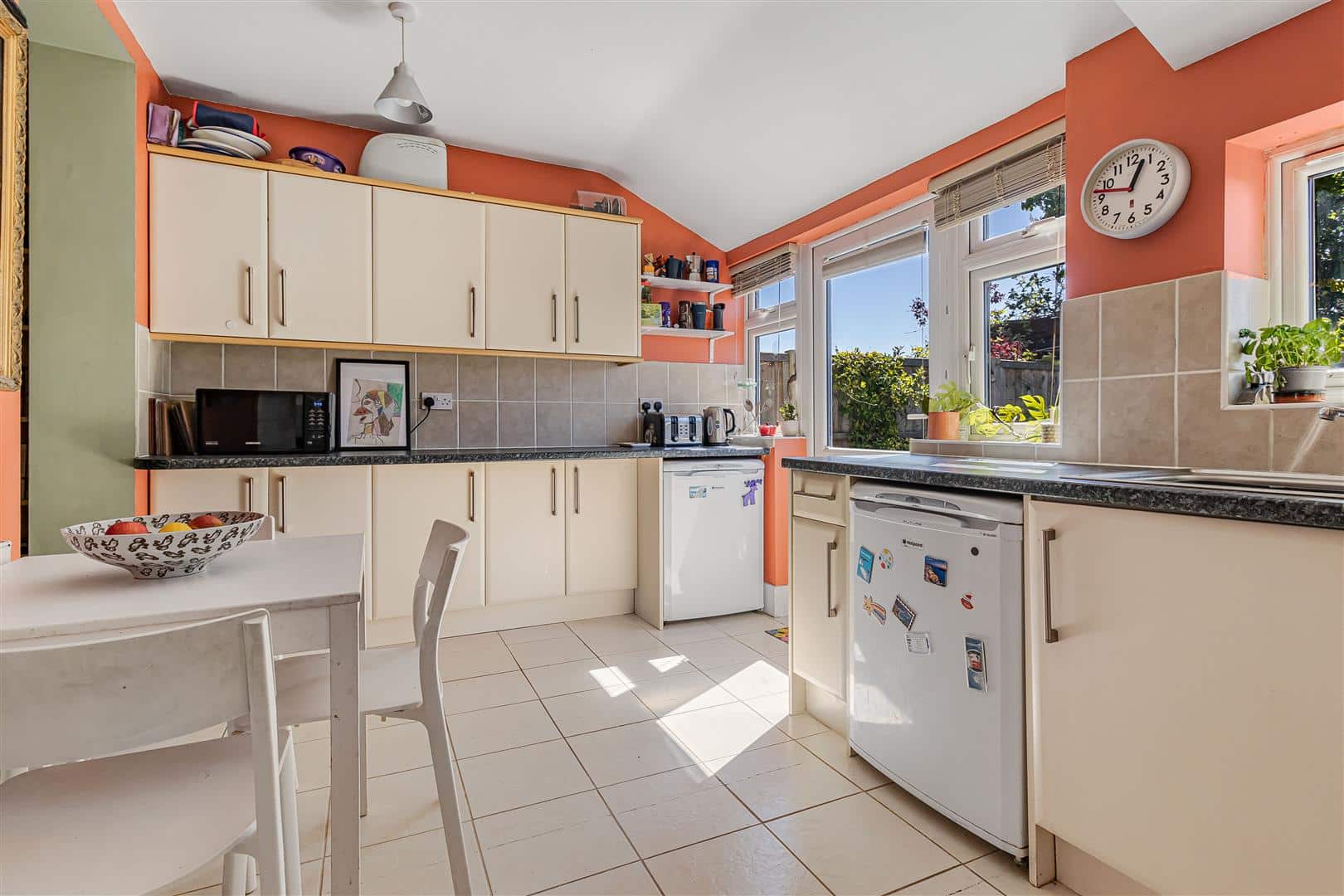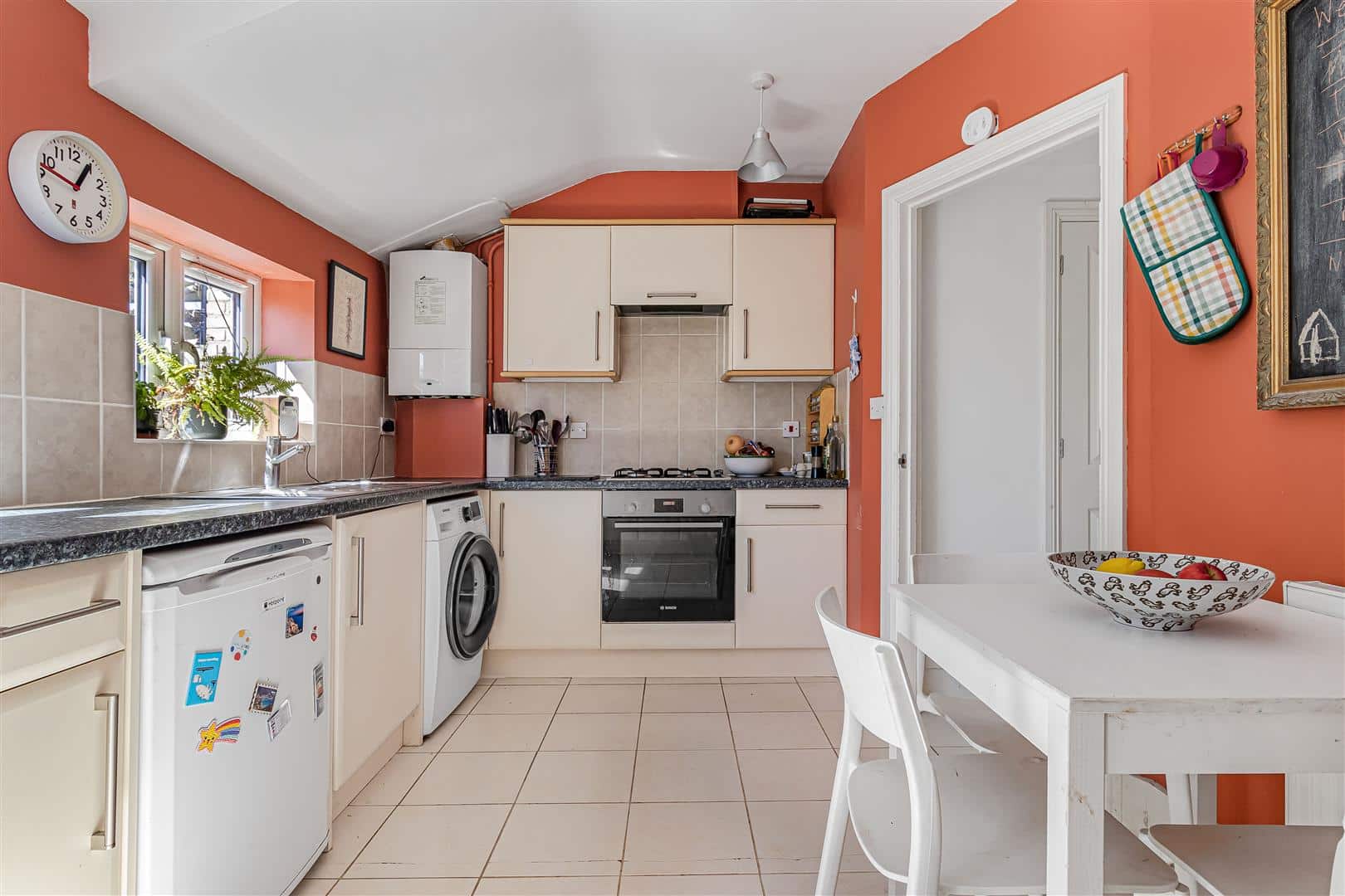 A modern range of eye and base level cupboards with worktop over. Integrated Bosch oven with gas hob and extractor above. Space and plumbing for washing machine. Space for undercounter fridge and freezer. Stainless steel sink and drainer with mixer tap over. Attractively tiled splashbacks. Tiled flooring. Windows to the rear aspect. Half glazed door leading to the rear garden. Opening to the dining room. Door leading to the entrance hall.