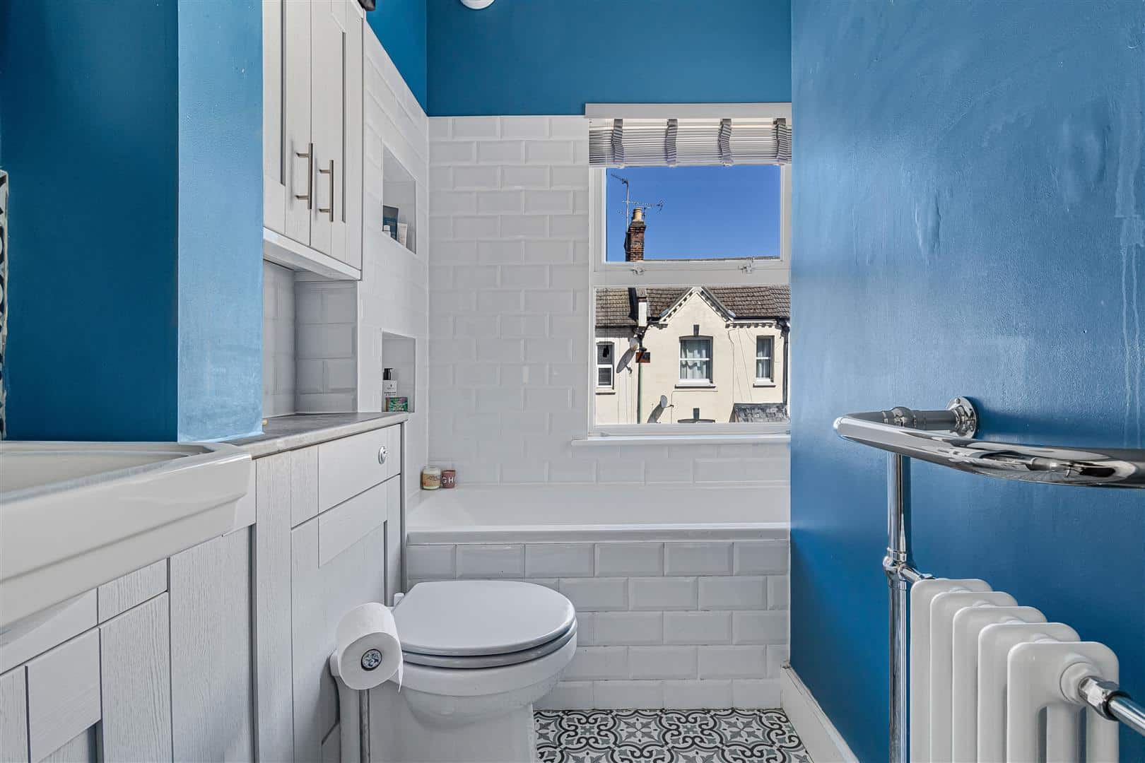 Stunning bathroom with modern white suite comprising of low level, concealed cistern, WC, inset handbasin, panelled bath and walk-in shower cubicle A range of built-in storage cupboards with a counter top and alcove storage. Attractively tiled. Period style radiator with towel rail over. Window to the front aspect. Door to the landing.