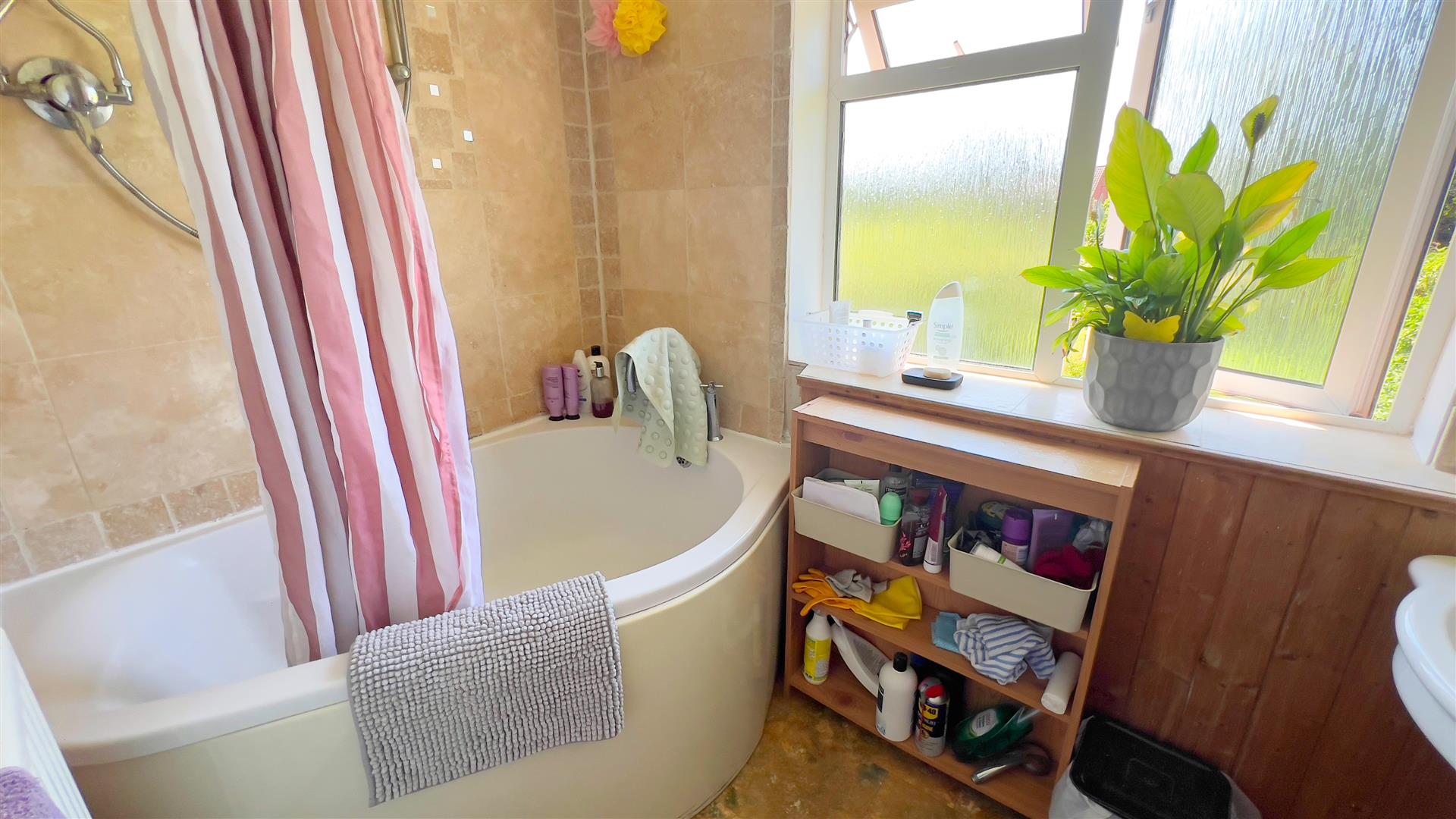 Comprising of a white 2 piece suite,hand basin and shower over corner bath.