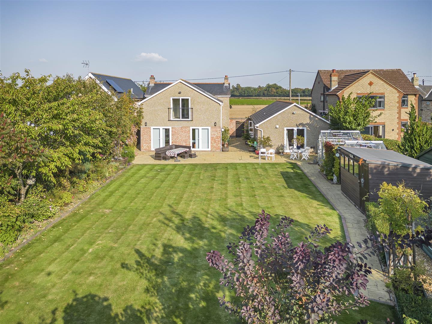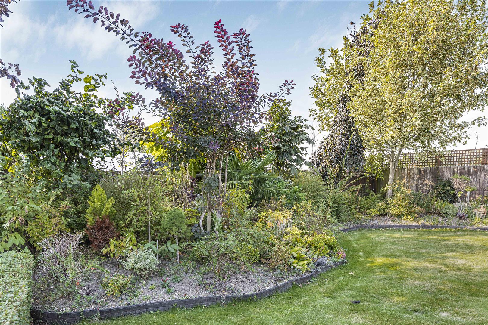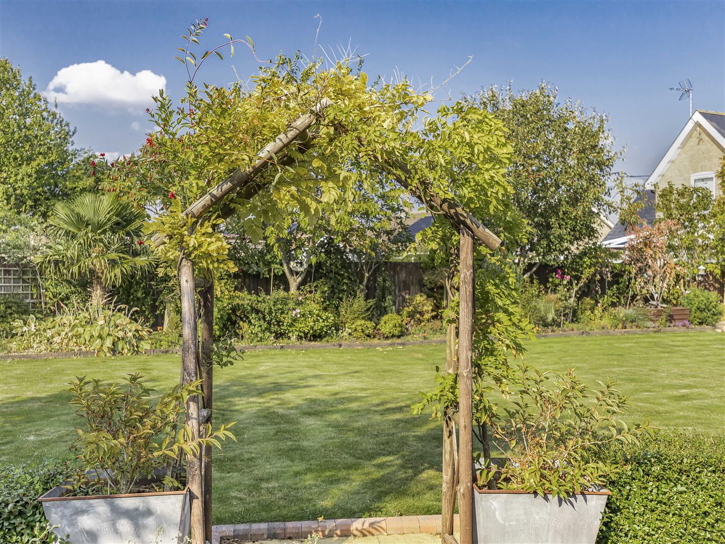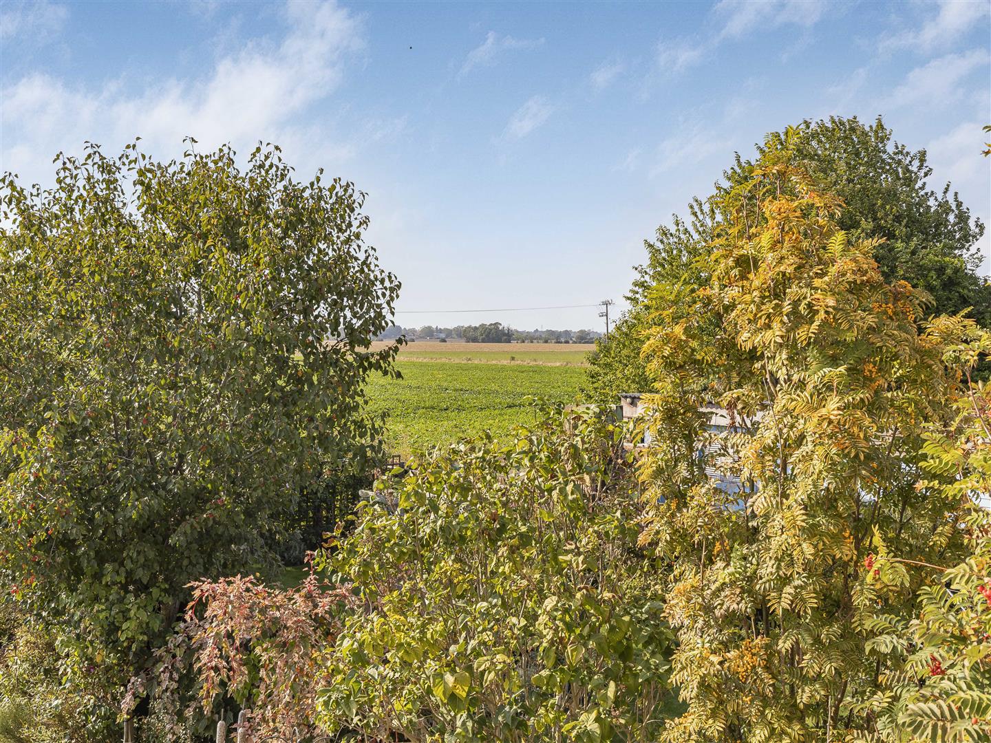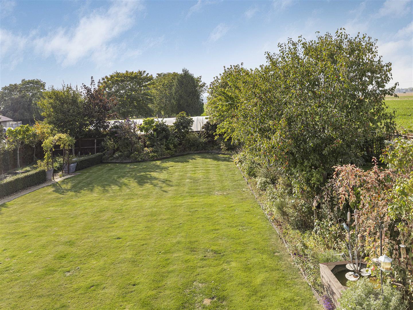 Beautifully presented rear garden thriving with a variety of vibrant trees. shrubs and flowers. Far stretching views overlooking open fields.