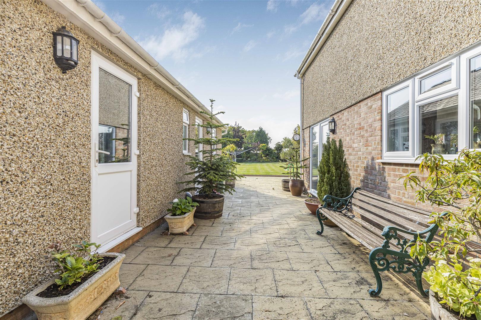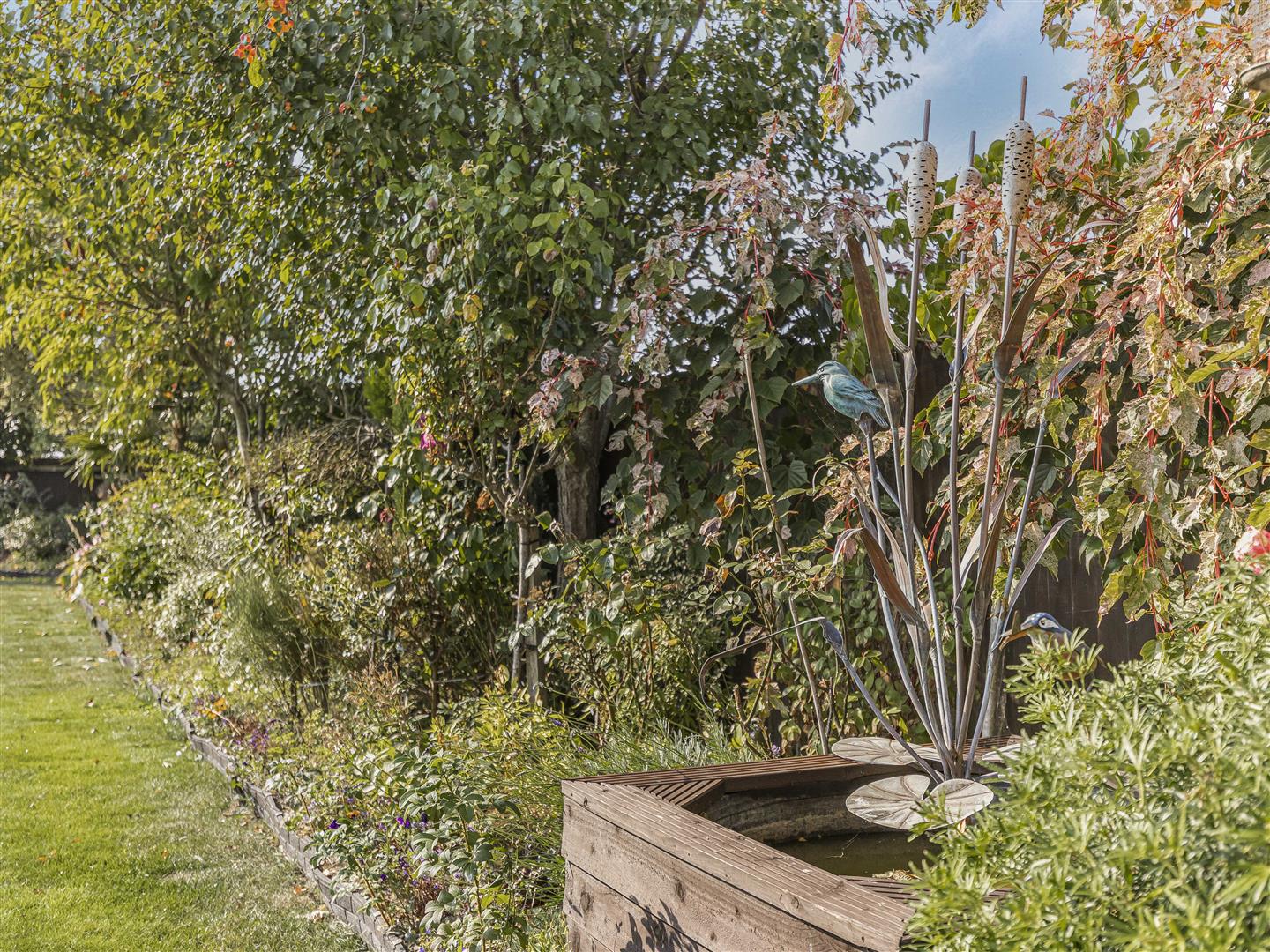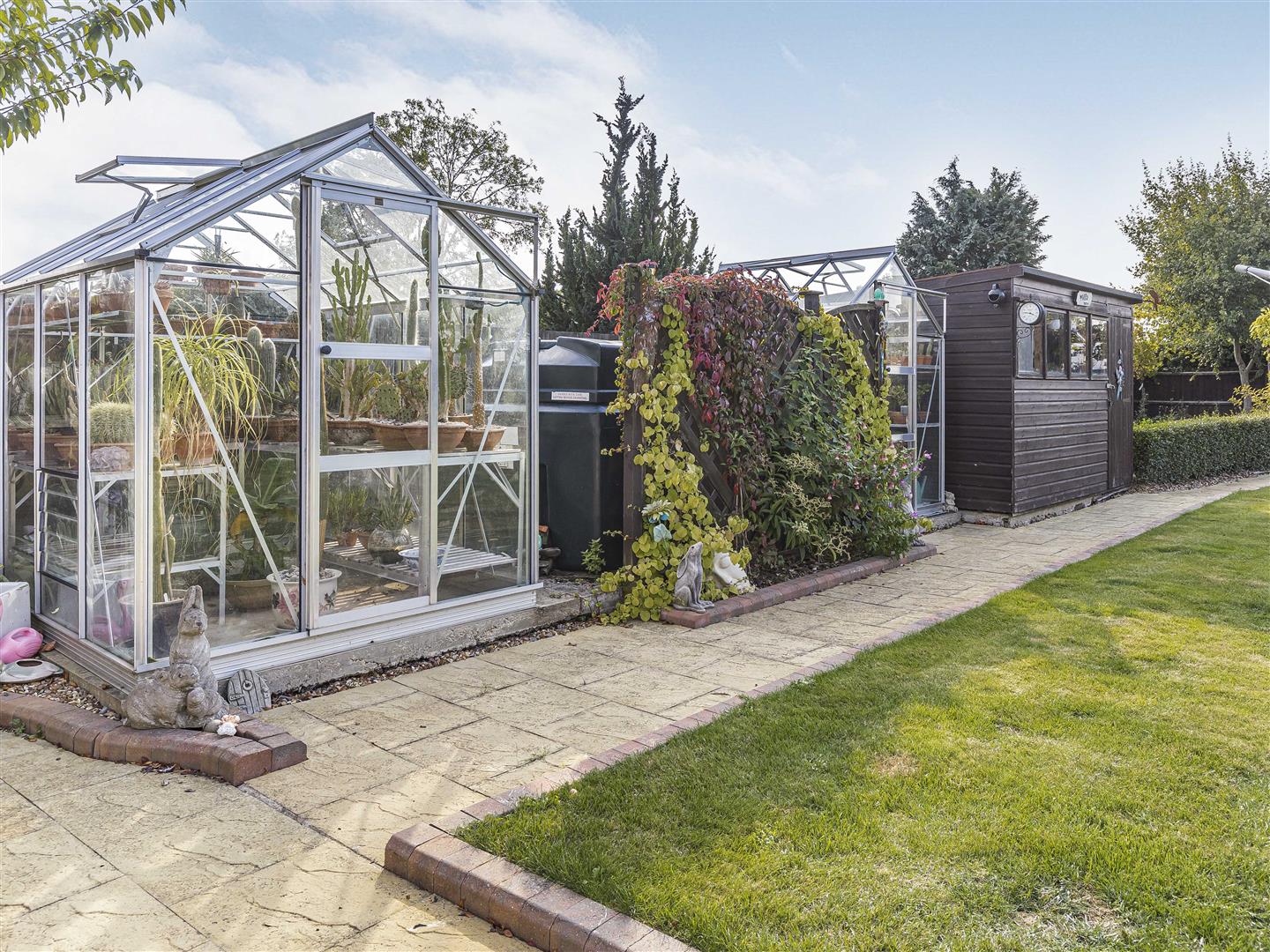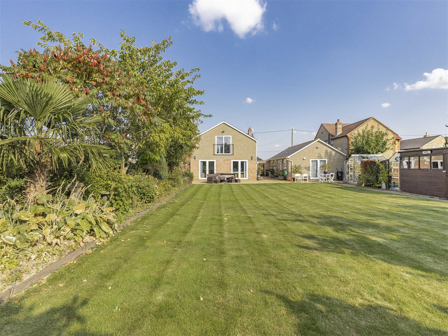 Beautifully presented rear garden thriving with a variety of vibrant trees. shrubs and flowers. Far stretching views overlooking open fields.