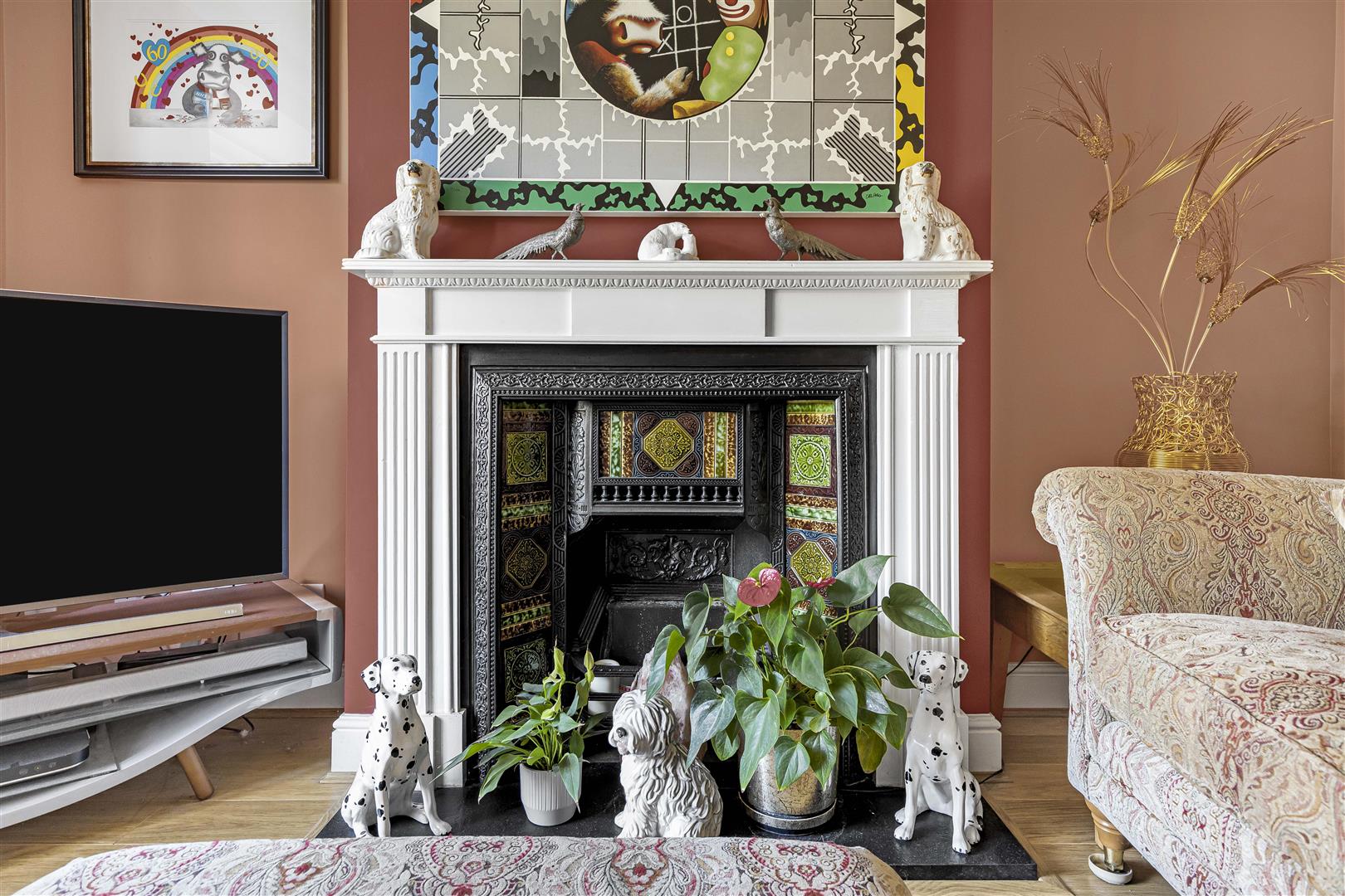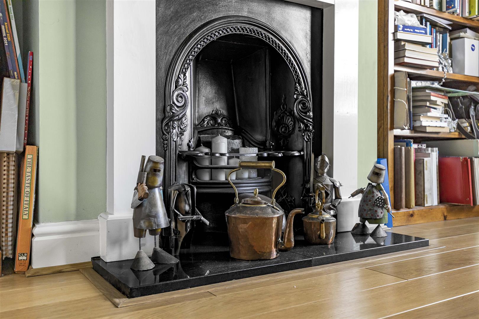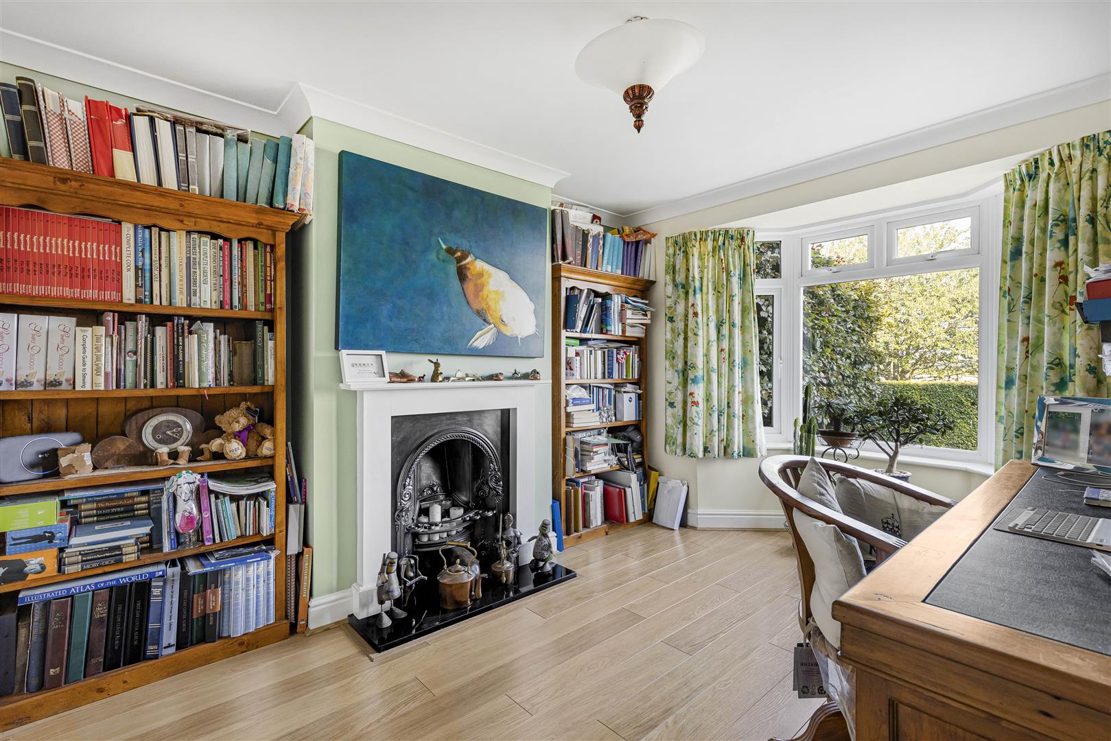 Featured cast iron fireplace, laid oak style flooring, radiator and bay fronted window.