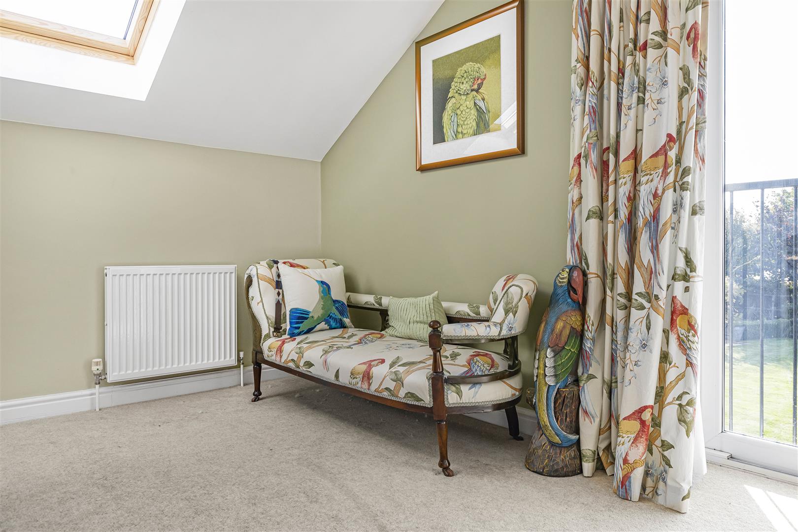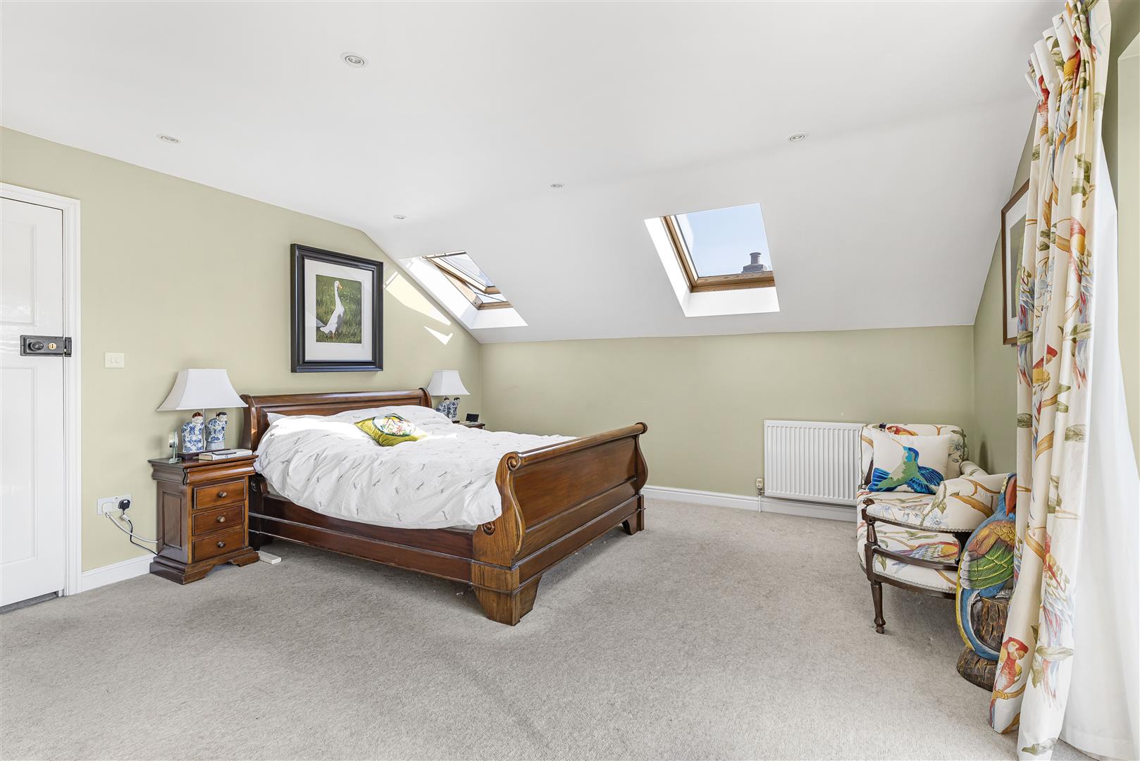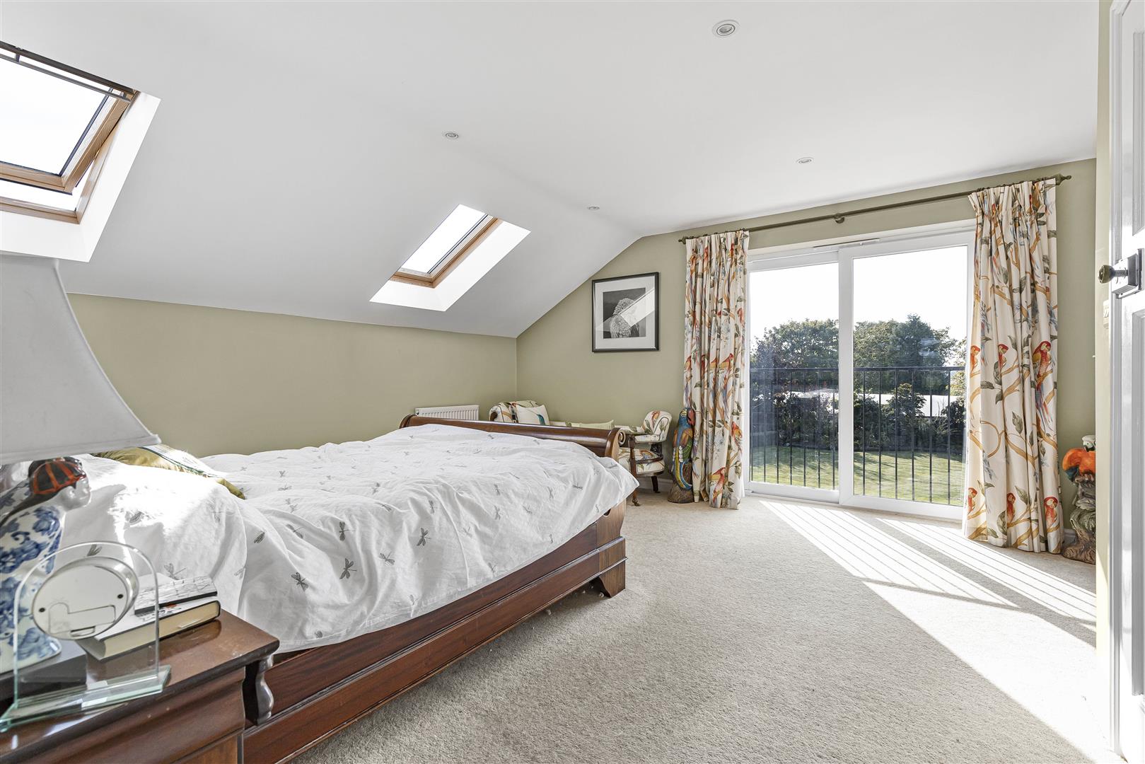 Generous sized master bedroom with three Velux windows, radiator, sliding doors out to the Juliet balcony that over looks the rear garden and door through to the: