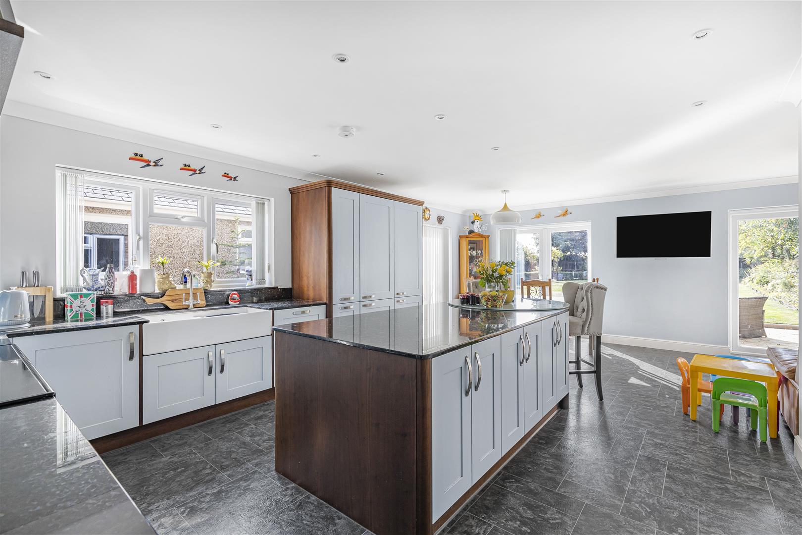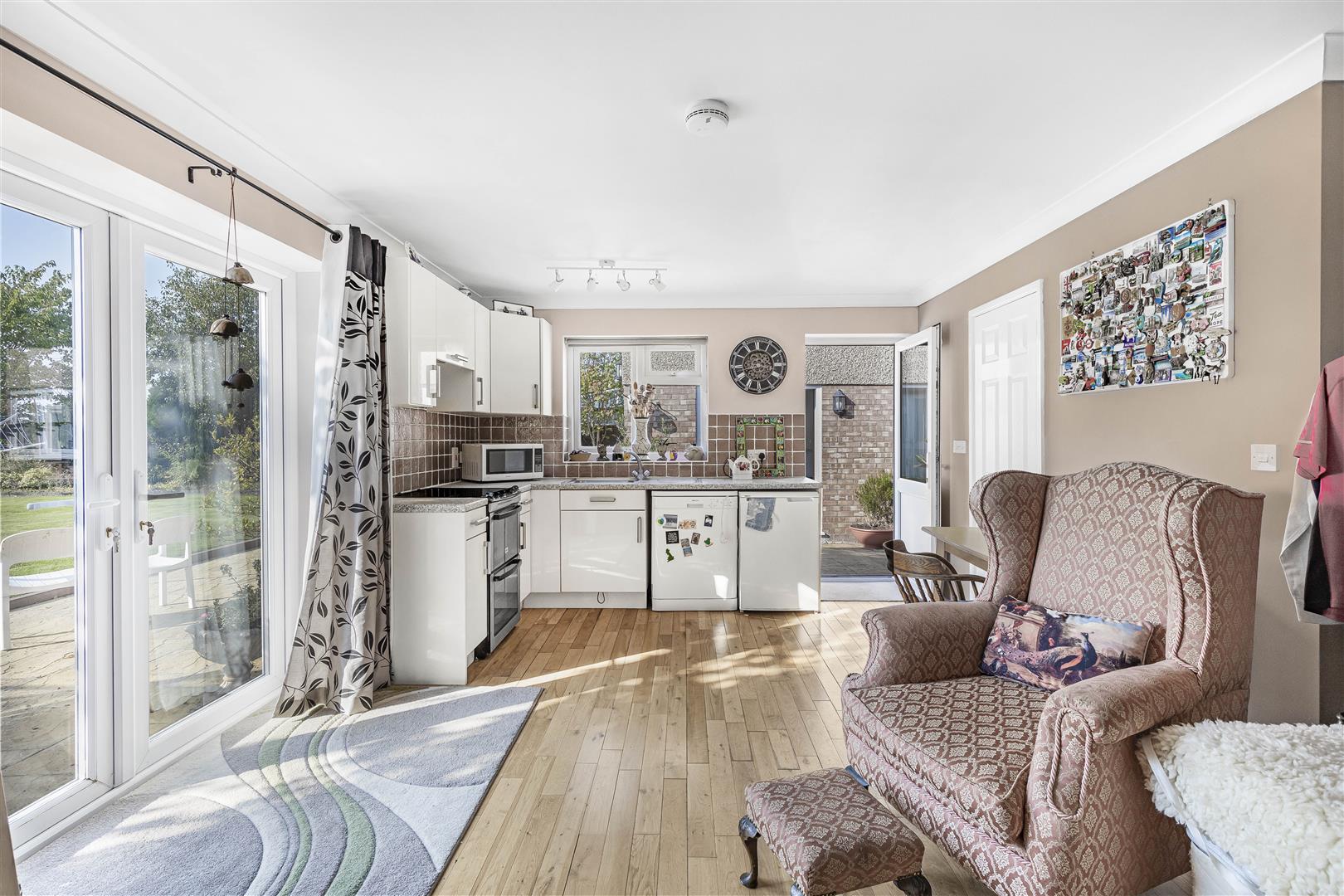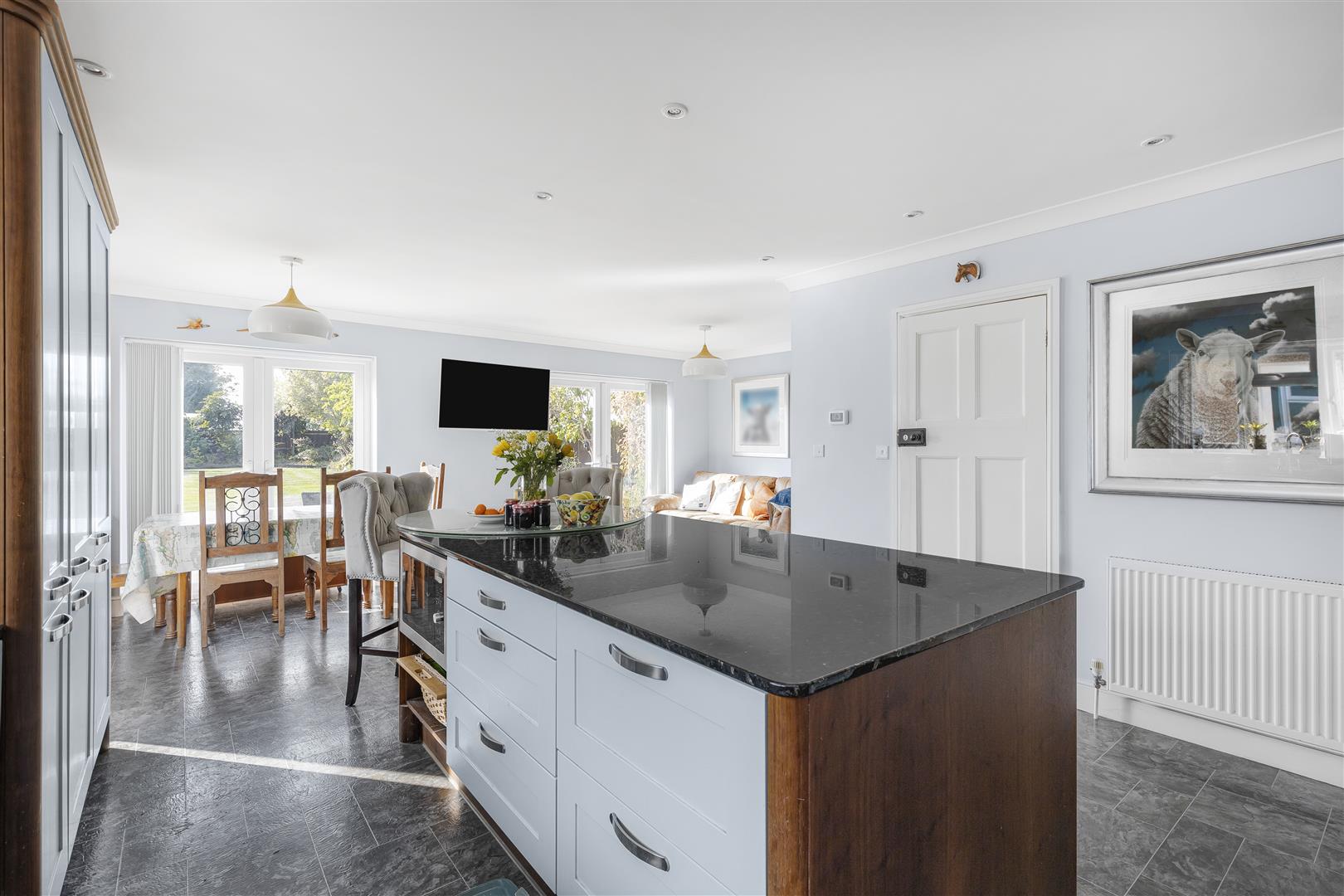Laid Karndean flooring, TV connection point, radiators and three sets of French doors out to the rear garden.
