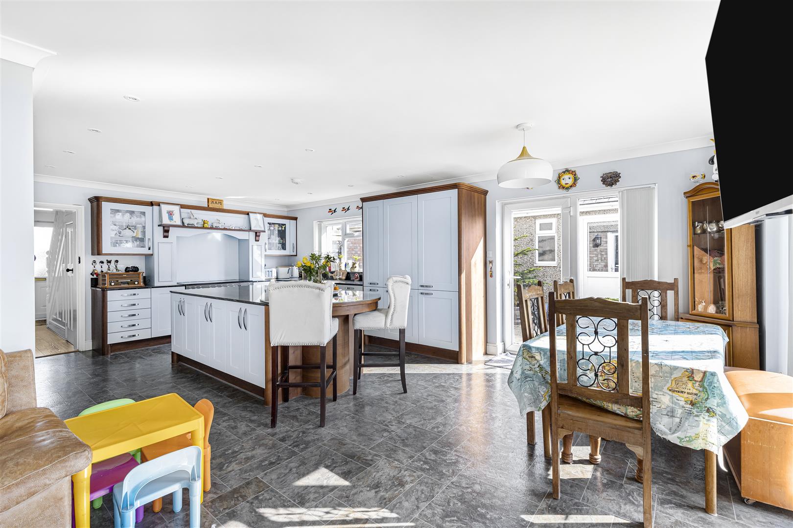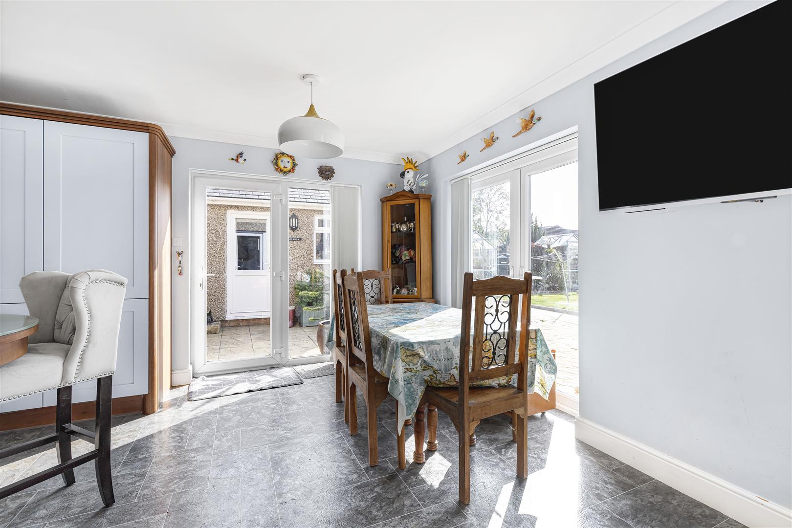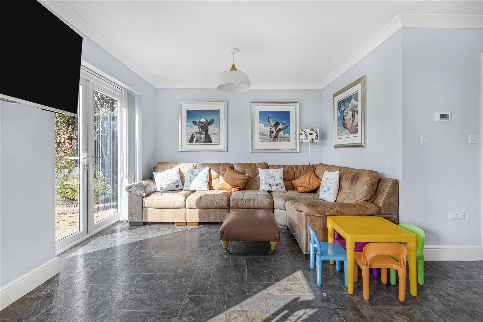 Laid Karndean flooring, TV connection point, radiators and three sets of French doors out to the rear garden.