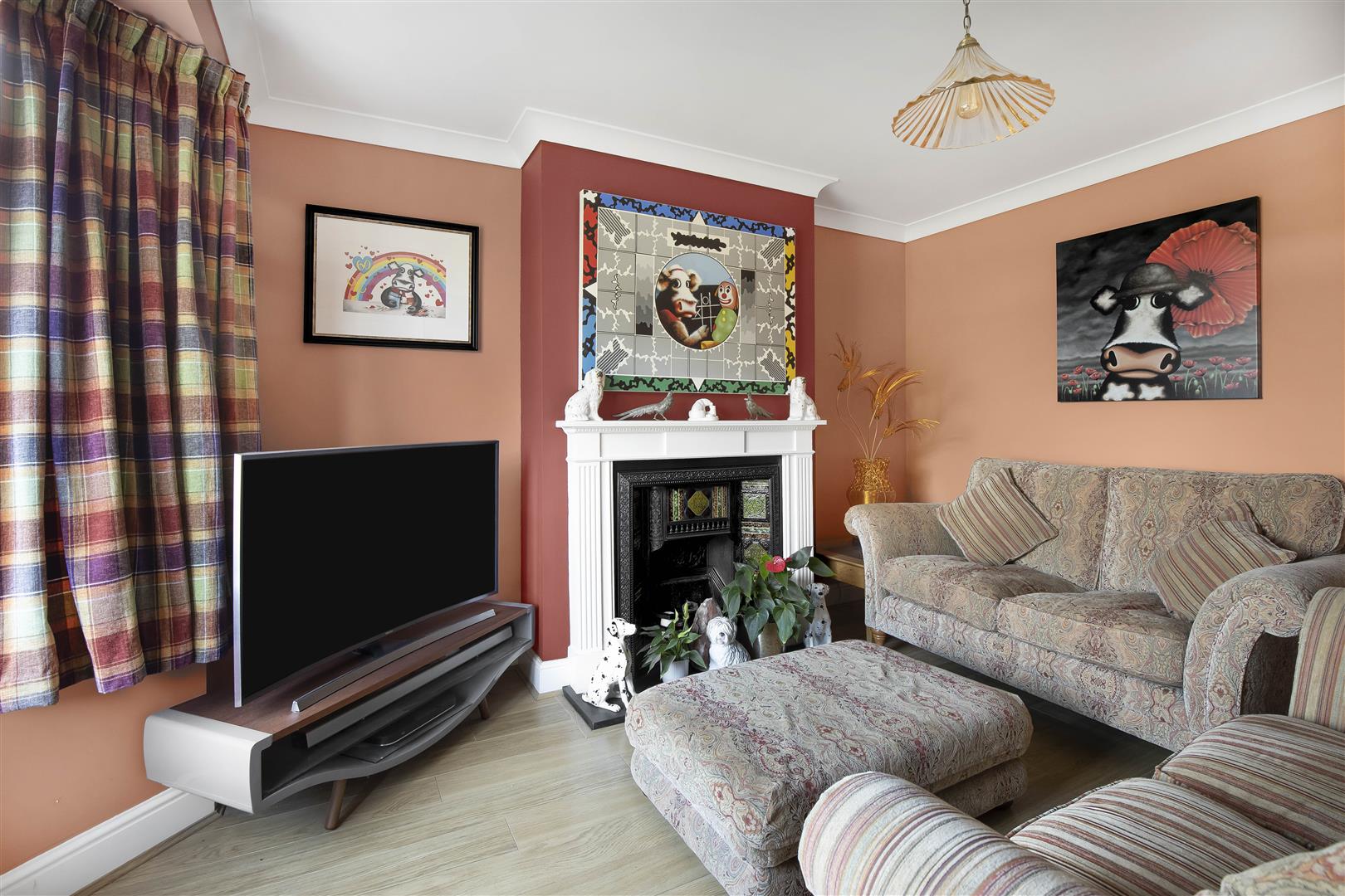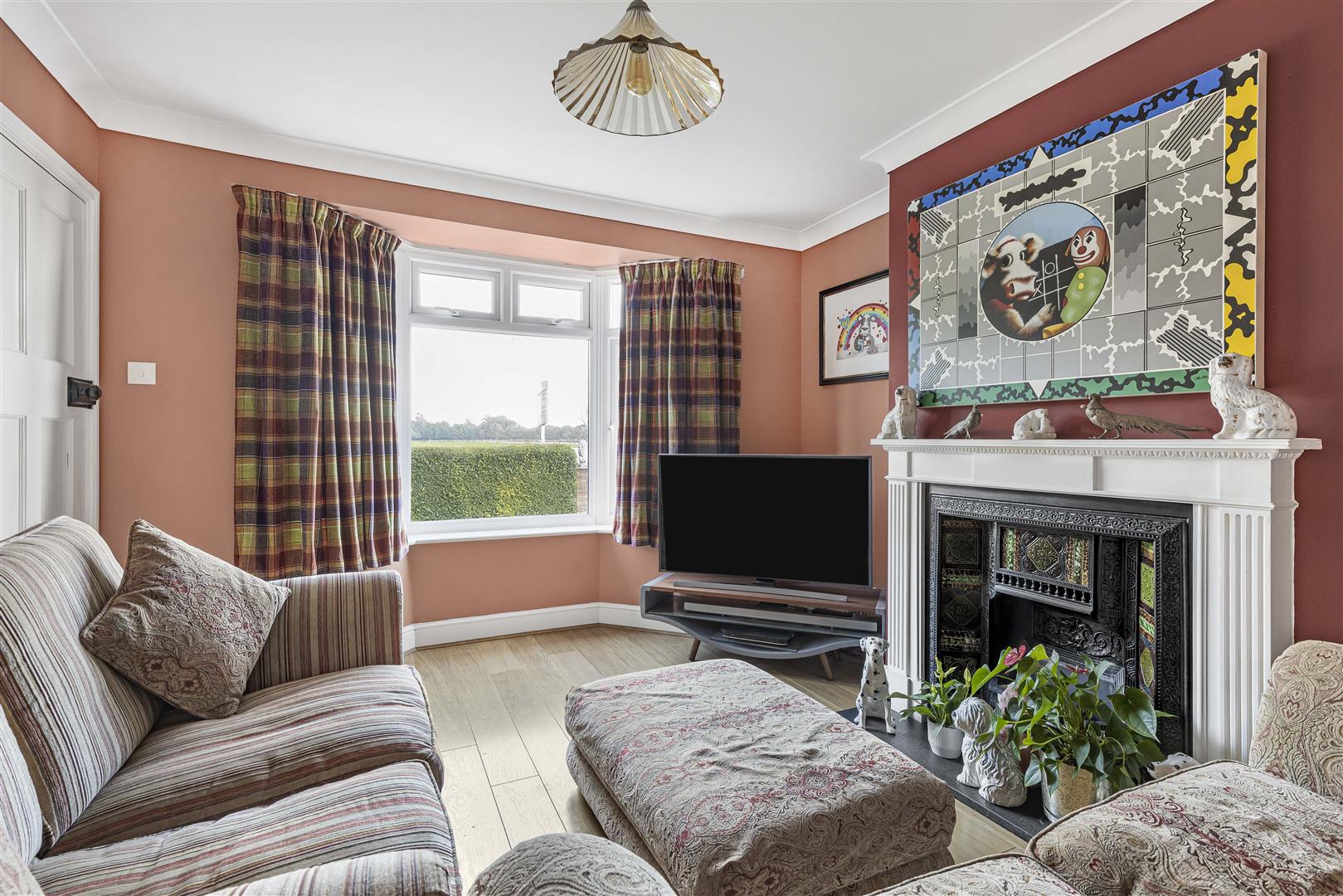 Cosy siting room with featured cast iron fireplace, TV connection point, laid oak style flooring, radiator and bay fronted window.