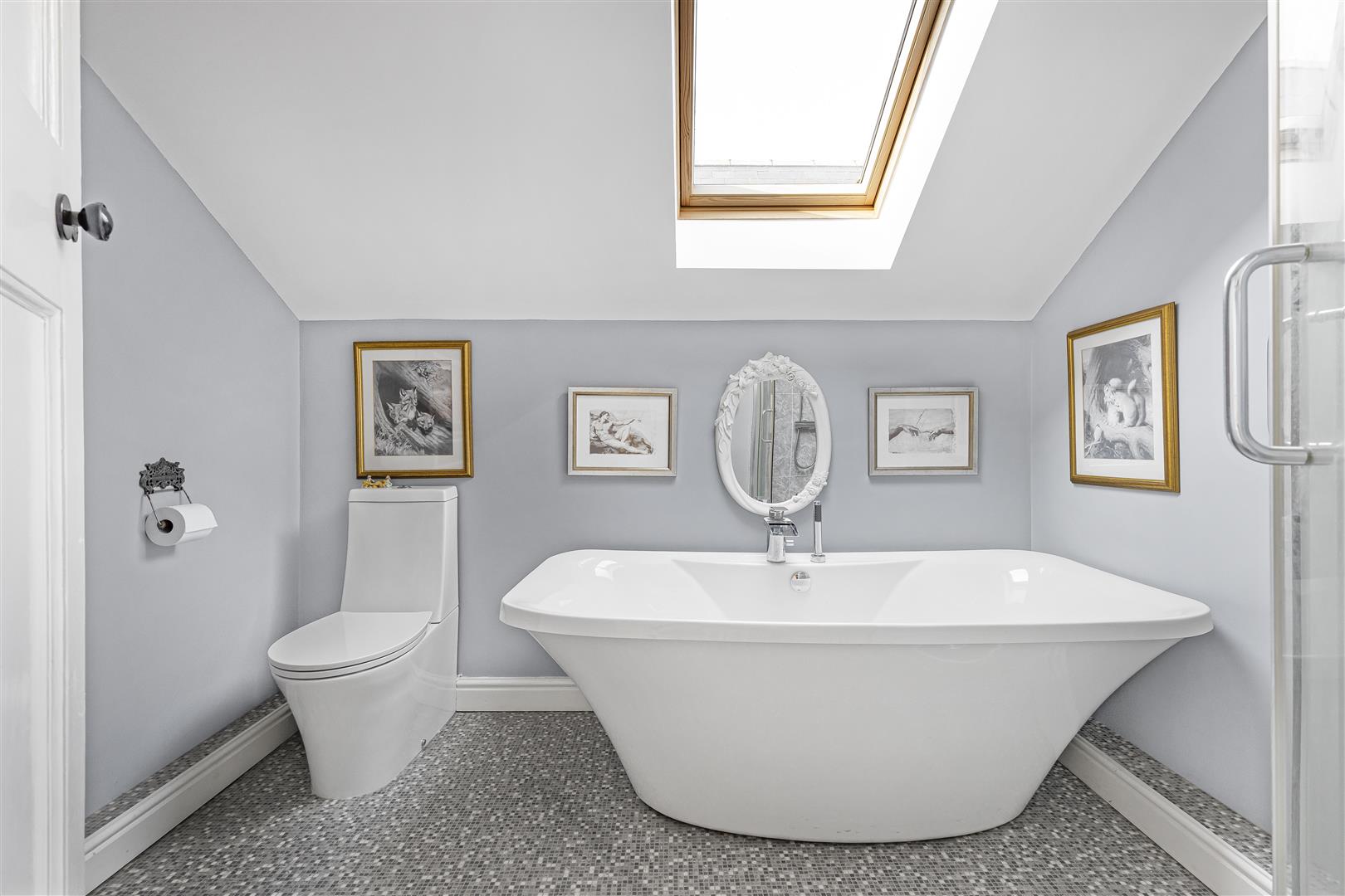 Luxury fitted bathroom comprising a low level WC, hand wash basin, free standing bath with shower attachment, enclosed shower cubicle and Velux window.