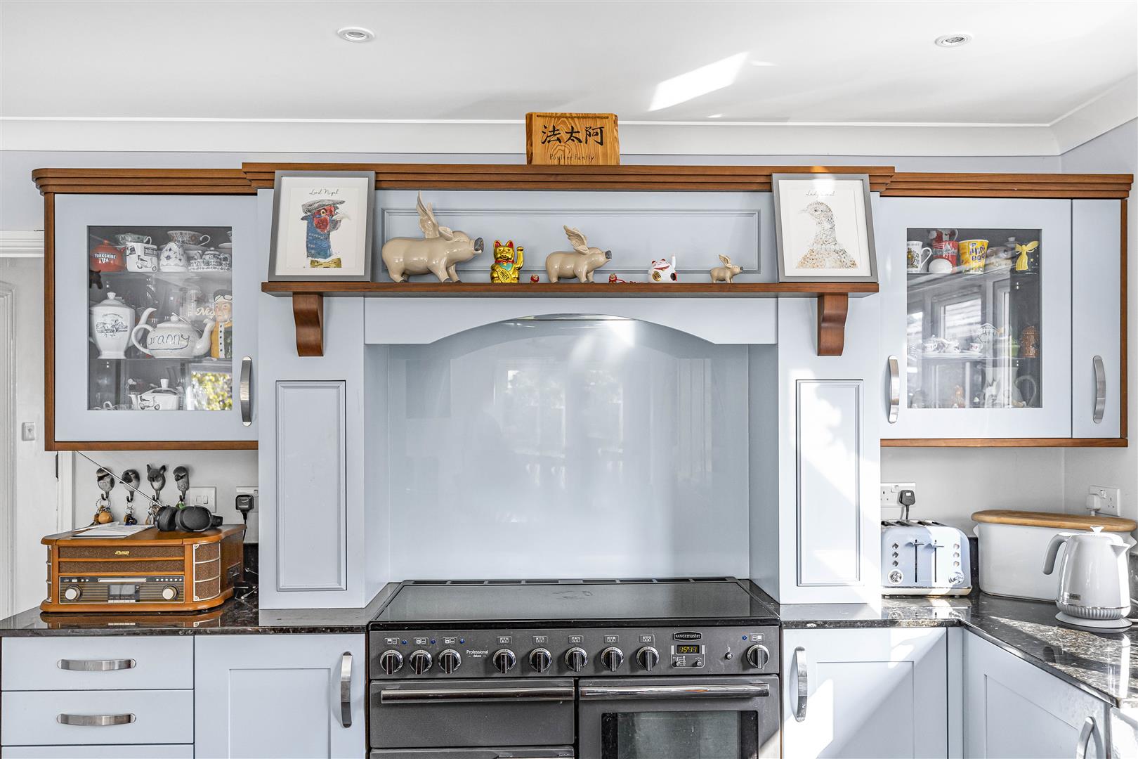 Open plan bespoke fitted kitchen with eye and base level storage units and granite working surfaces over, granite upstands, kitchen island, Perrin & Rowe double ceramic sink with mixer tap over and Rangemaster oven. Integrated appliances to include Neff dishwasher, full height fridge and freezer and microwave.