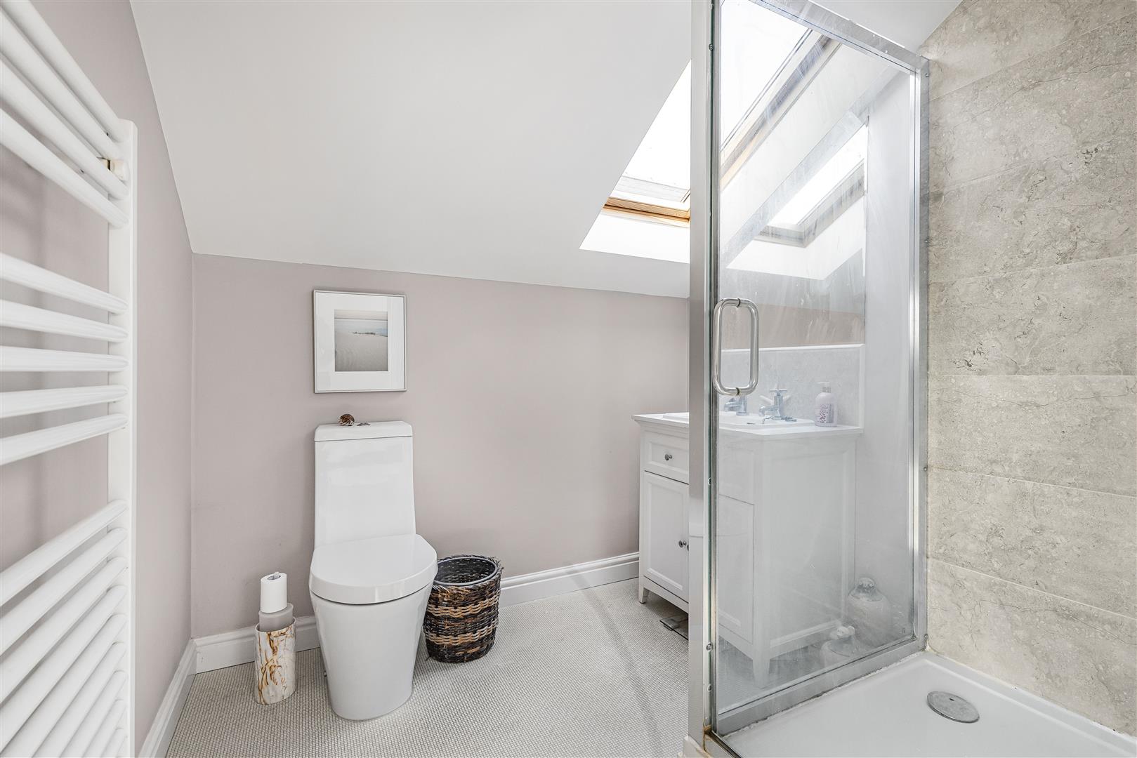 Three piece white bathroom suite comprising a low level WC, hand basin with vanity cupboard under, enclosed shower cubicle, heated towel rail and Velux window.