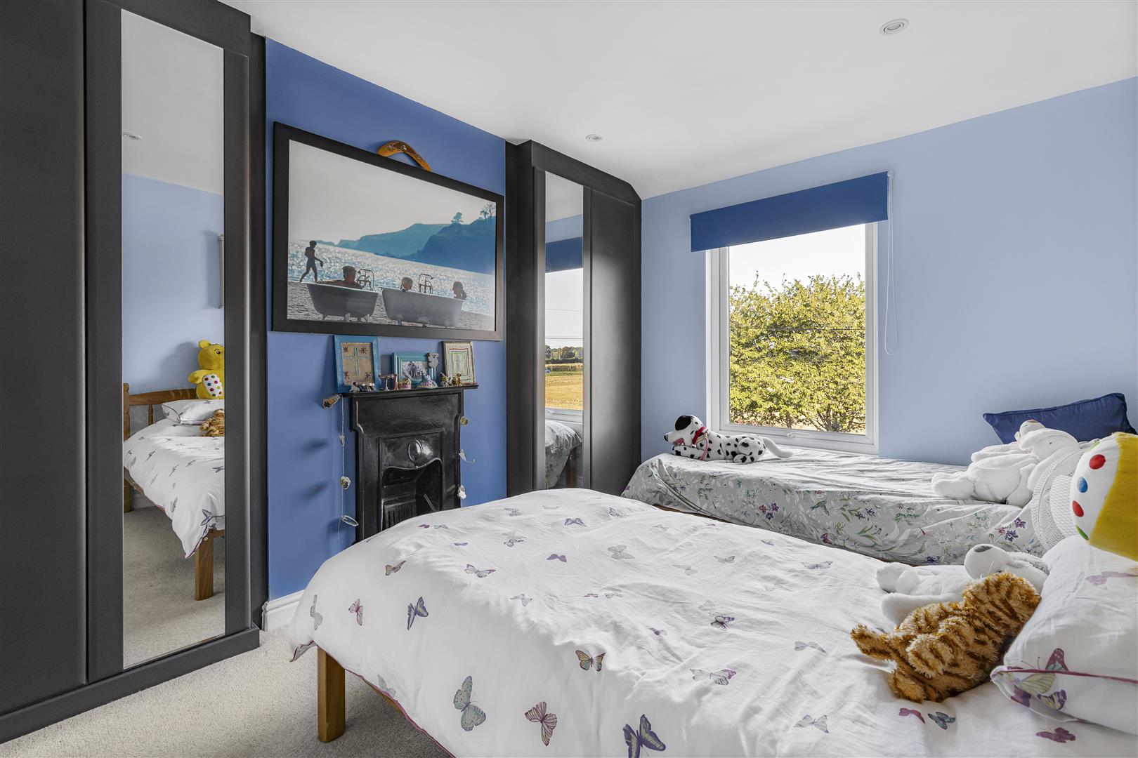 Double bedroom with featured cast iron fireplace, two built-in wardrobes, radiator and window to the front aspect.