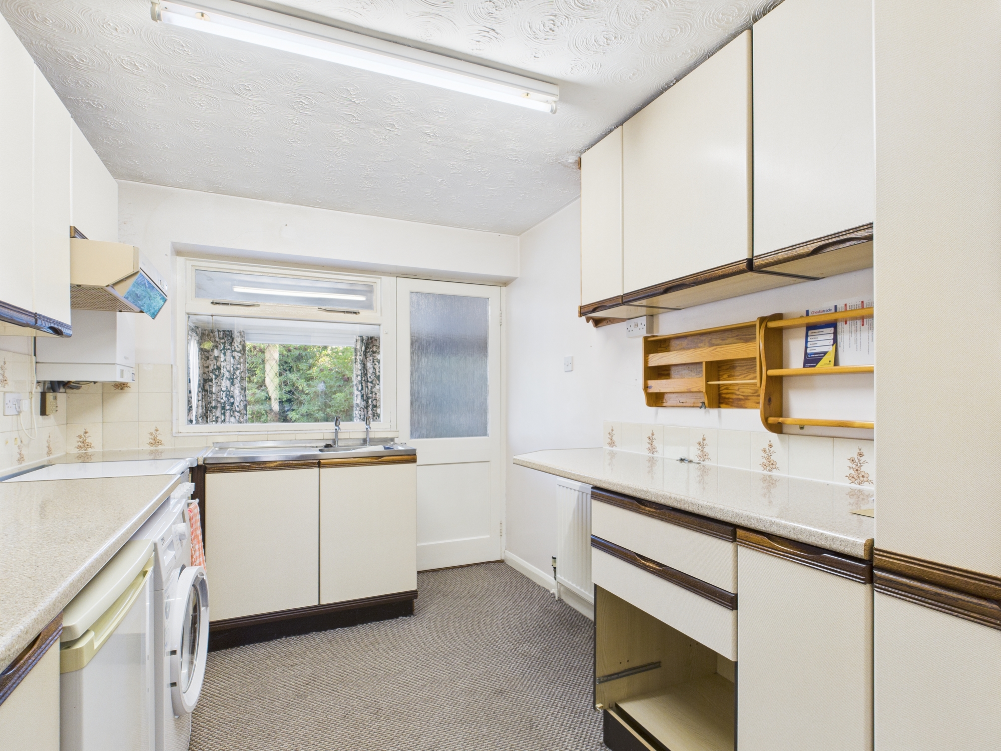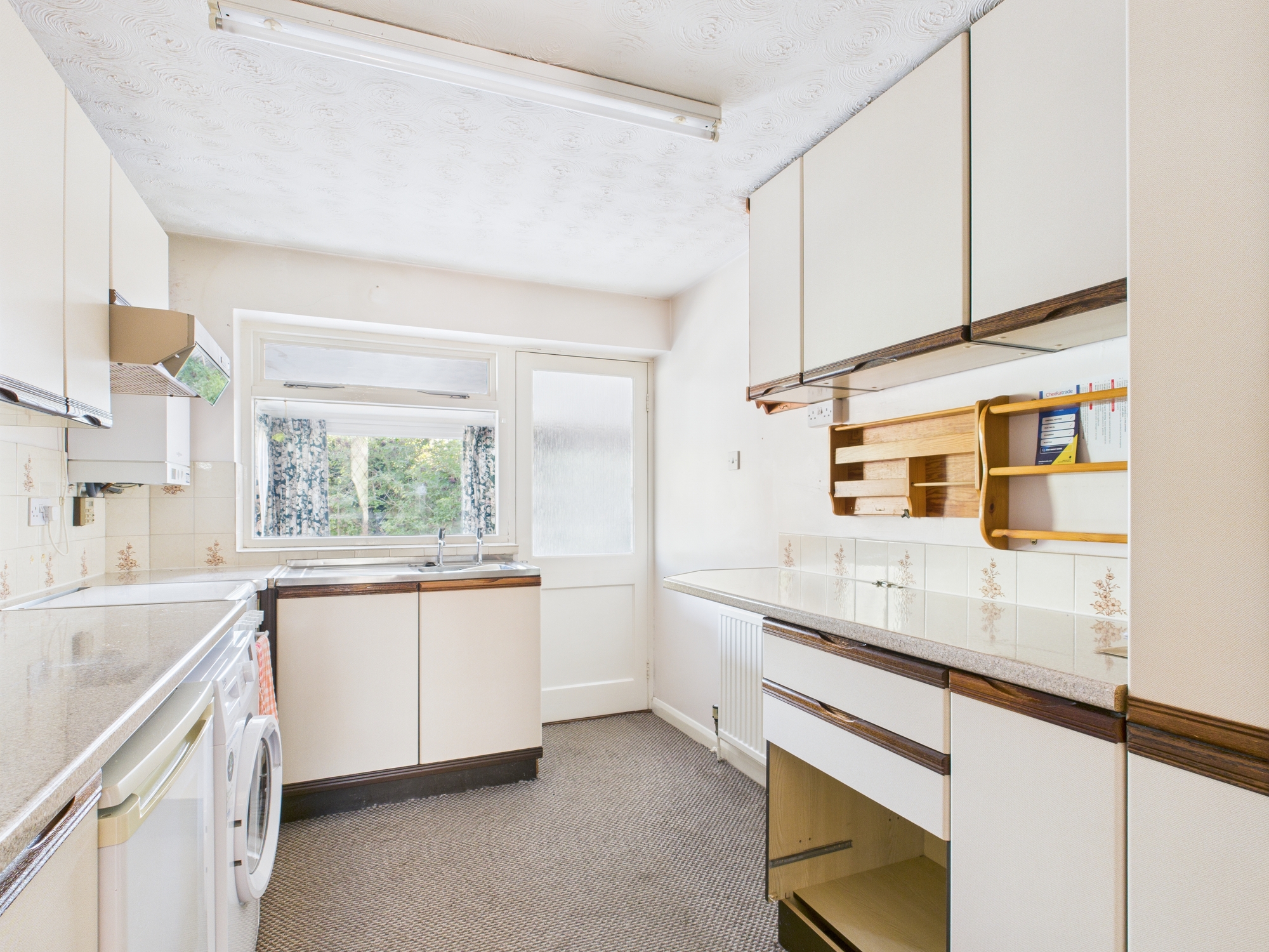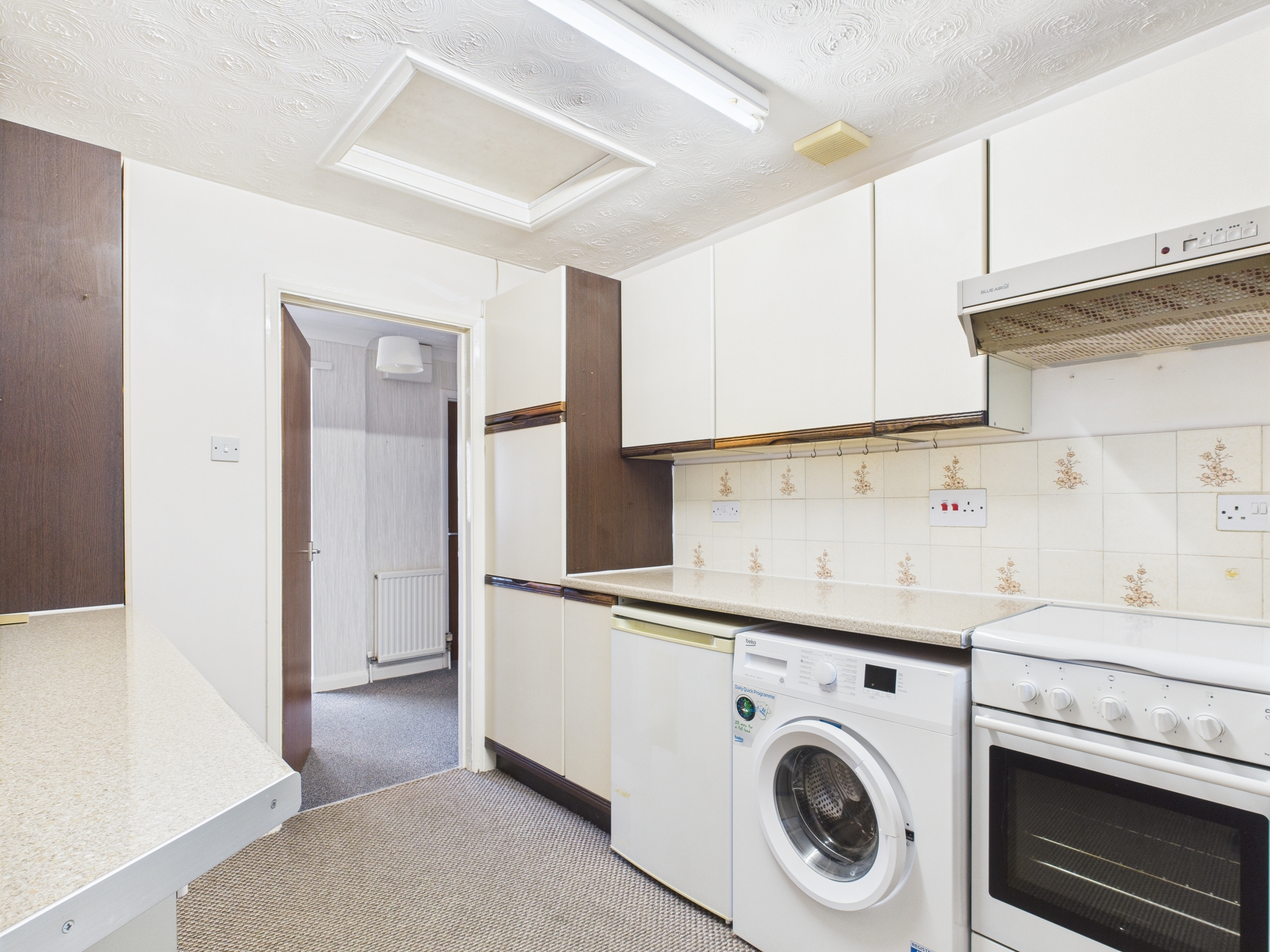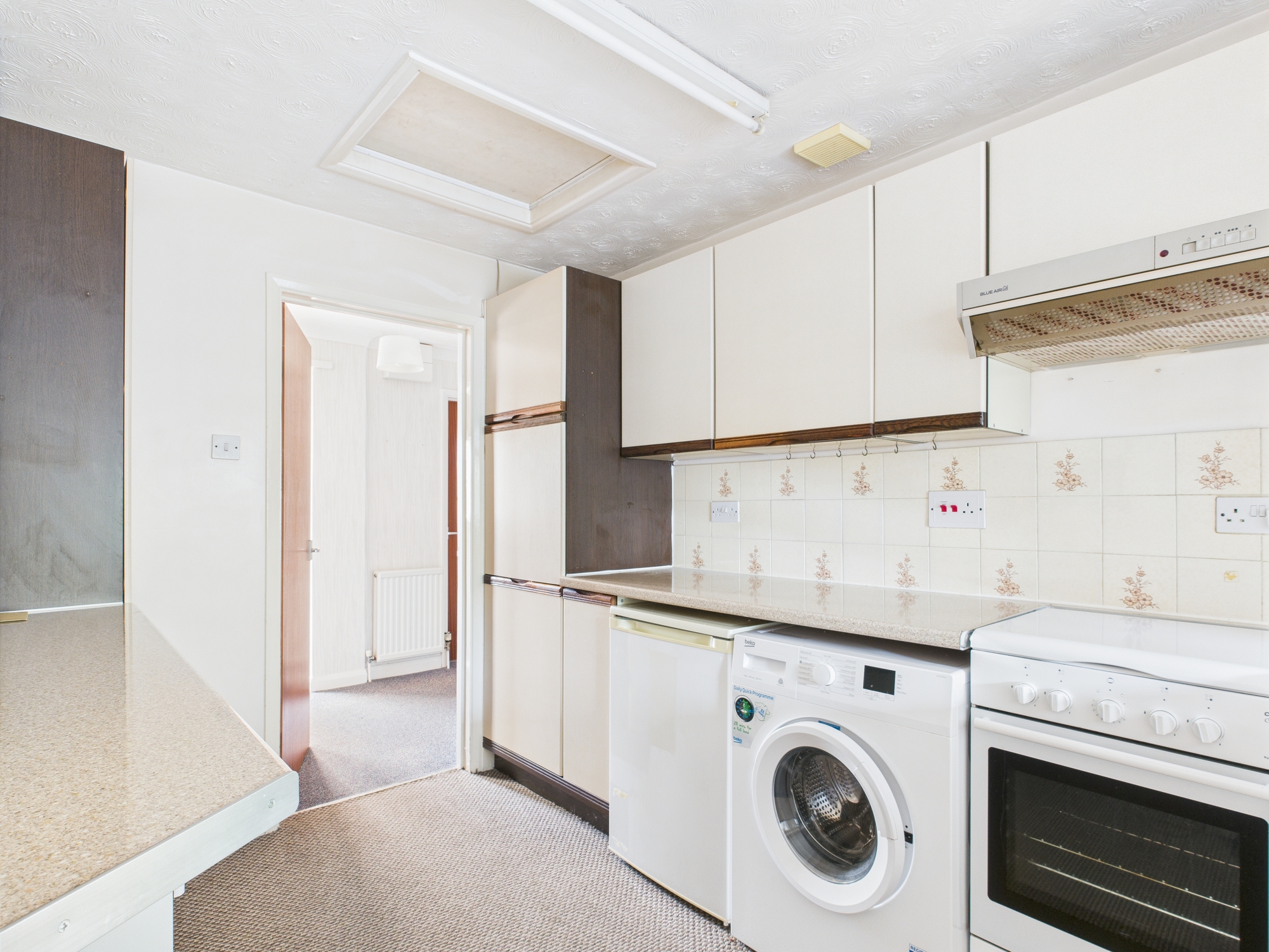Window to rear, wall mounted single panel radiator, wall and base units under round edge worksurfaces, stainless steel sink drainer inset, free standing gas oven/hob with extractor over, washing machine, under counter fridge/freezer, loft access, textured and coved ceiling.