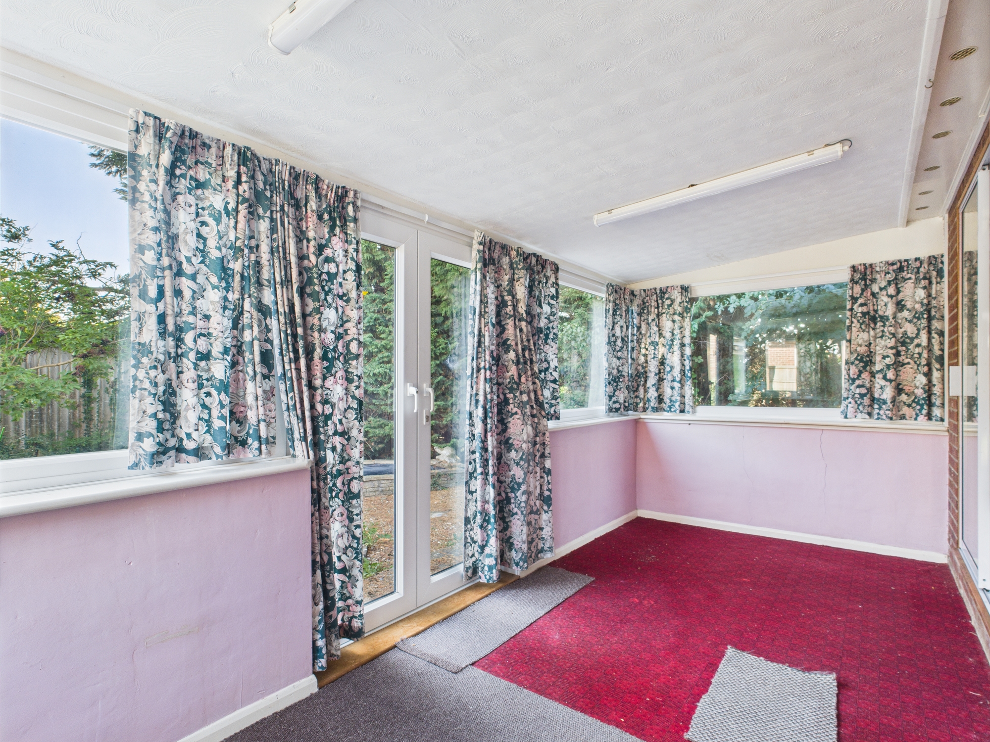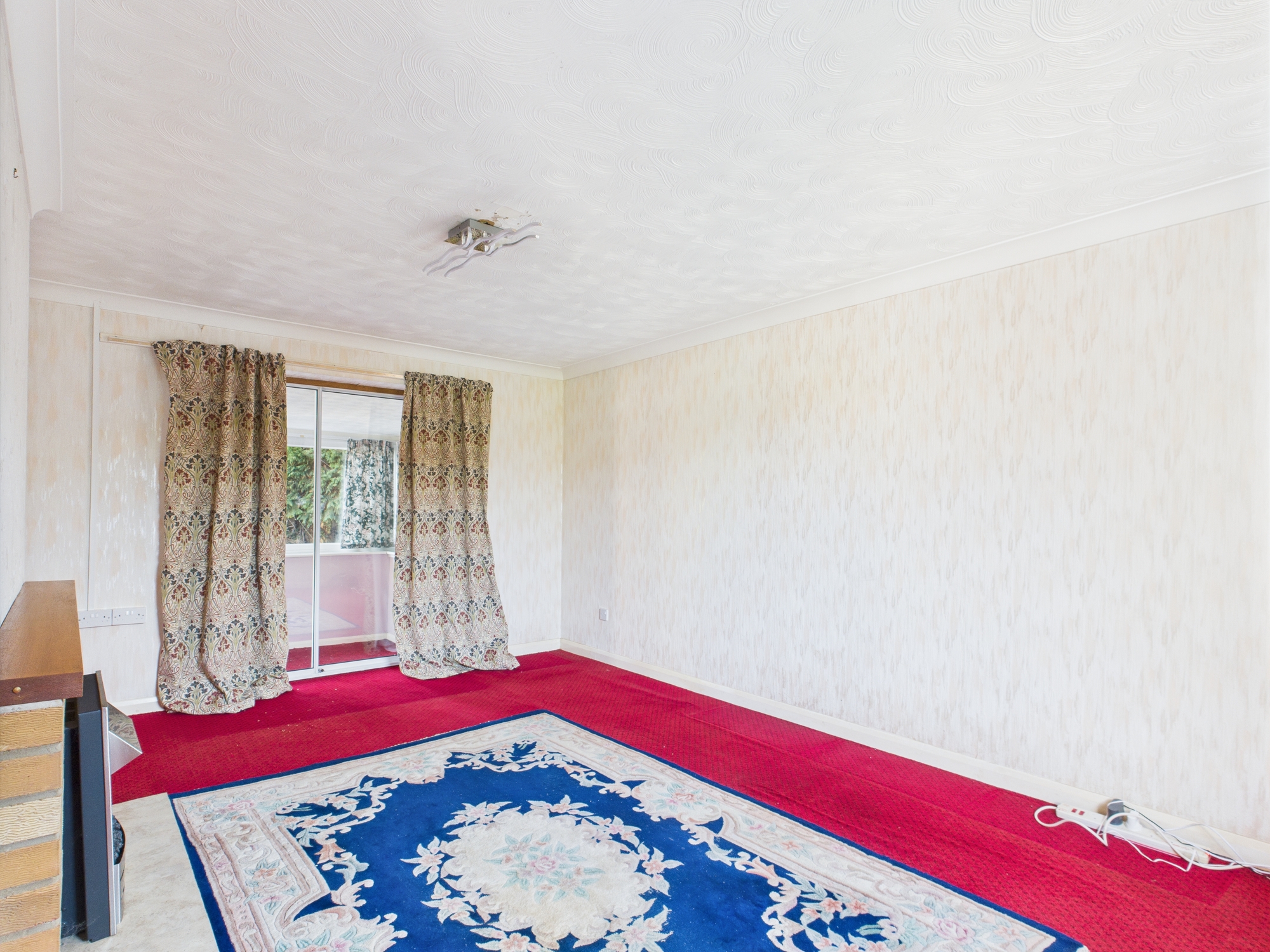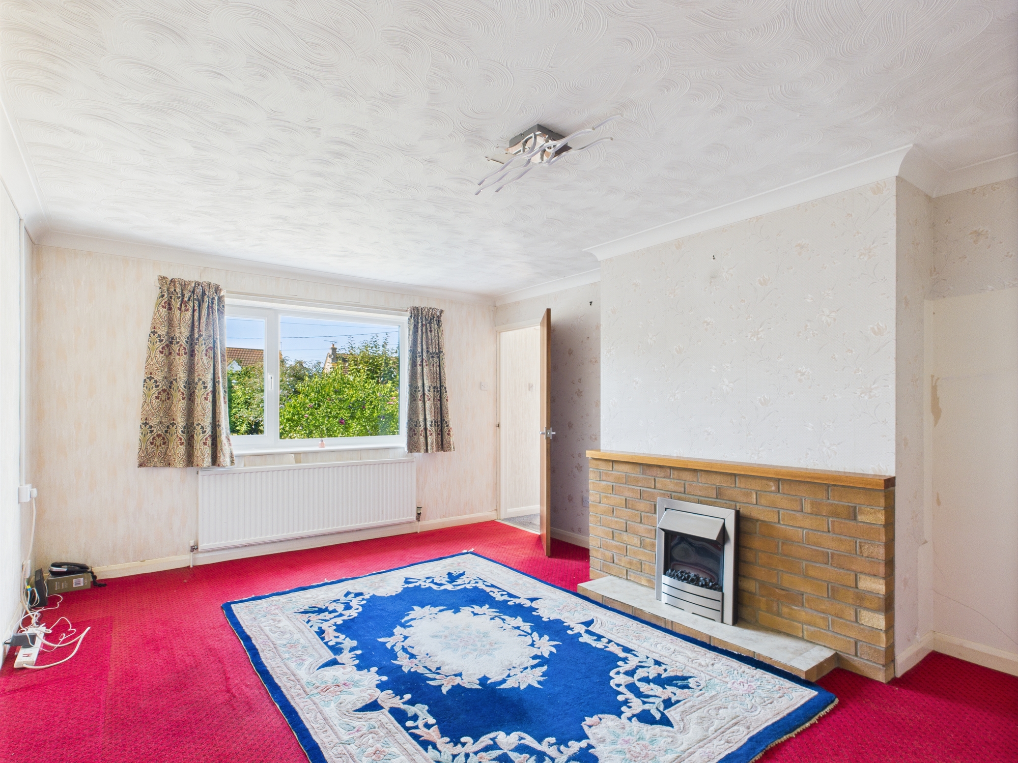 uPVC double glazed window to front, wall mounted single panel radiator, central brick fireplace with electric fire inset, textured and coved ceiling, double glazed sliding doors to garden room.