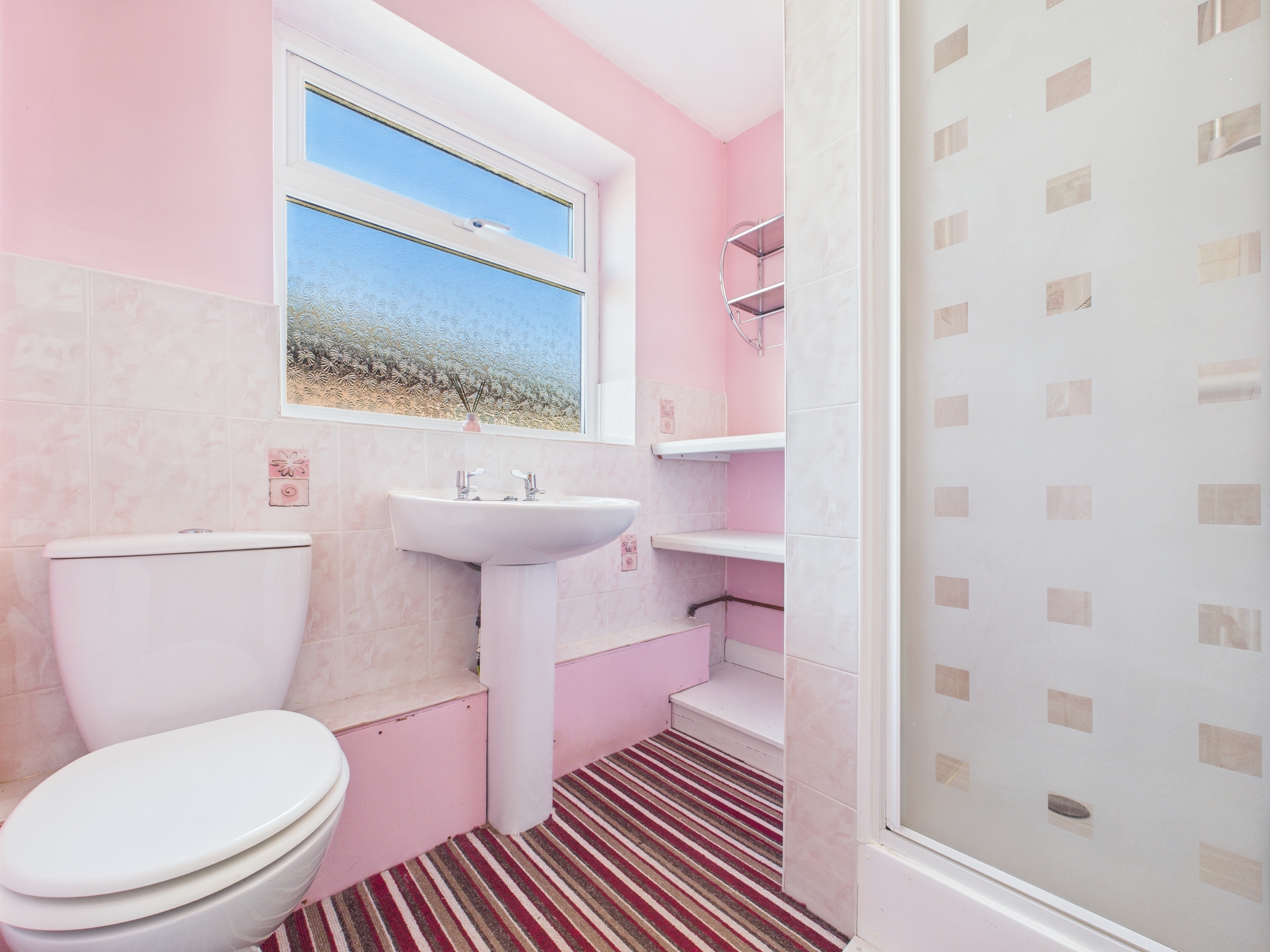 uPVC double glazed window to side, wall mounted single panel radiator, shower cubicle with glass door, w.c., pedestal handwash basin, textured ceiling.