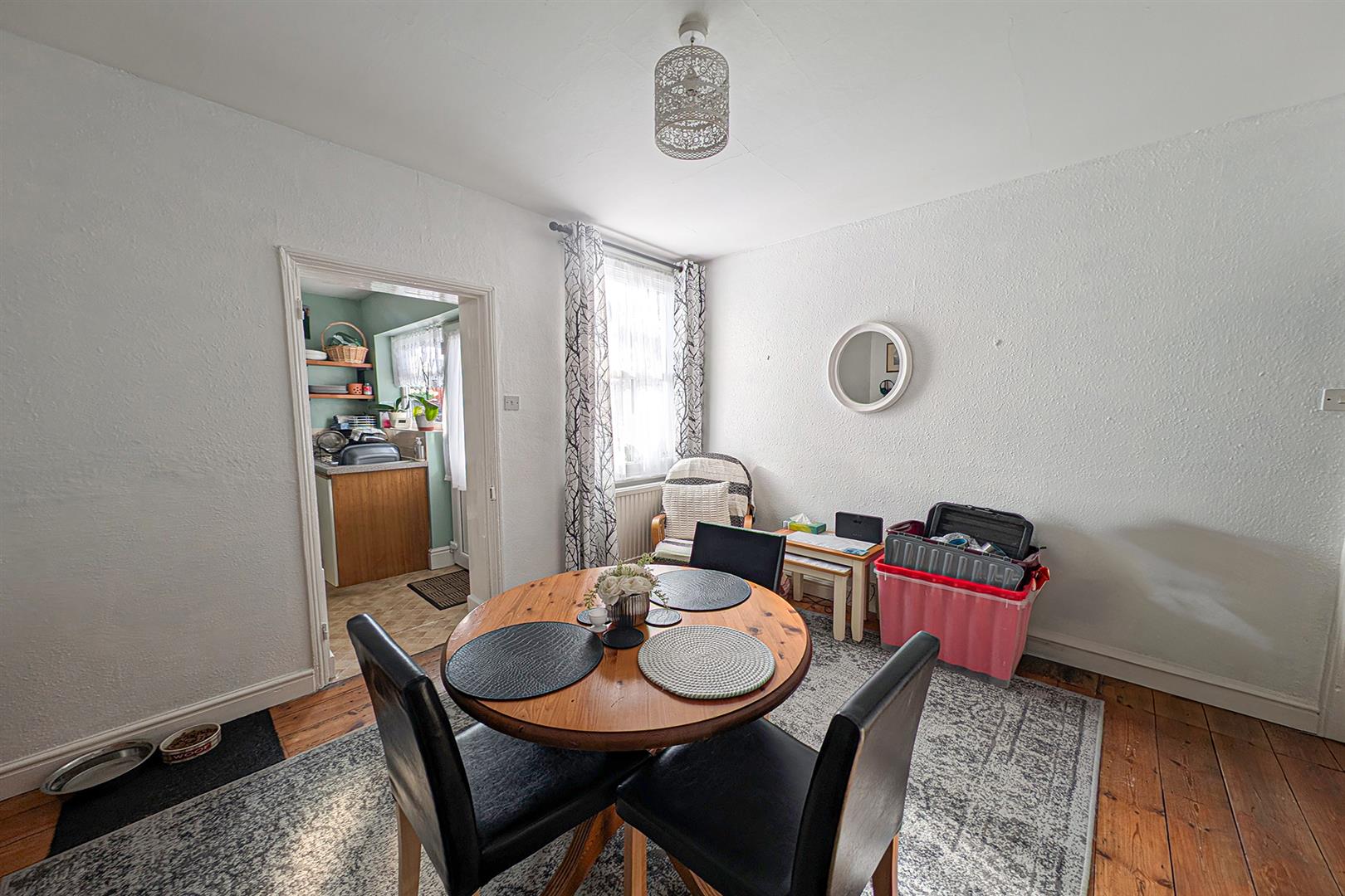 Delightful dining room with exposed wooden floorboards. Radiator. Window to the rear aspect. Doors leading to both the kitchen and inner hall.