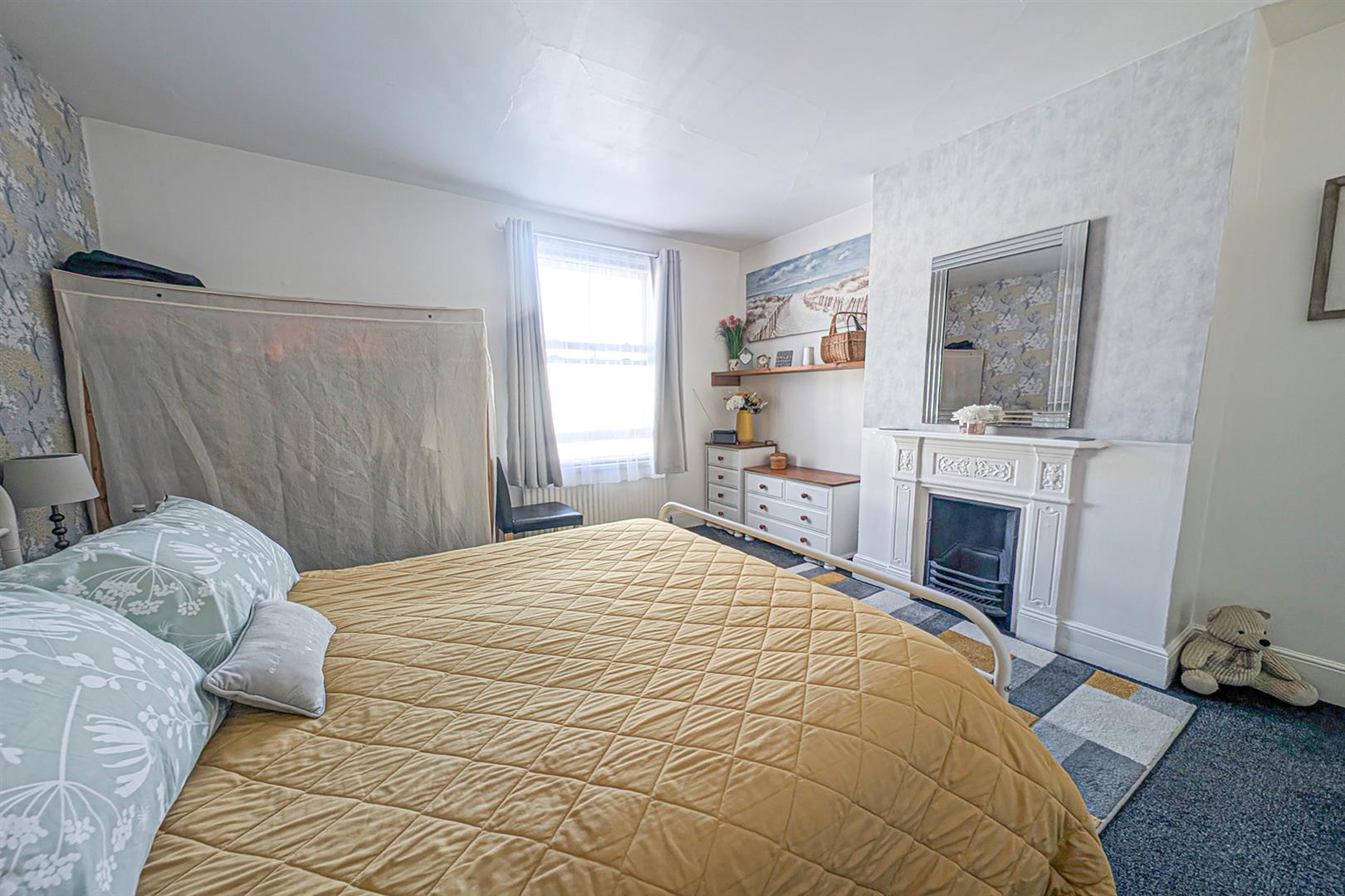 Spacious doubled bedroom with window to the front aspect. Feature fireplace with ornate white surround and mantel. Built-in wardrobe. Radiator. Door leading to the landing.