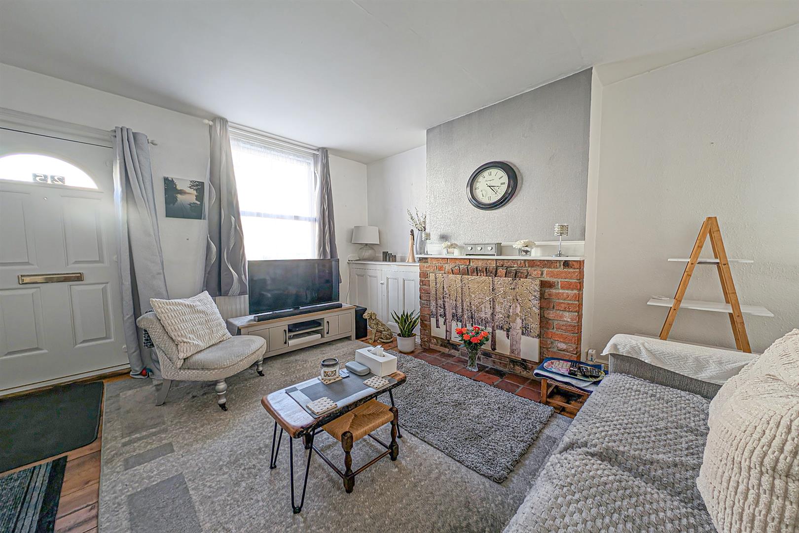 Charming living room with feature fireplace with exposed brick surround, tiled hearth and mantel. Built-in cupboard to one of the alcoves. Exposed wooden floorboards. Window to the front aspect. Radiator. Doors leading to the front and inner hall.
