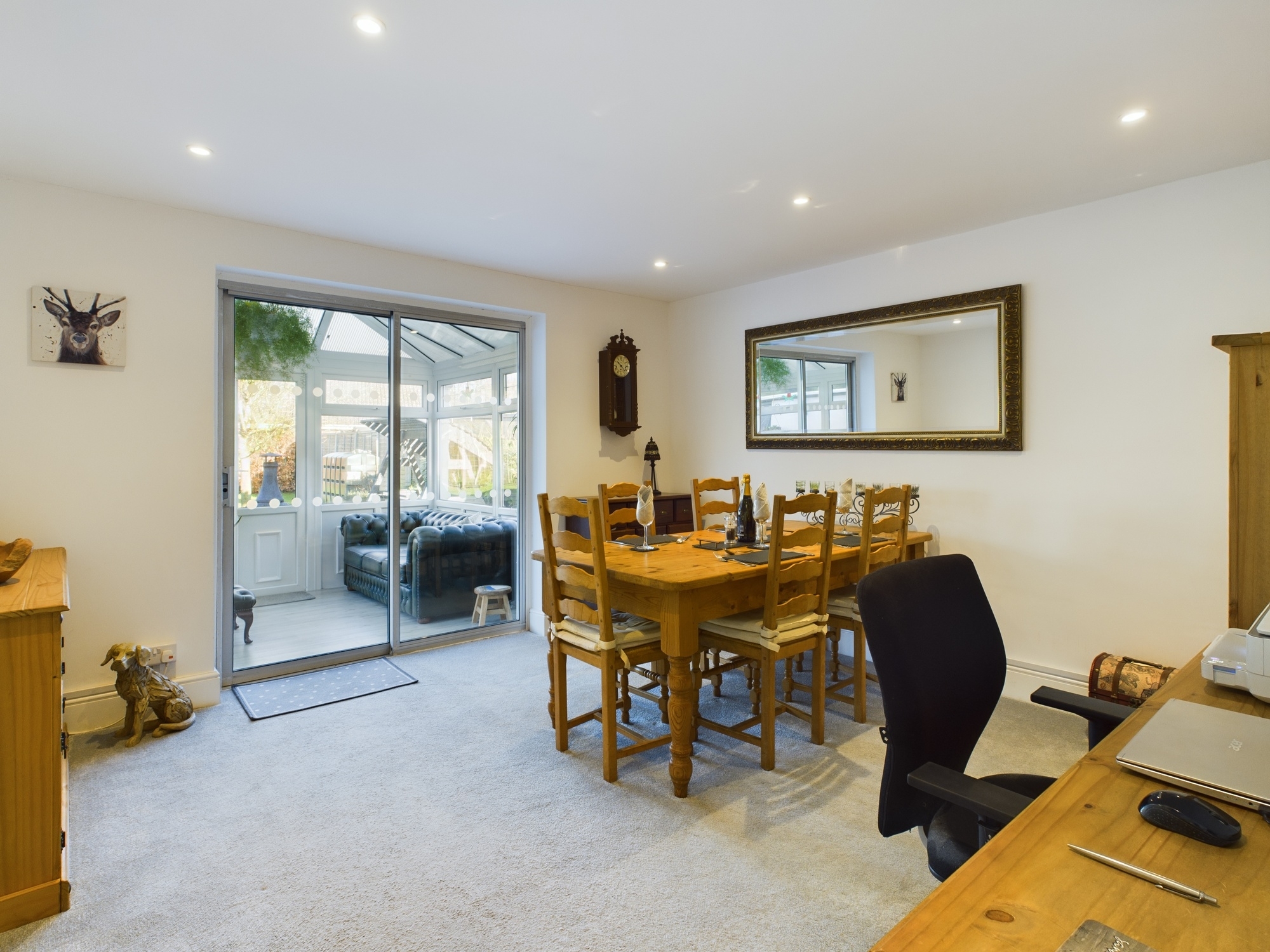 The rear garden is mainly laid to lawn with a decked area and private door into the garage, free standing oil tank and floor mounted oil central heating boiler. To the side there is also a further lawned area and a path giving access to the front. There is also a greenhouse.