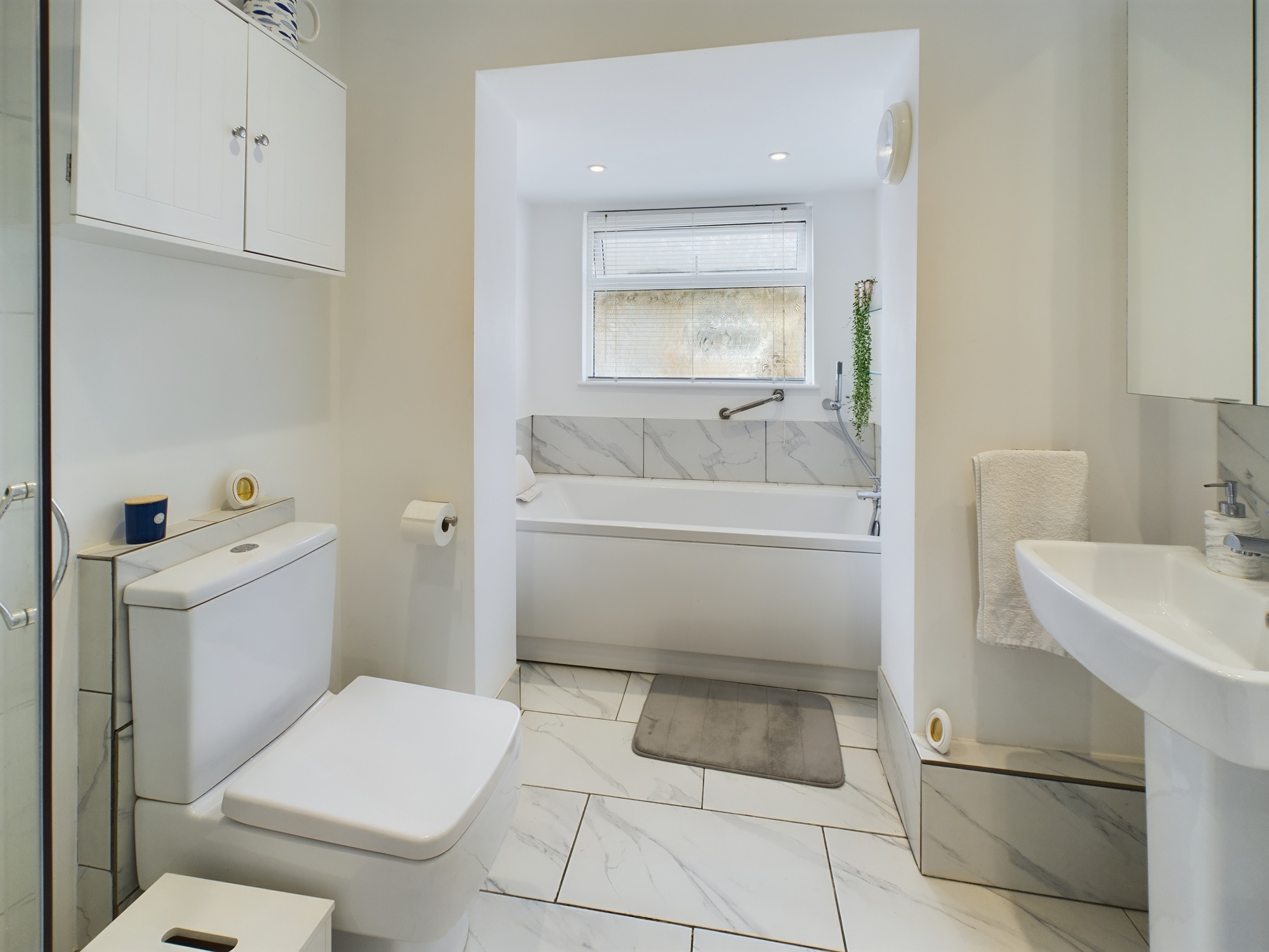 UPVC double glazed window to the side aspect, panelled bath with mixer tap, WC, pedestal hand wash basin, corner shower cubicle with wall mounted shower unit with tiled surround and sliding glass door, tiled flooring, ceiling extractor and spotlights.