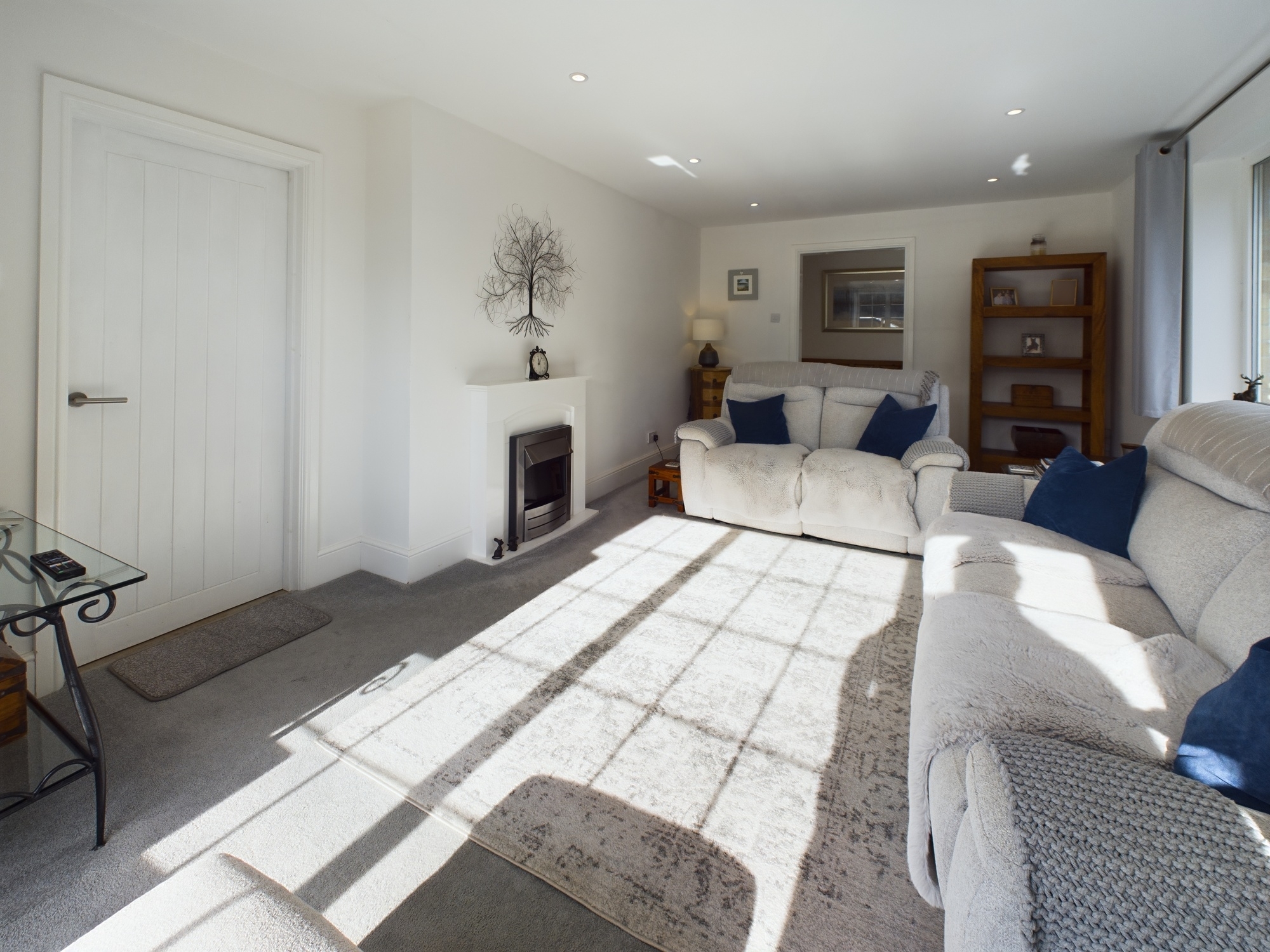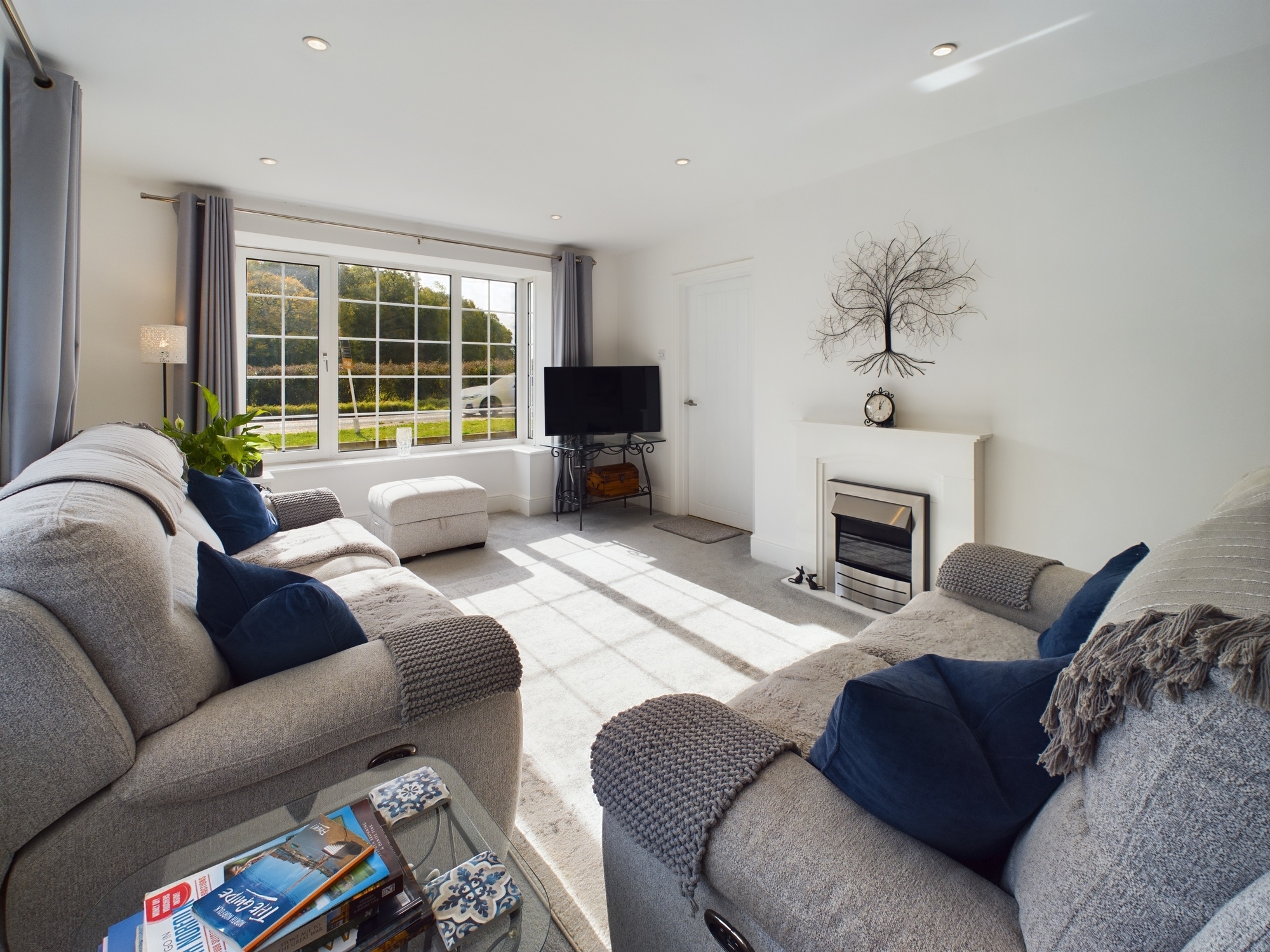 UPVC double glazed bay window to front aspect, uPVC double glazed window to side aspect, wall mounted double radiator, fireplace with electric fire inset ceiling spotlights, opening to hallway.