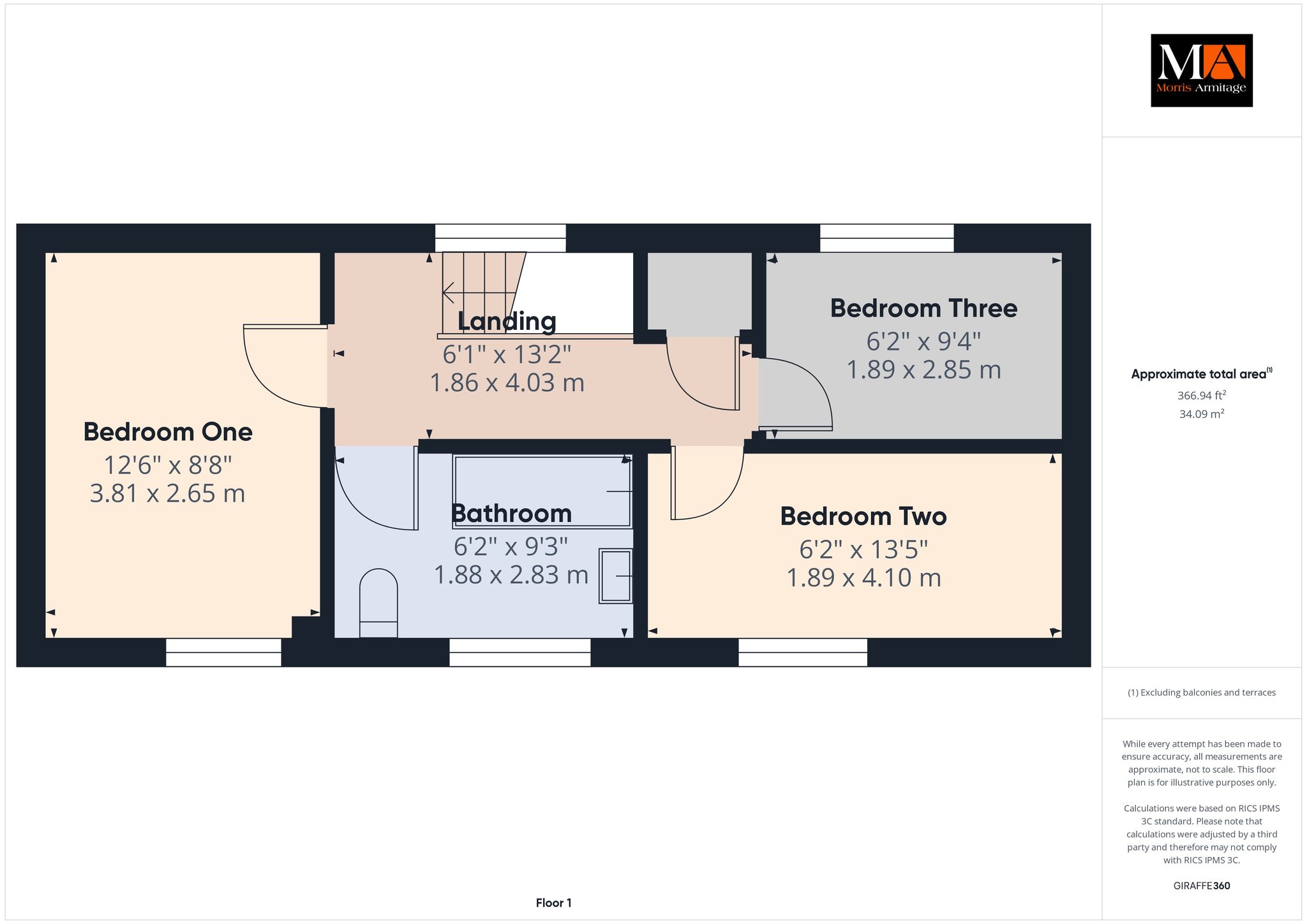 Bedroom One 12’6” x 8’8” (3.81m x 2.65m)
