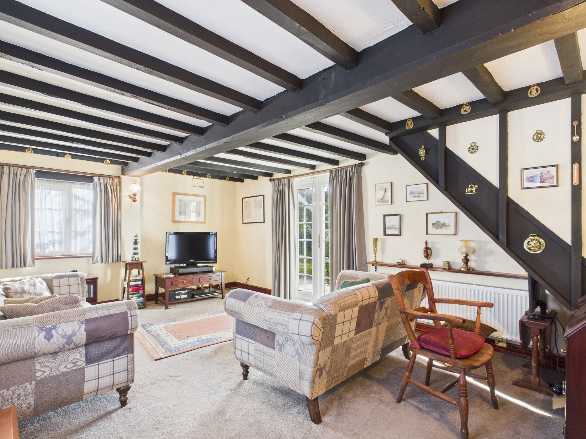 uPVC double glazed window to side, uPVC double glazed window to front, double panel radiator, textured and beamed ceiling, feature fireplace with beam over, stairs to first floor landing, alarm panel, part glazed latch timber door to:-