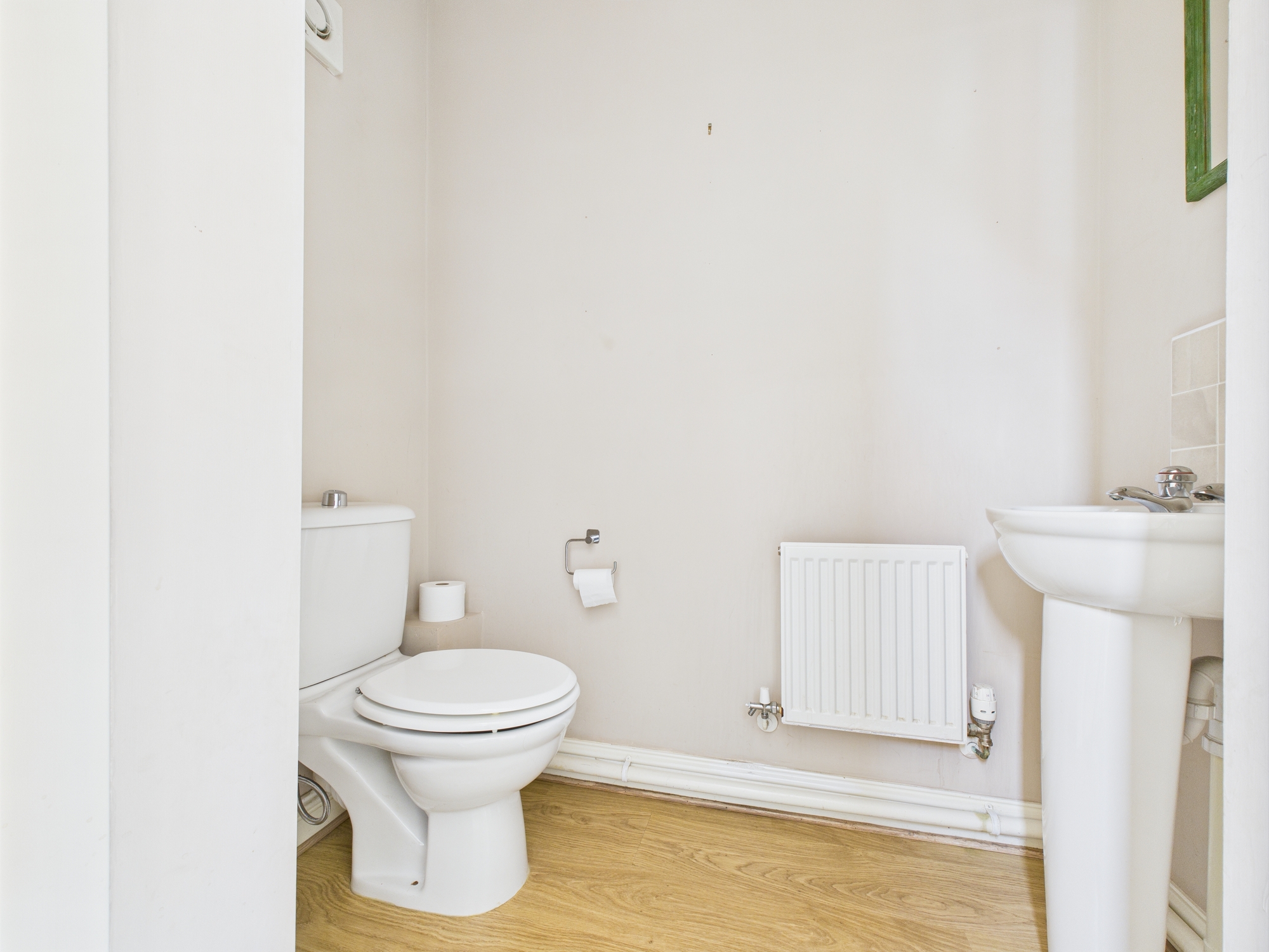 Wall mounted single panel radiator, w.c., pedestal handwash basin, laminate style flooring, extractor.
