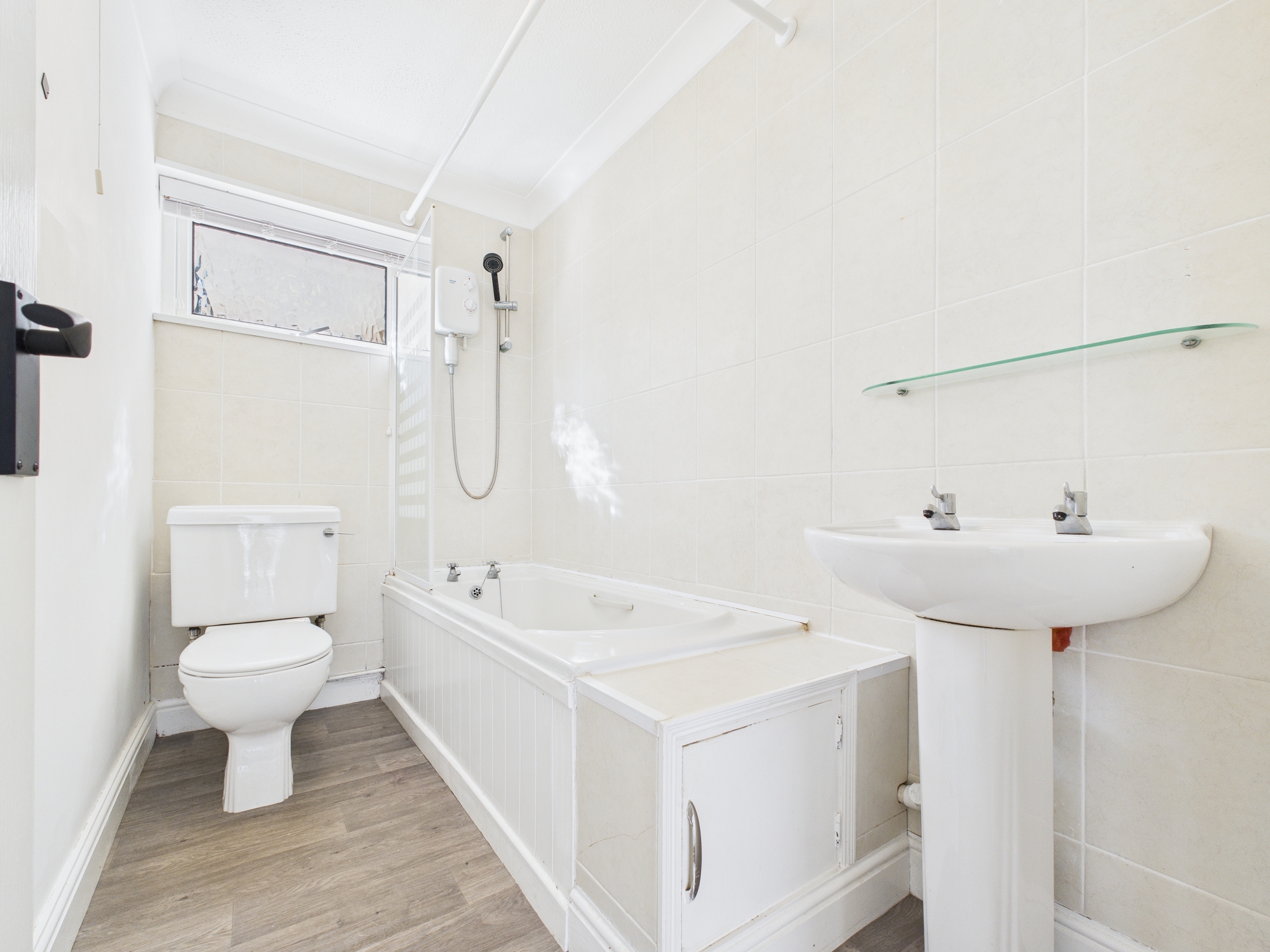 uPVC double glazed window to side, panelled bath with wall mounted electric shower and glass shower screen over, w.c., pedestal handwash basin, partly tiled walls, lino style flooring, textured and coved ceiling.