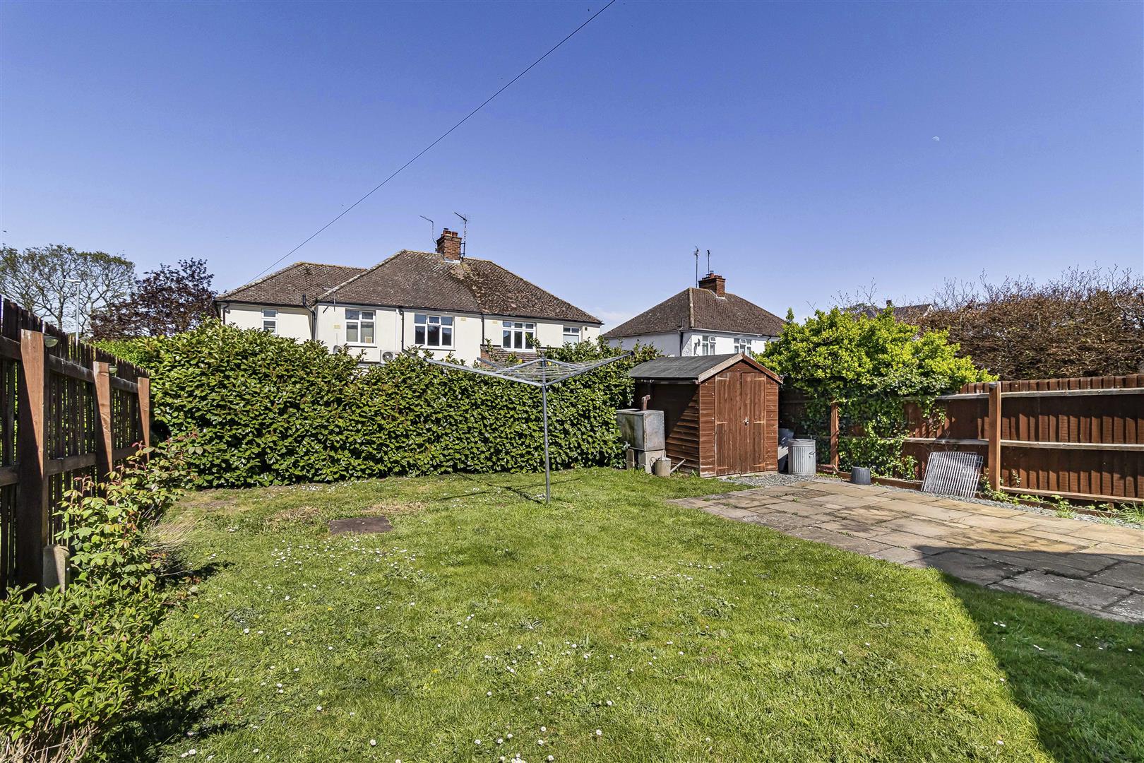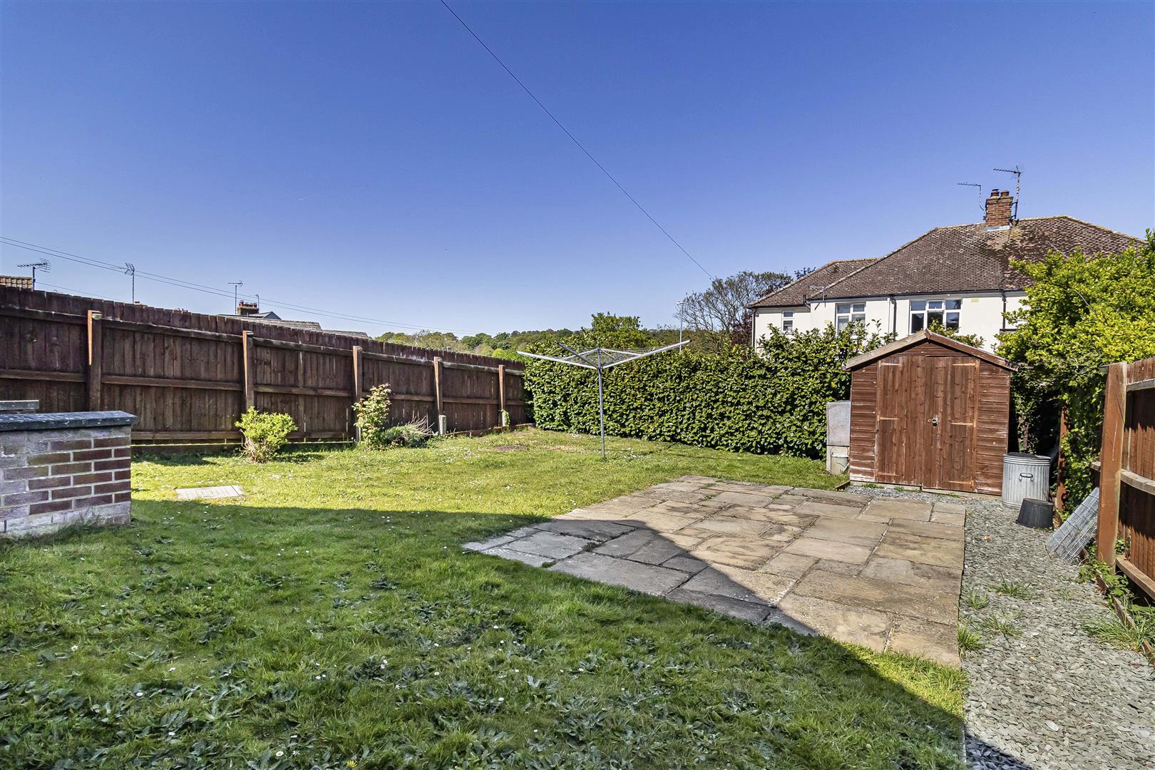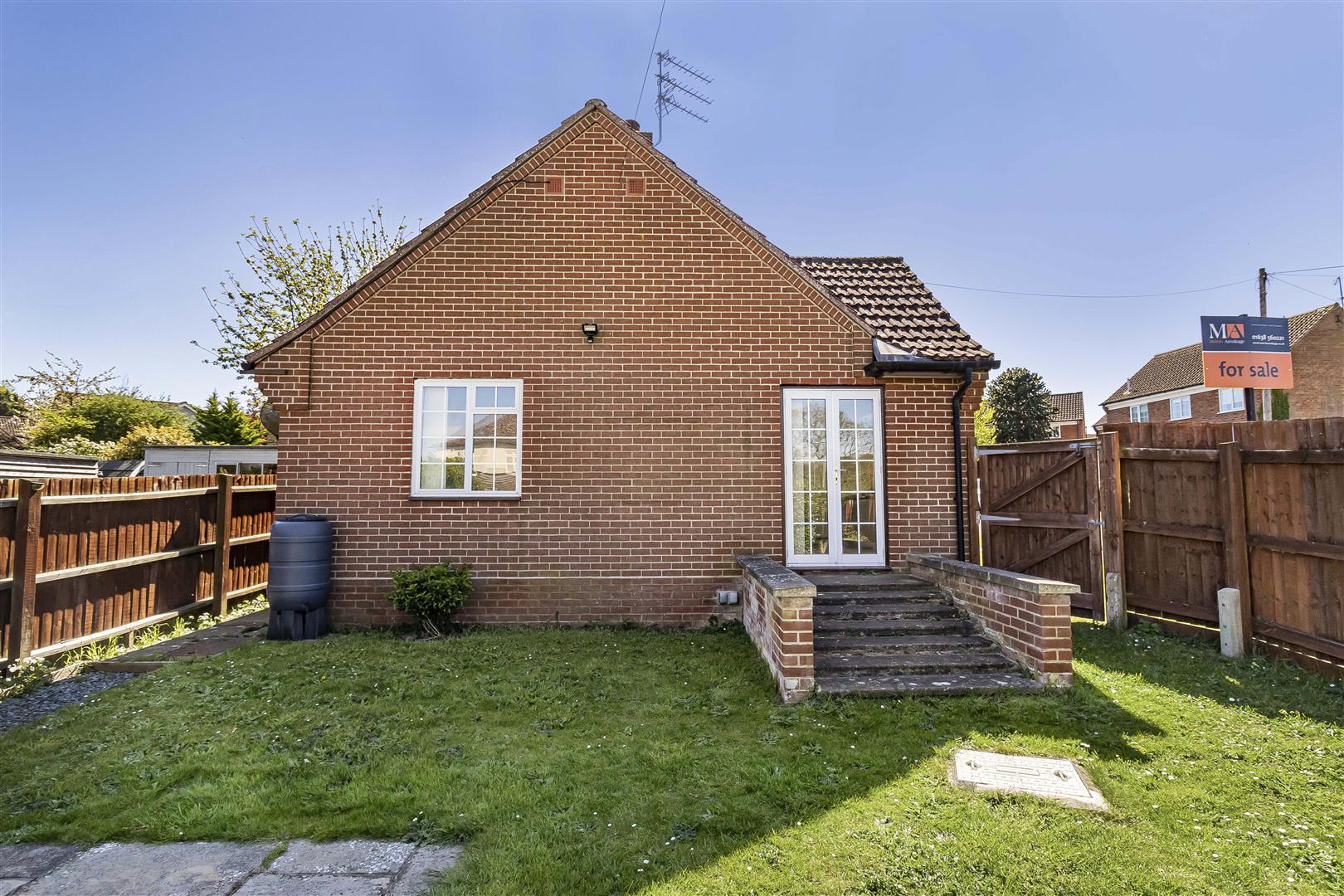 Mainly laid to lawn with a patio seating area to the side. Steps lead up to the French doors to the living room. Pathway to the side of the house with a door to the lobby. Gravelled pathway leading to the timber shed. Some established shrub planting. Access gates to the front