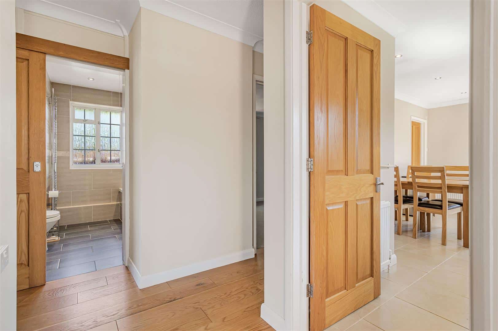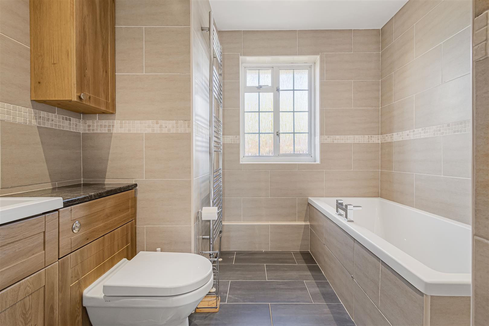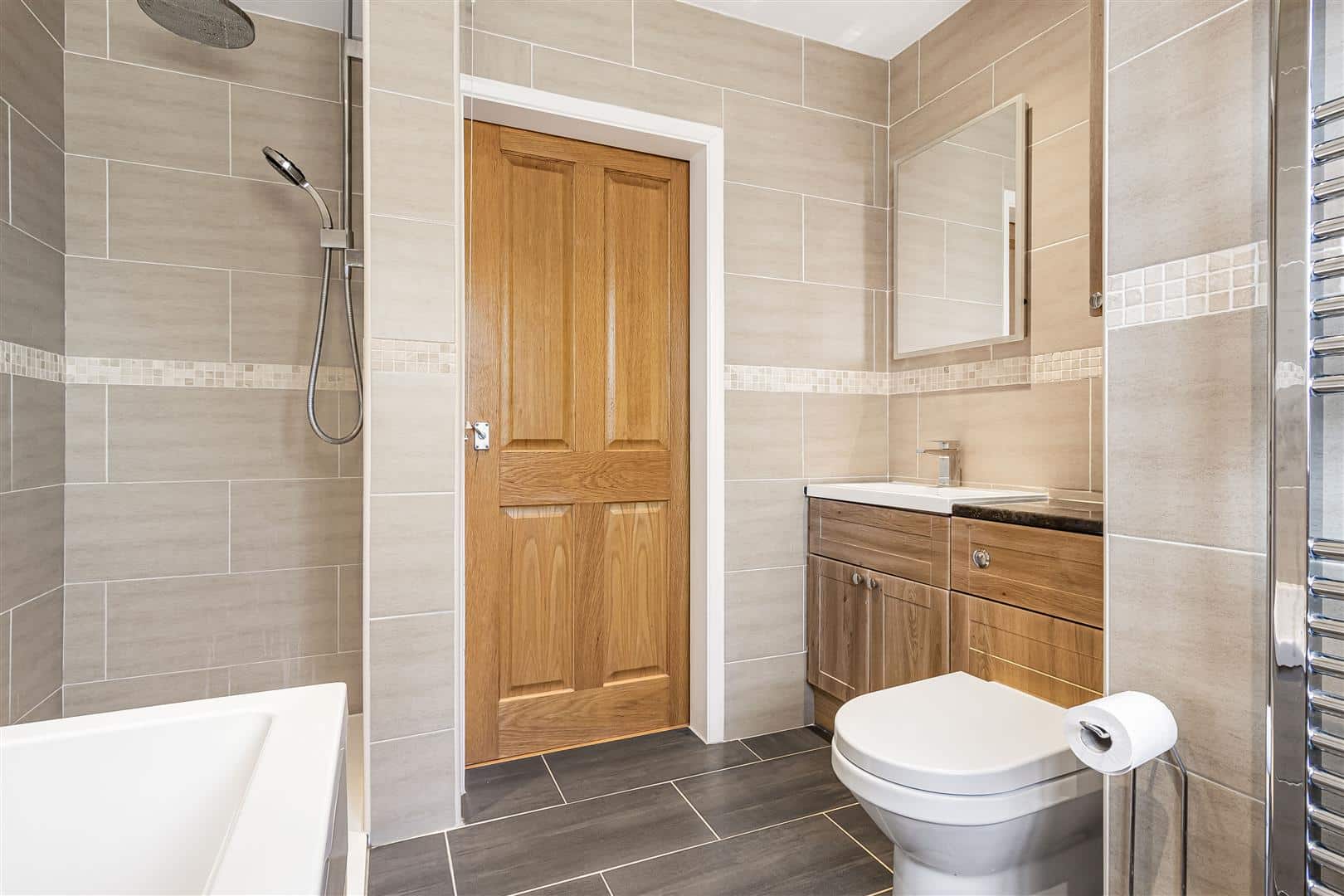 Contemporary white suite comprising low level, concealed cistern, WC, inset handbasin with mixer tap over and built-in storage under and counter top, panelled bath with mixer tap over and walk-in shower fitted with a dual head digital mixer shower. Attractively tiled throughout. Tiled flooring. Ladder radiator. Obscured window. Door leading to the entrance hall.