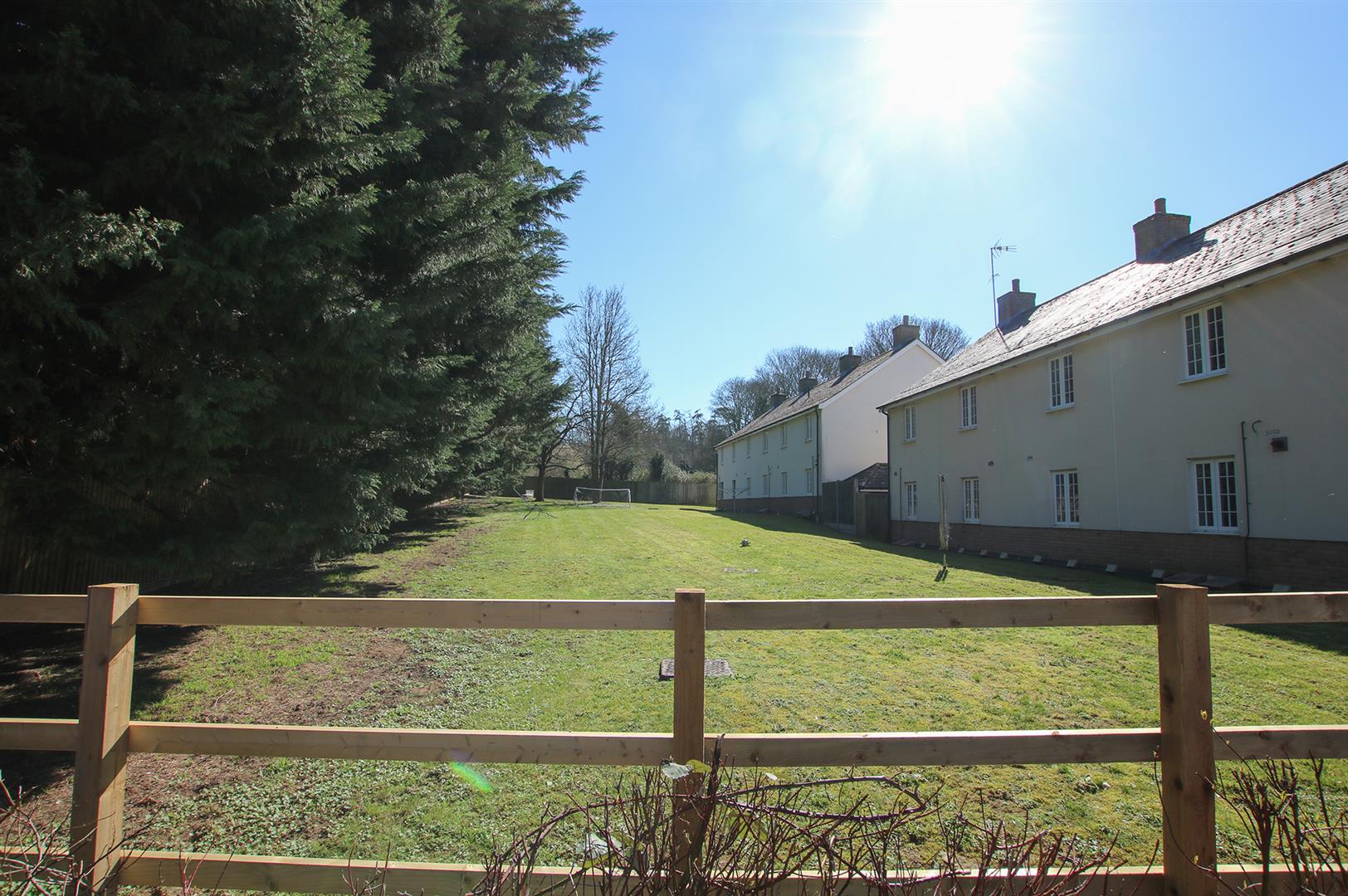 Attractive open plan communal garden laid to lawn with shrub borders, parking.