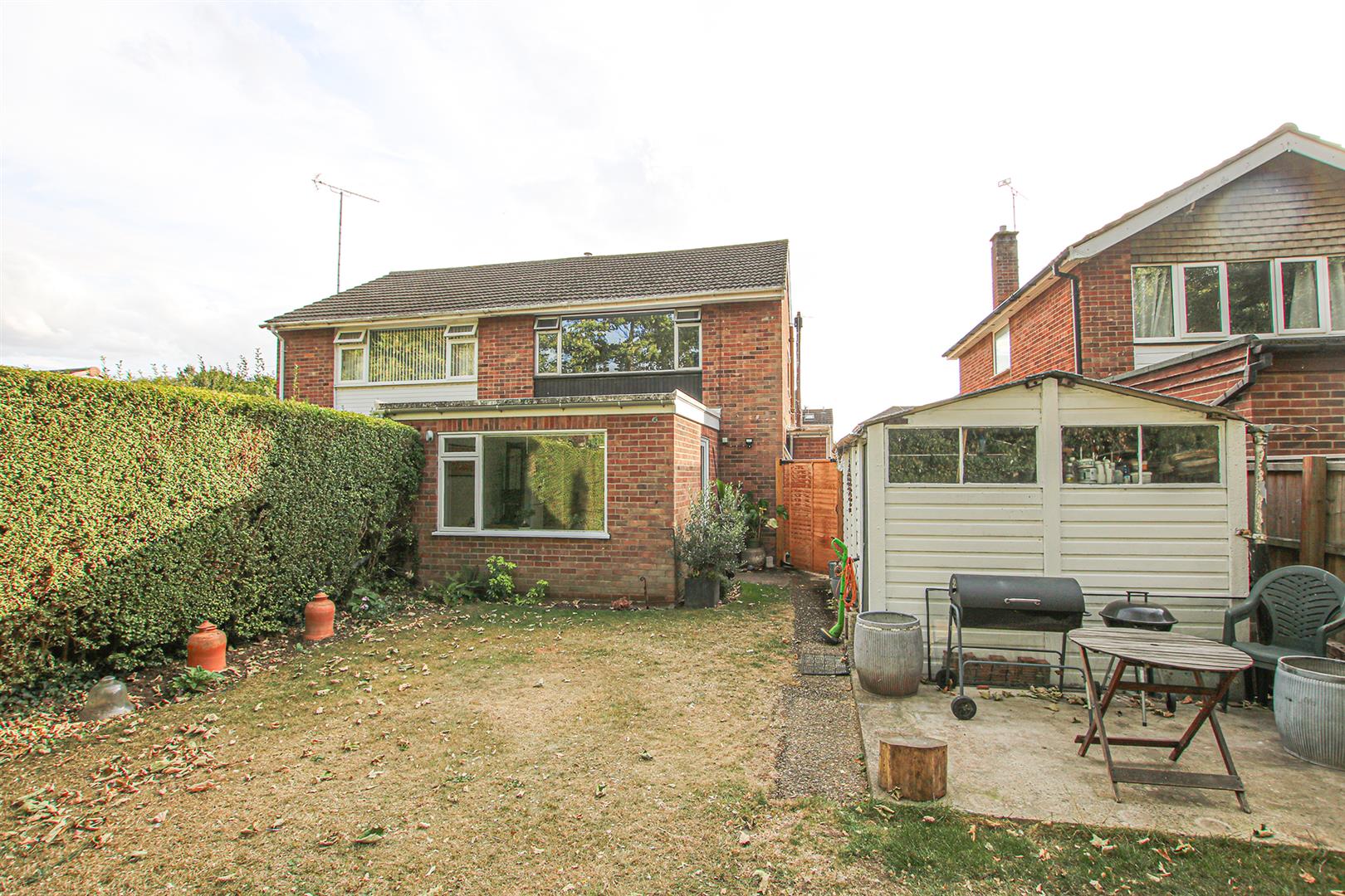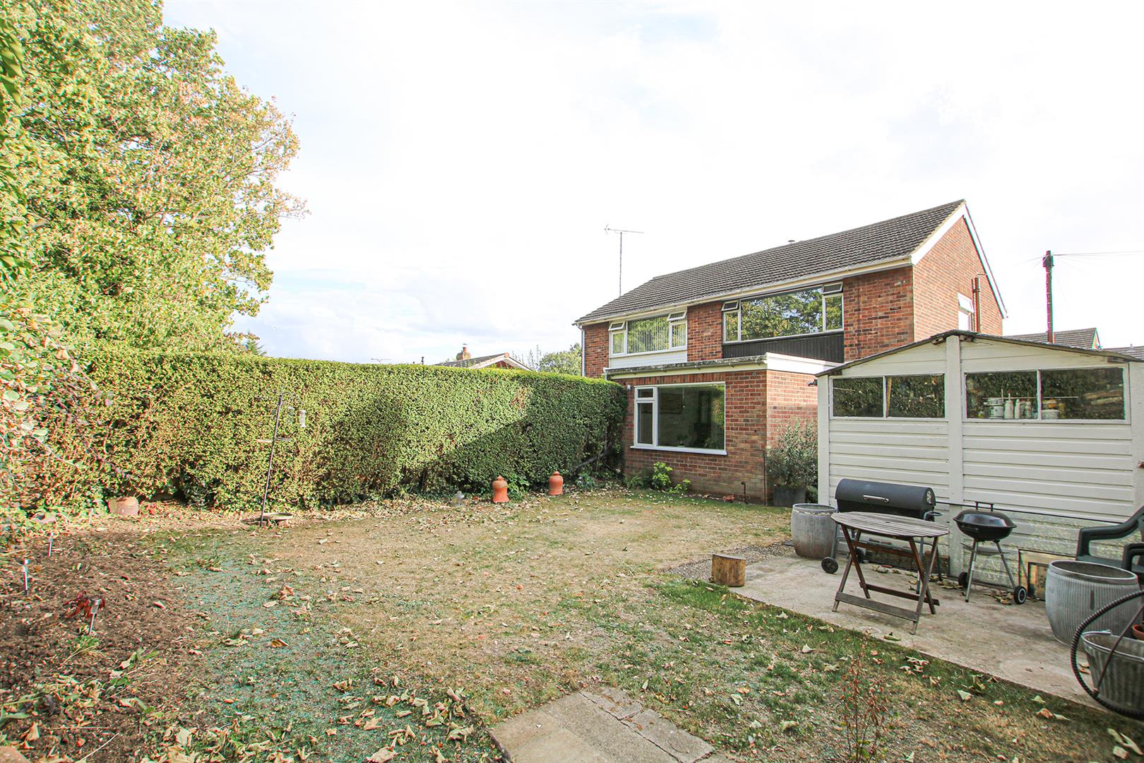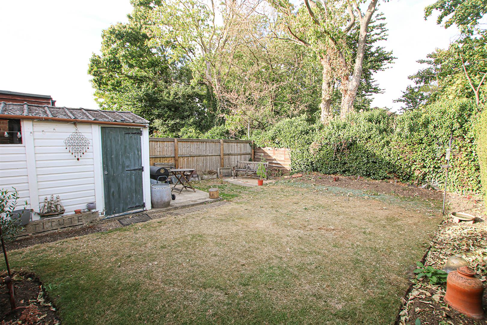 Mainly laid to lawn with planted borders. Patio seating areas. Doors leading to kitchen/dining room, outbuilding and garage.