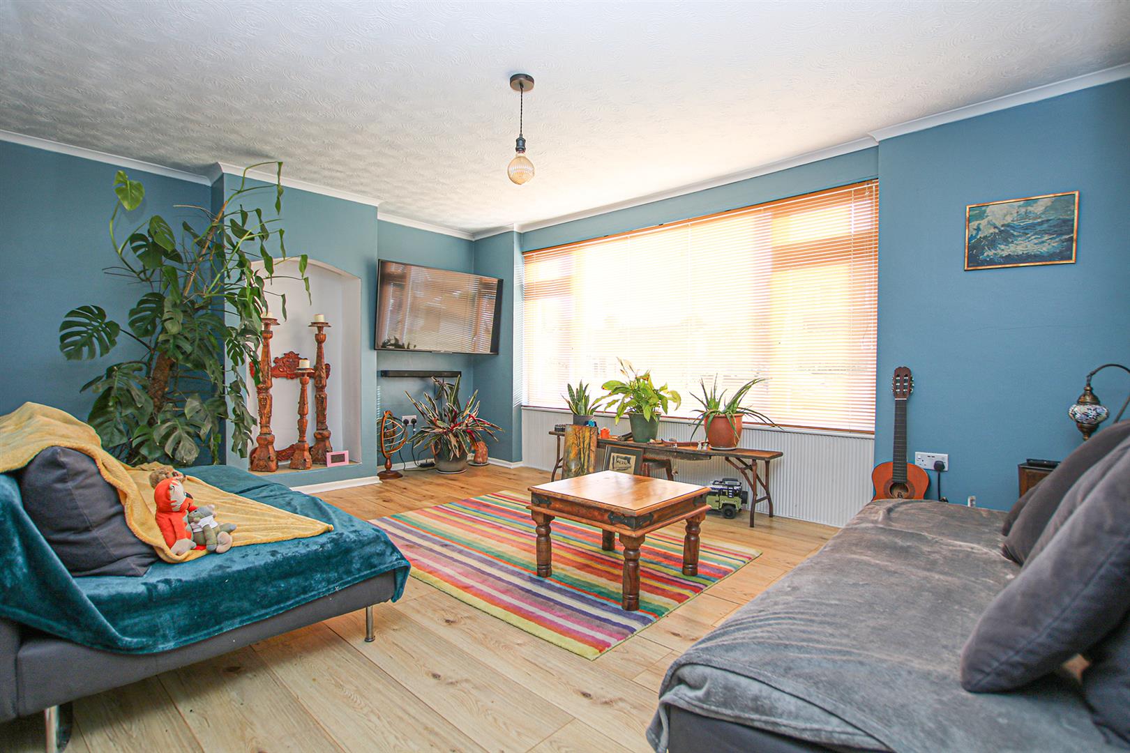 Spacious sitting room with attractive fireplace alcove feature. Wooden flooring. Panelled heater. Large window to the front aspect. Door to entrance hall.