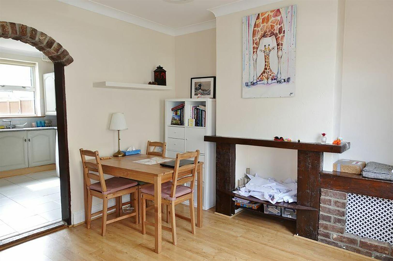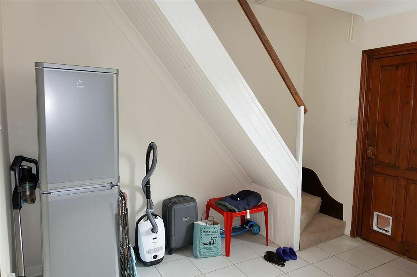 Fitted with a range of of matching eye and base level storage units with work top surfaces over. Stainless steel sink and drainer with mixer tap over. Integrated oven, inset 4 ring electric hob with extract over. Cupboard housing boiler. Tiled splashbacks. Radiator. Window to rear aspect.