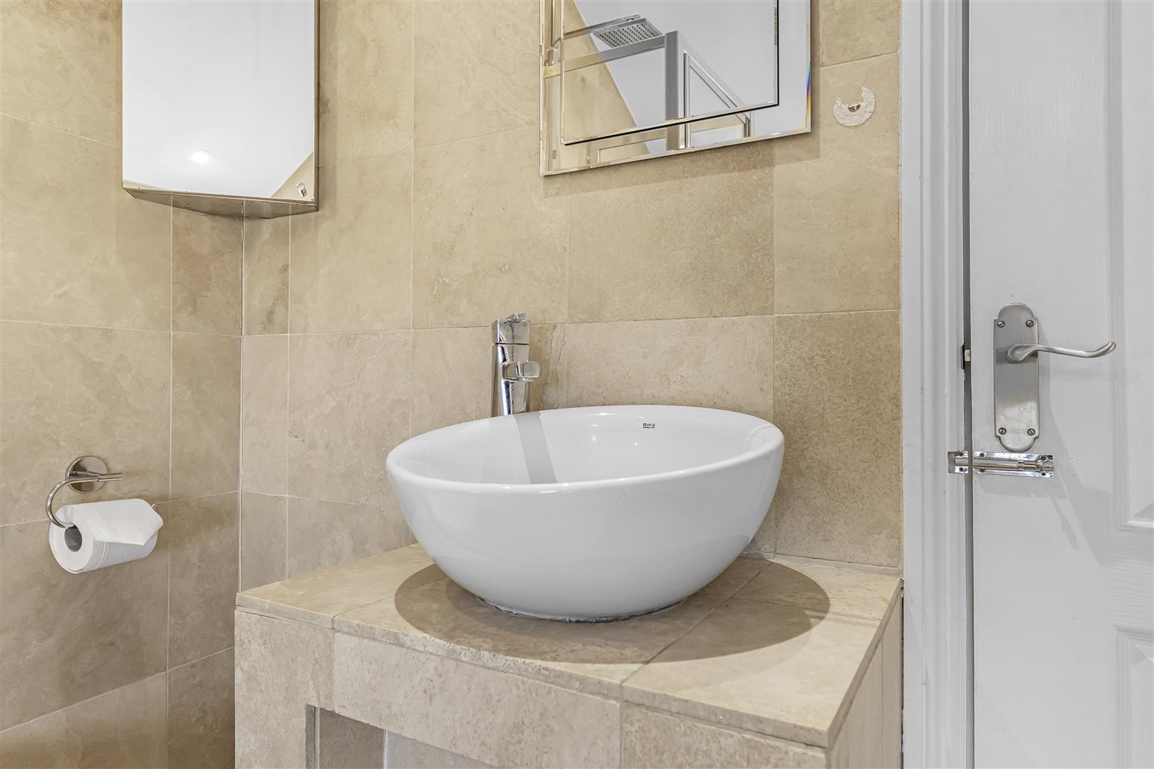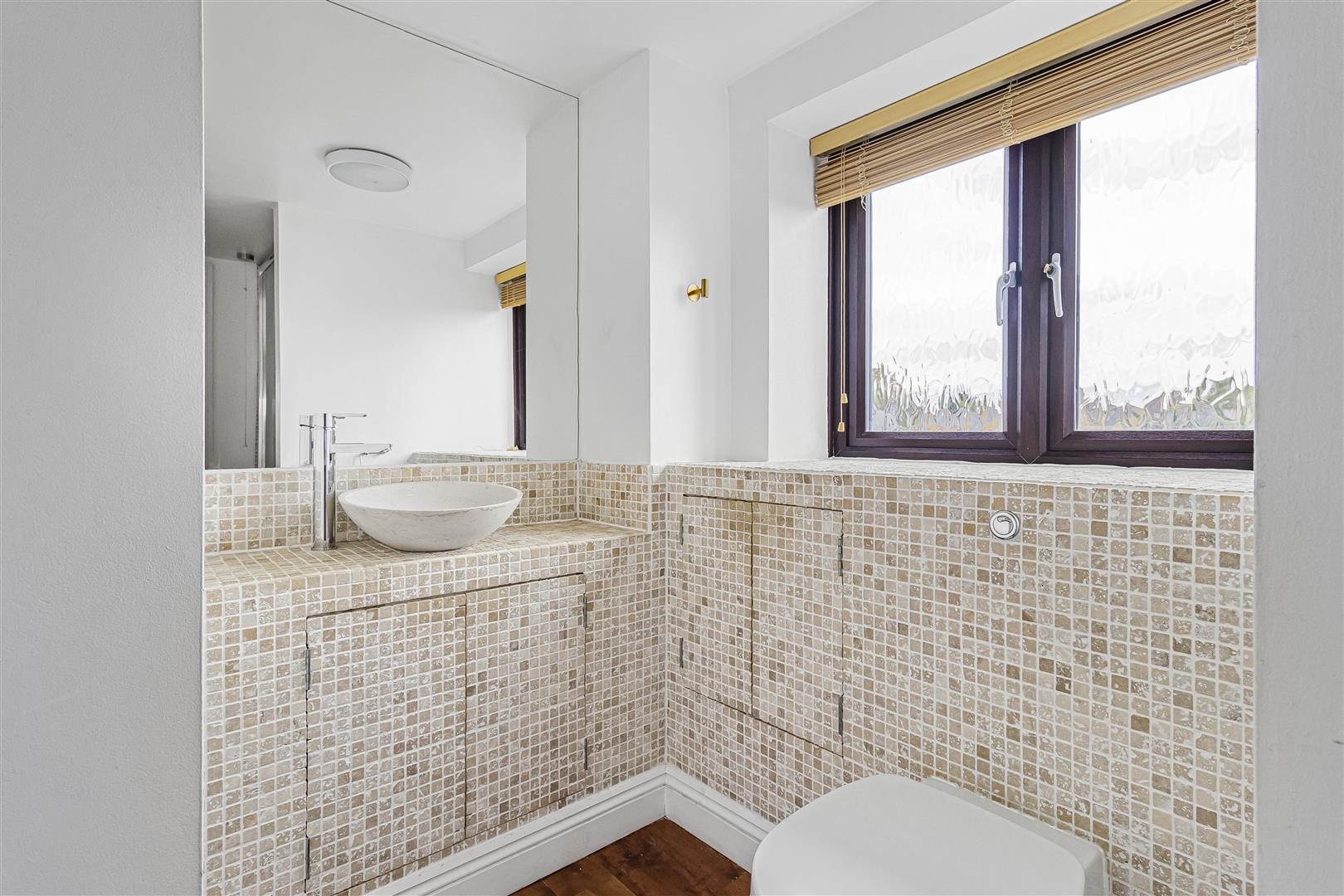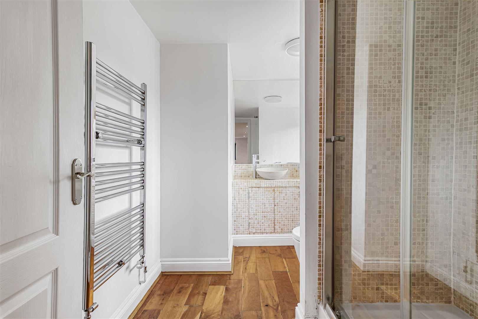 Contemporary white suite comprising low level, concealed cistern, W.C., tiled counter top with bowl hand basin with free standing mixer tap over and walk-in shower cubicle with wall mounted shower. Attractively tiled to wet areas. Exposed wooden flooring. Ladder radiator. Obscured window. Door leading to the Master bedroom.