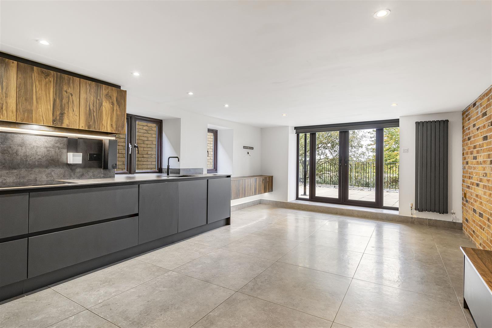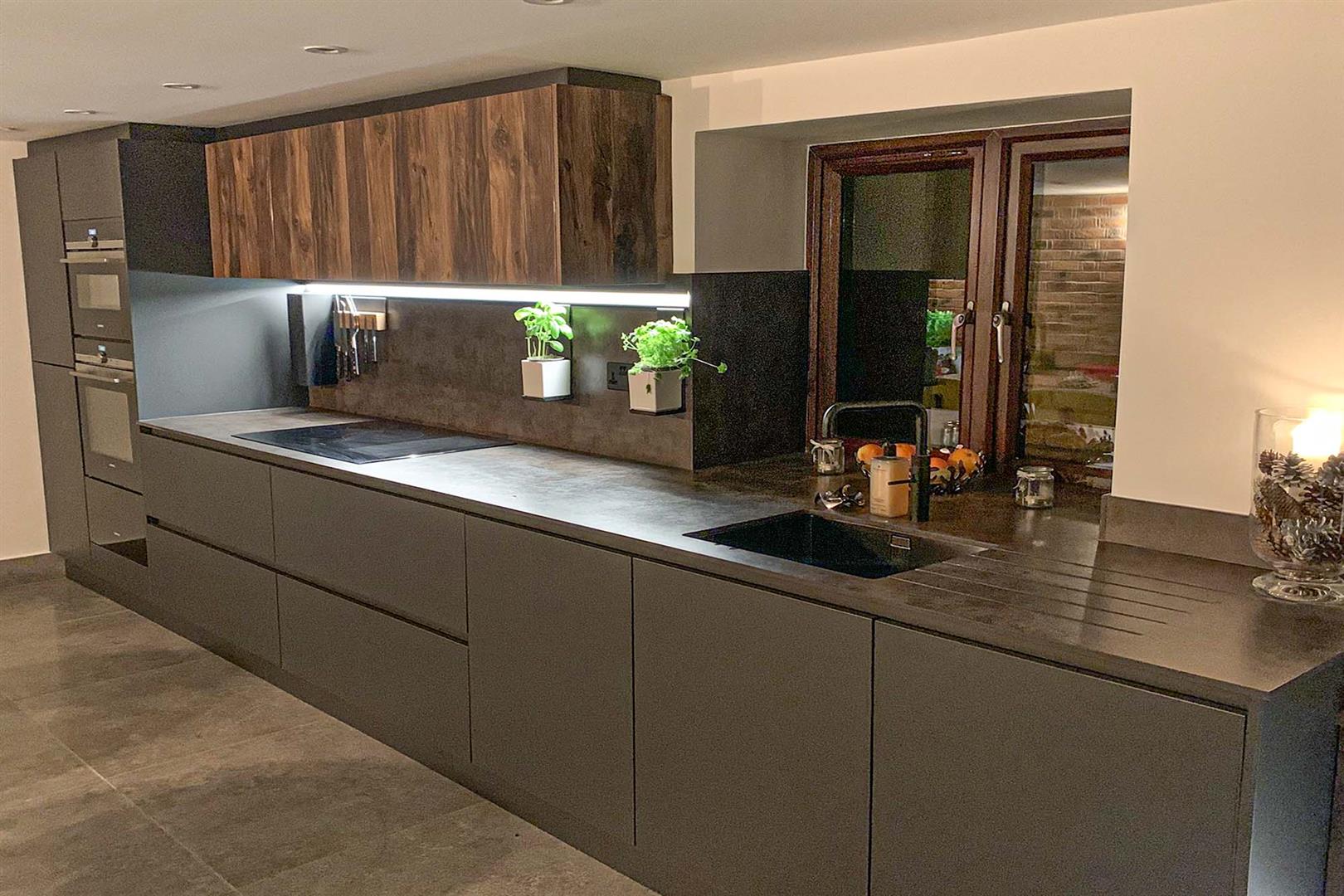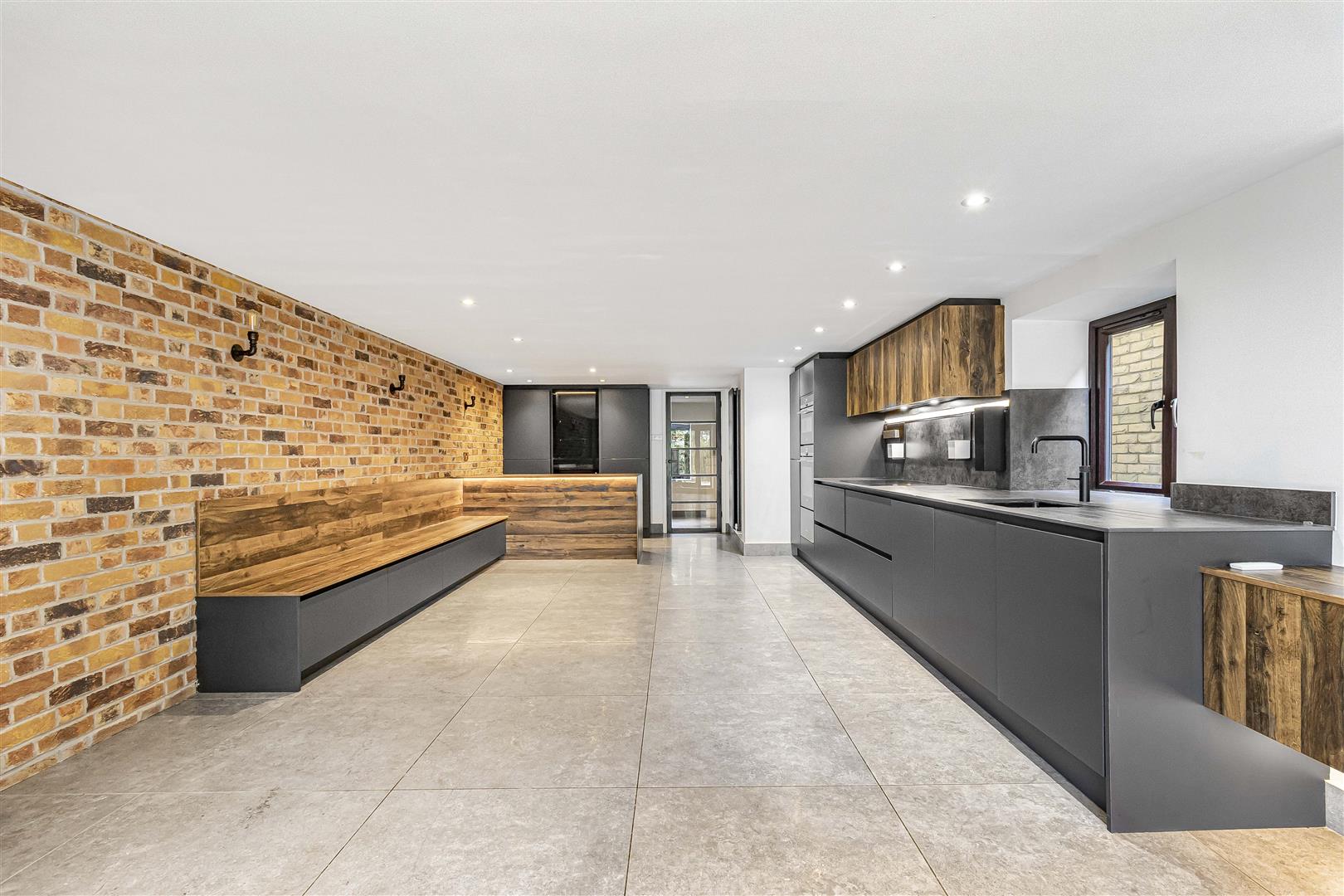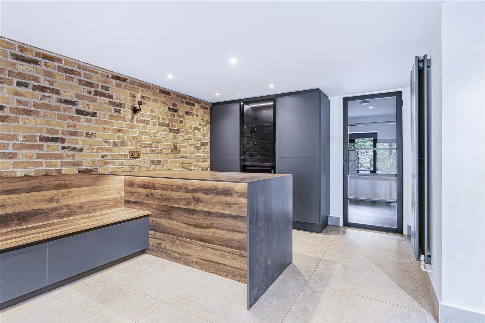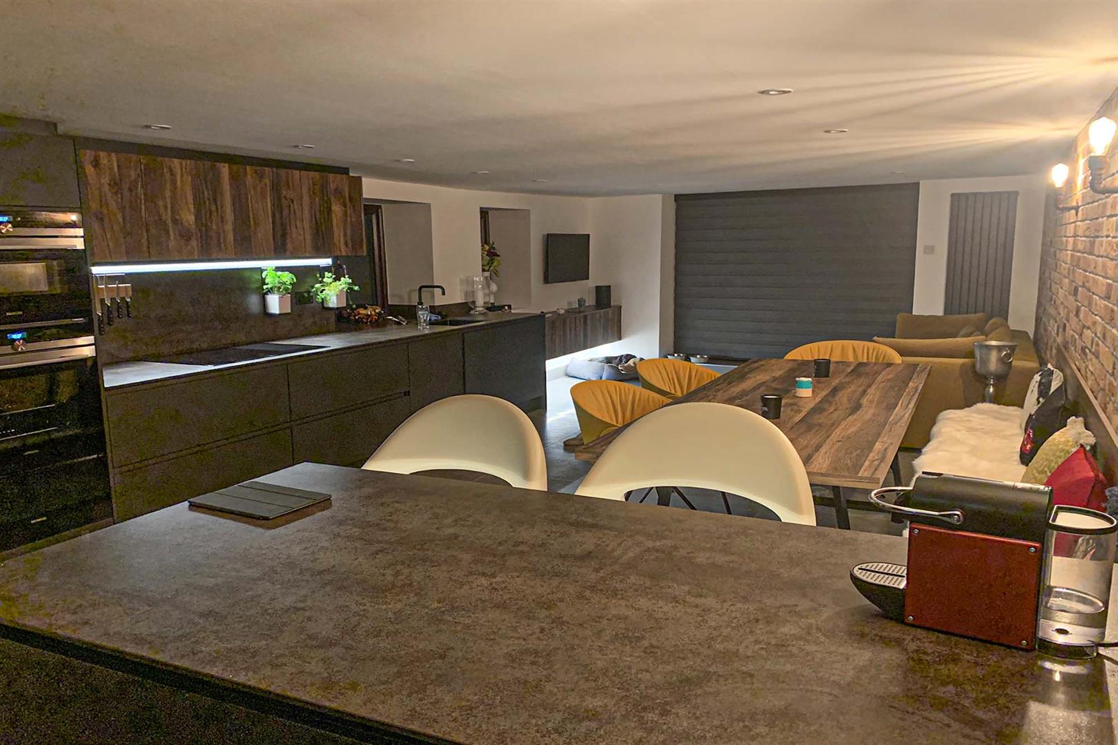 Stunning, contemporary kitchen/dining room with a range of fitted Zola-Matte Graphite & Schuller Moderna Chalet Oak cupboards and storage drawers with Neolith Iron Copper Solid Sintered Stone work surfaces. Inset sink and drainer with Quooker Fusion 3 in 1 hot/cold & boiling matt black tap over. Inset Siemens Flex induction hob with extractor over. Integrated Siemens double oven and combi microwave and warming drawer. Integrated fridge/freezer, dishwasher and washing machine. Integrated dual zone wine cooler. Built-in, matching pennisula, incorporating seating bench with storage under, with concealed LED lighting. Floating unit in Schuller Moderna Chalet Oak with concealed LED lighting. Attractive exposed brick feature wall. Porcelain tiling throughout. Vertical radiator. Dual windows to the side aspect. French doors leading to the rear patio area. Remote control blinds. Glass door leading to entrance hall.