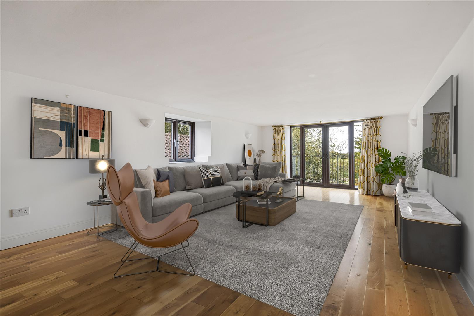Spacious, light living room with exposed cherrywood flooring. French doors lead to the balcony with beautiful views over the surrounding countryside. Window to the side aspect. Door to landing.