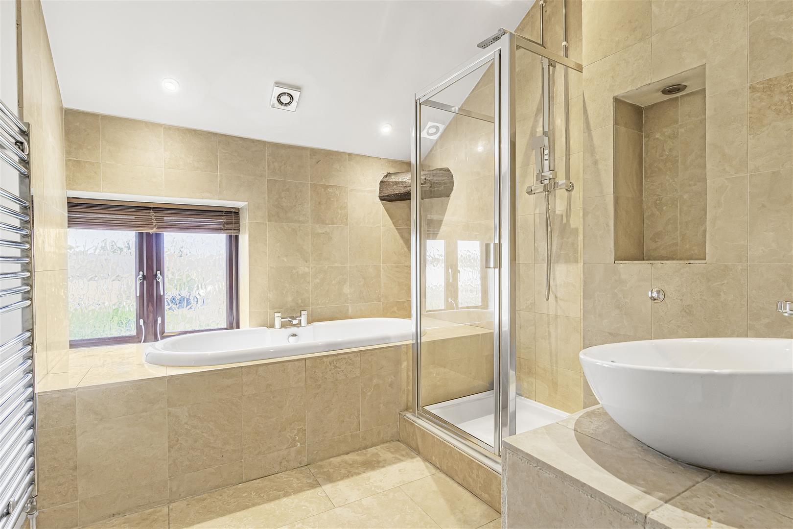 Contemporary bathroom with white suite comprising low level, concealed cistern, W.C., freestanding Roca bowl hand basin with mixer tap over, walk-in shower cubicle with wall mounted shower and recessed oval bath with mixer tap over. Travertine stone tiling throughout. Ladder radiator. Obscured window. Door to landing.