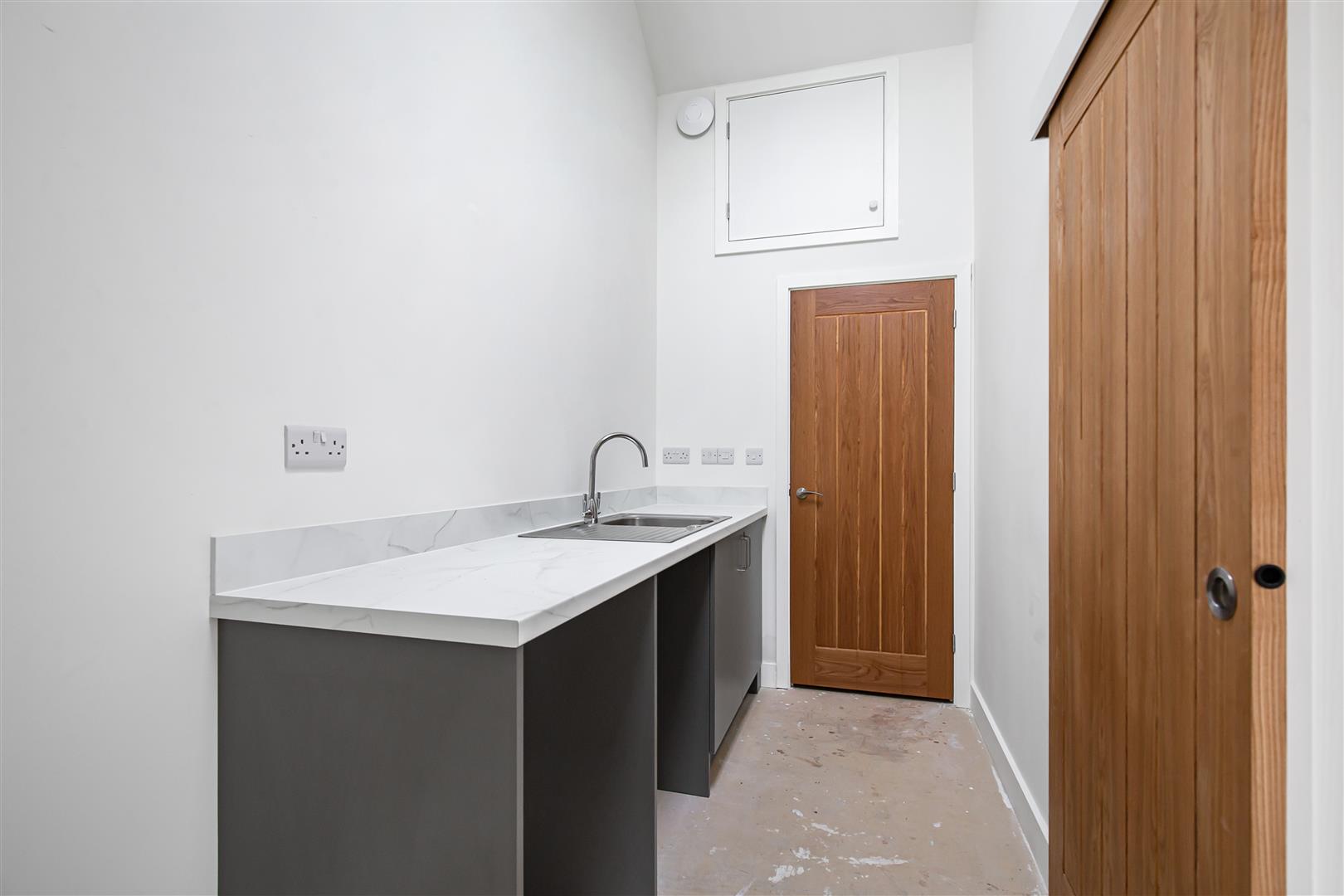 Fitted quartz counter work top with stainless steel sink and drainer with mixer tap over. Space and plumbing for undercounter washing machine. Fitted base storage cupboard. Underfloor heating. Velux window. Doors leading to the boiler cupboard and the rear garden. Sliding door leading to the kitchen/living/dining room.
