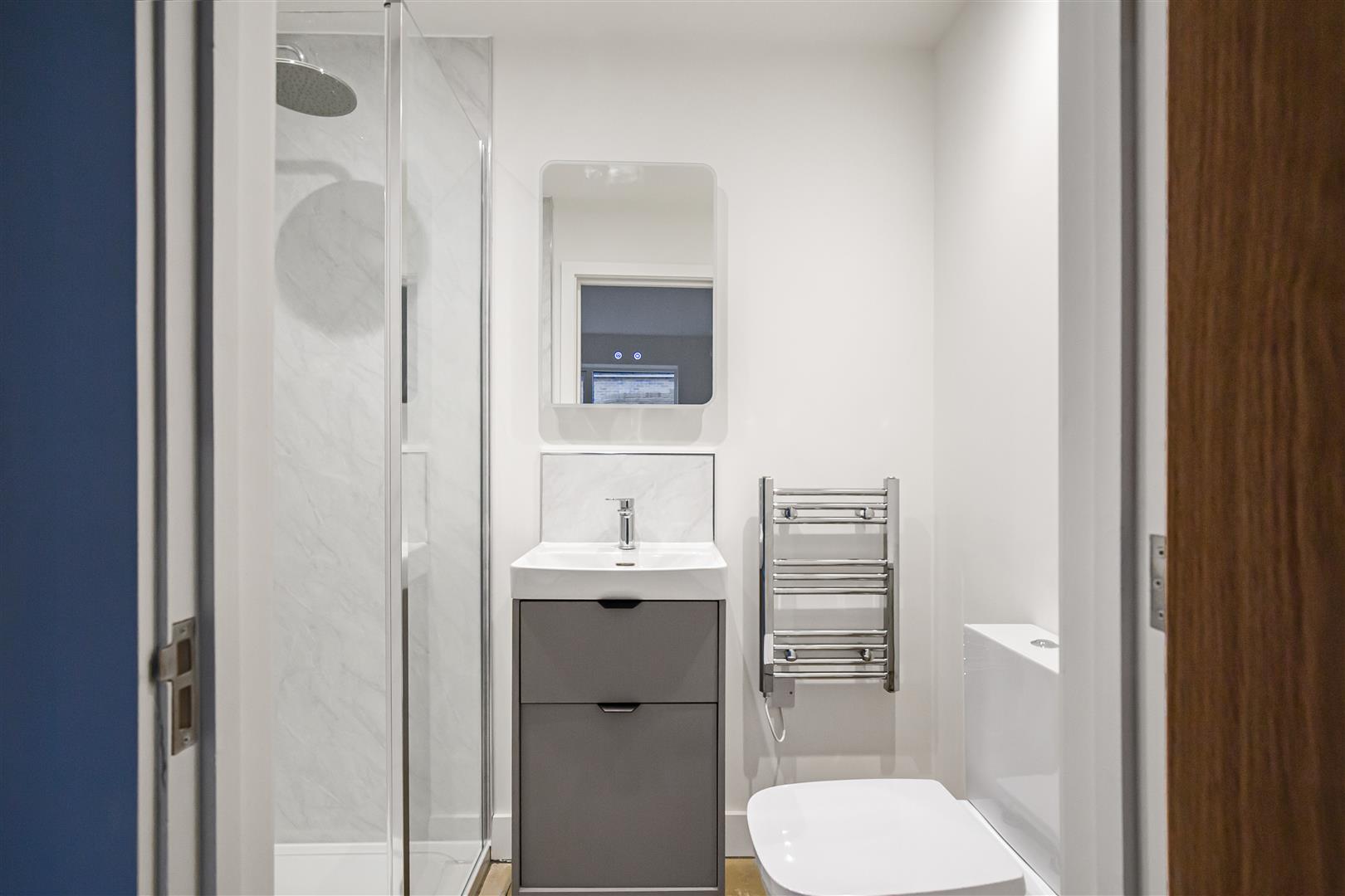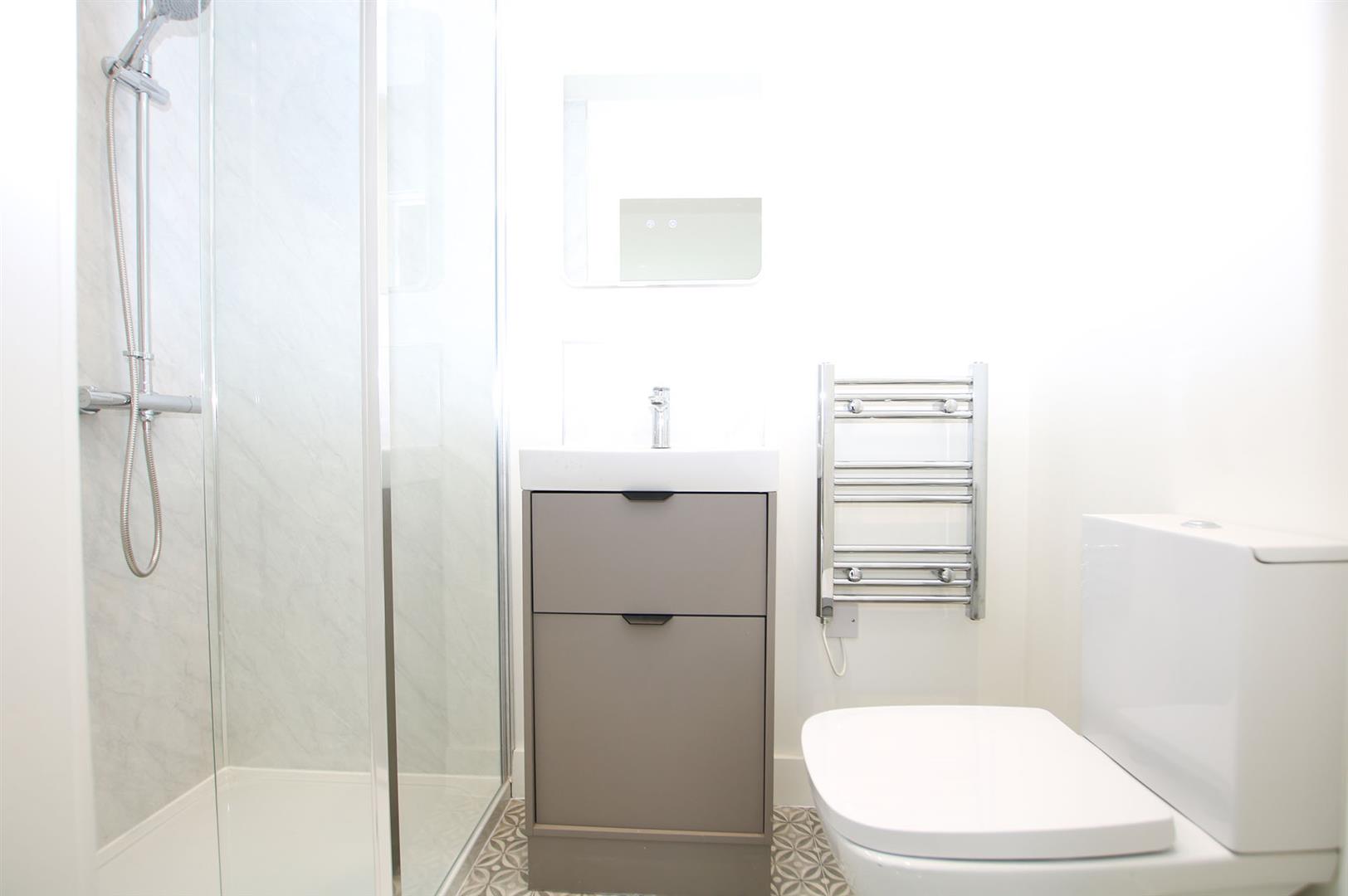Contemporary white suite comprising low level W.C., handbasin with mixer tap over and built-in storage under and generous walk-in shower. Attractively panelled to wet areas. Ladder radiator. Door leading to bedroom 1.