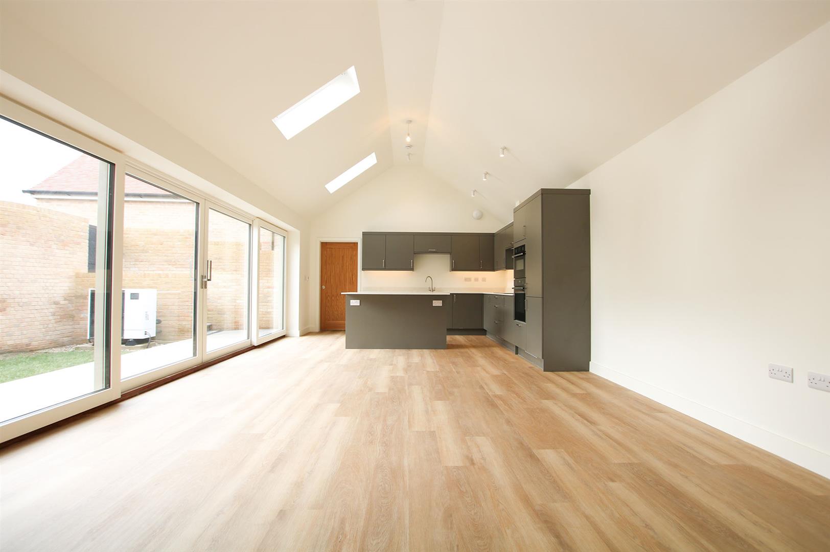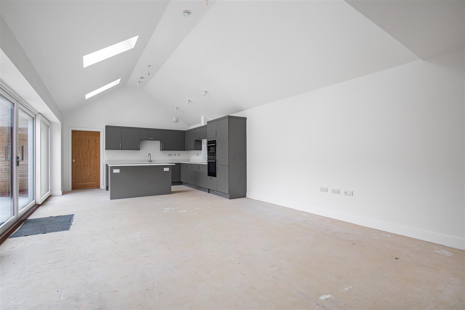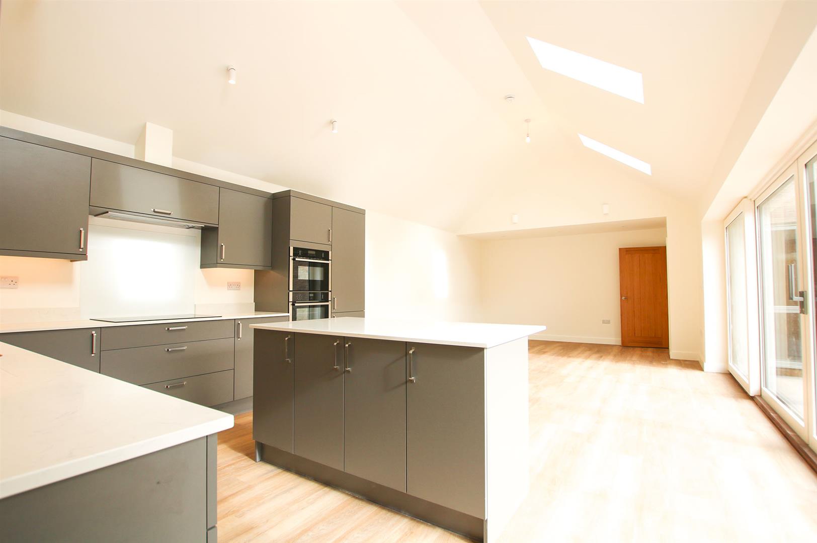Stunning contemporary kitchen with a range of eye and base level cupboards and storage drawers with quartz work top over. Inset sink with mixer tap over. Integrated eye level Neff oven and microwave. Inset induction hob with integrated extractor above. Integrated fridge/freezer and dishwasher. Matching kitchen island with storage cupboards under and incorporating breakfast bar seating. Triple velux windows. Triple glazed, double sliding doors leading to the patio area and garden. Underfloor heating. Sliding door leading to the utility room. Door leading to the entrance hall. Spacious living/dining area providing ideal open plan, family living.