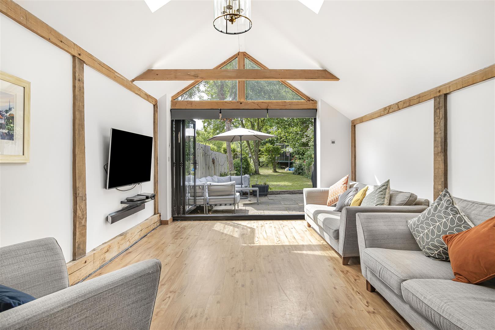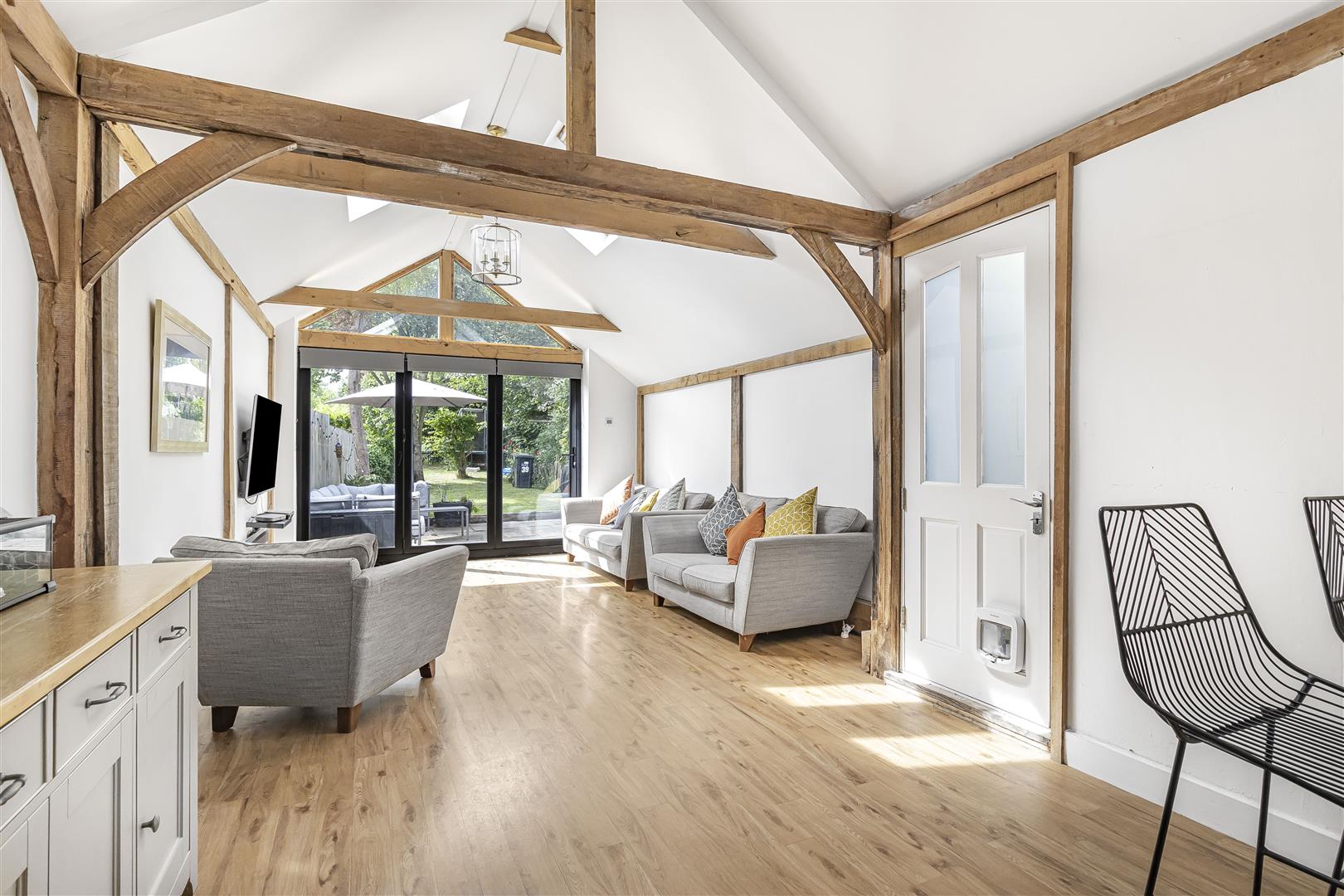 Stunning living/family room with LVT wood flooring throughout. Vaulted ceiling with exposed oak beams. Velux windows. Bi-folding doors leading to rear patio area. Half glazed door to side. Opening to kitchen.