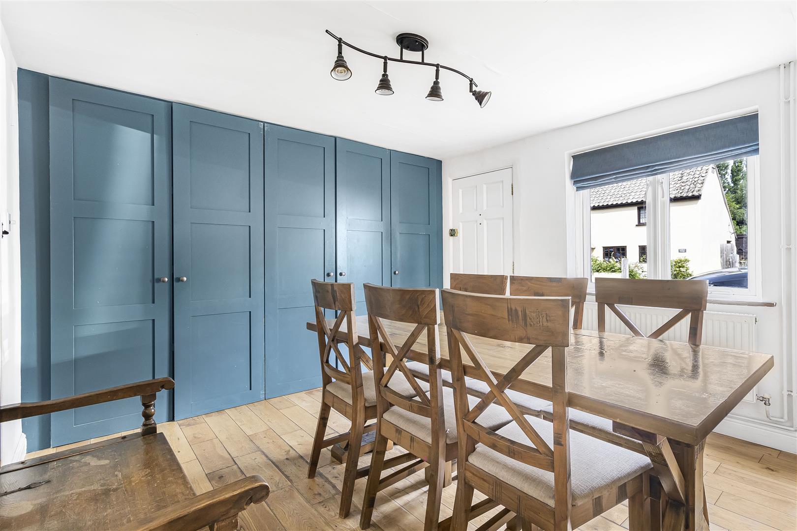 Charming dining room with feature fireplace with exposed brick surround and stone hearth. Alcove shelving to either side. Engineered wood flooring. Window to the front aspect. Bespoke built-in storage cupboards. Radiator. Doors leading to front and kitchen.