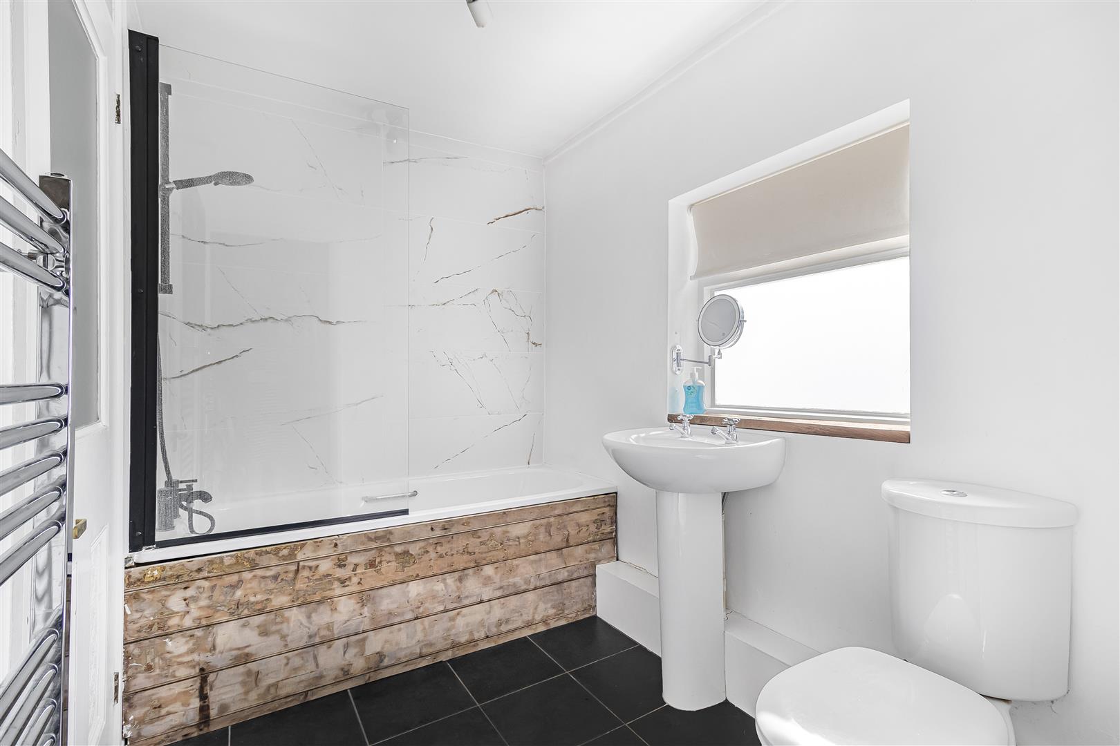 Contemporary white suite comprising low level W.C., pedestal hand basin and attractively panelled bath with mixer tap and wall mounted shower over. Attractively tiled. Ladder radiator. Obscured window. Tiled flooring. Door to landing.
