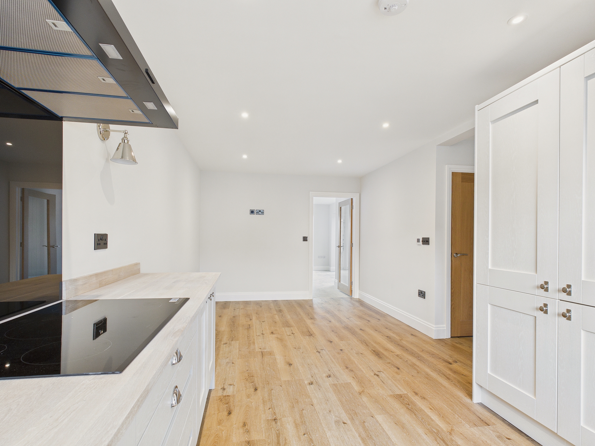 uPVC double glazed window to front, wall and base units under wooden worksurfaces, 1 1/2 ceramic sink drainer inset with mixer tap over, 5 ring induction hob inset to worksurface with extractor over and glass splashback, integral dishwasher, eye level double oven, integral fridge/freezer, LVT under floor heating, ceiling spotlights, integral bin store, glazed door to:-