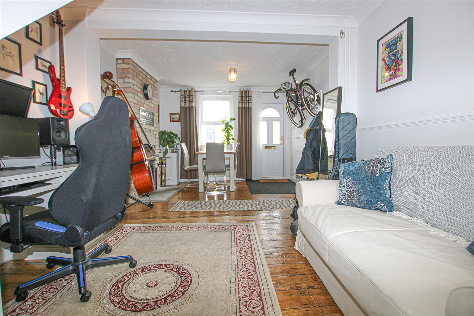 Spacious living/dining room with exposed wood flooring throughout. Attractive exposed brick fire place with stone hearth, fitted with a wood burner stove. Dual aspect windows. Radiators. Door leading to the kitchen. Half glazed door leading to the front.