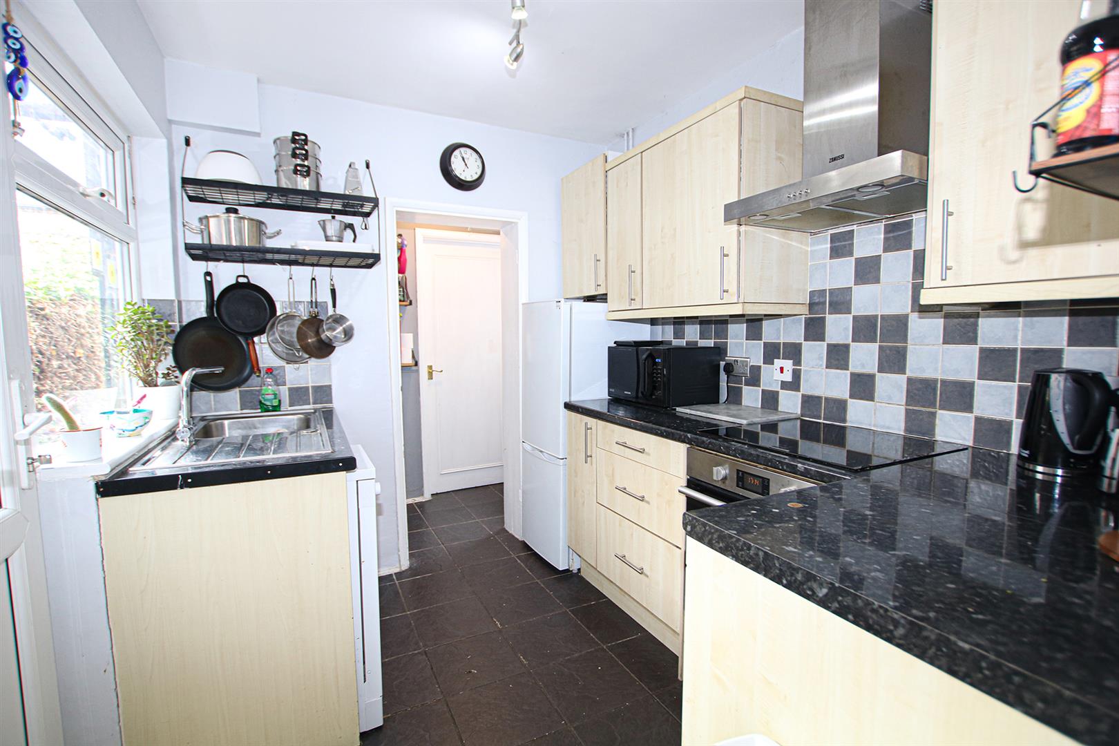 Modern fitted kitchen with a range of matching eye and base level cupboards with worktop over. Stainless steel sink and drainer with mixer tap over. Integrated oven with inset electric and stainless steel extractor above. Space for a fridge/freezer. Space and plumbing for dishwasher. Tiled splashbacks. Tiled flooring. Opening to inner hallway. Door to living/dining room. Window to the side aspect. Half glazed door to the rear garden.